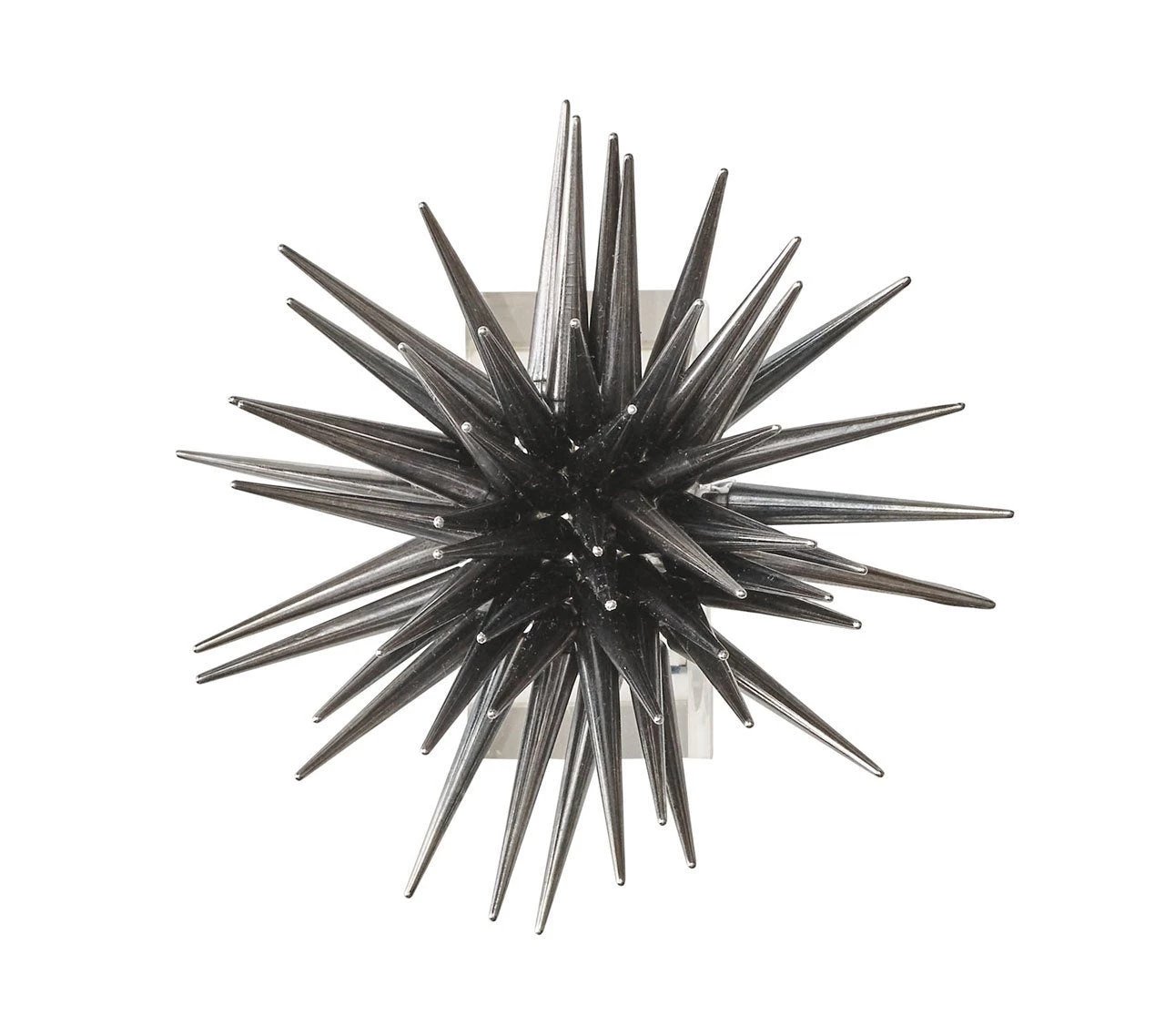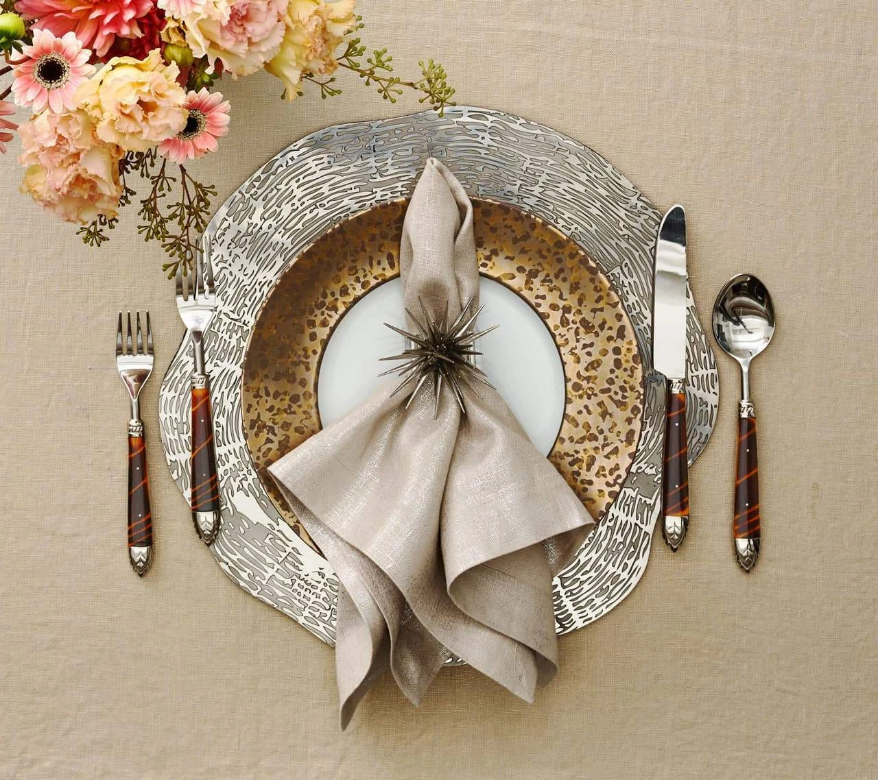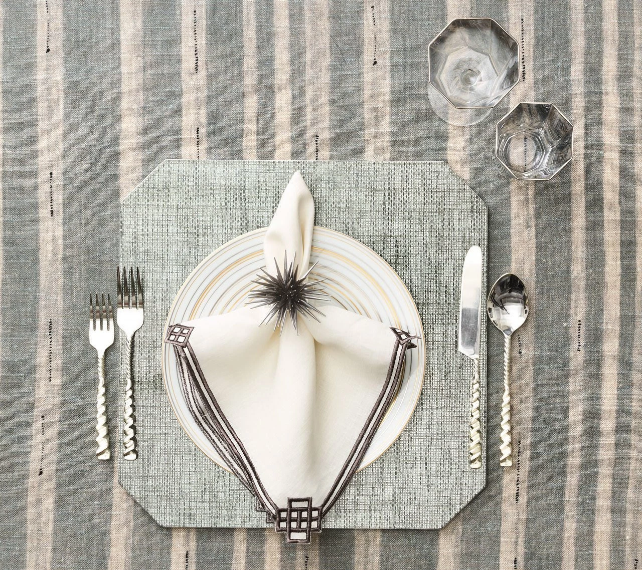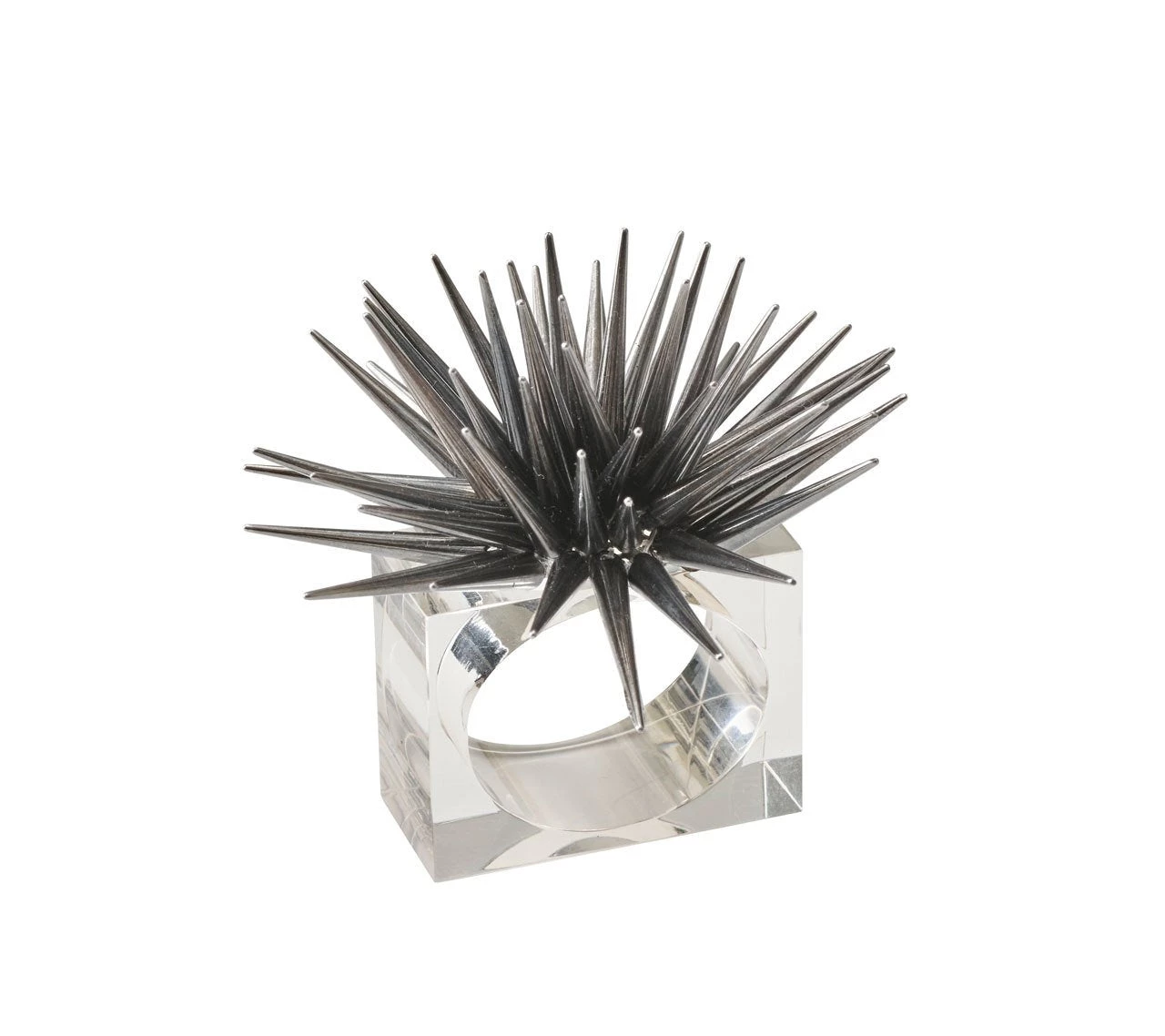 The mid-century inspired metallic Astrid Napkin Ring in gunmetal is a show-stopper. This beautiful metallic napkin ring features sea urchin-like spears in a deep gunmetal color. Set atop a square lucite ring, this versatile napkin ring works on any table setting.