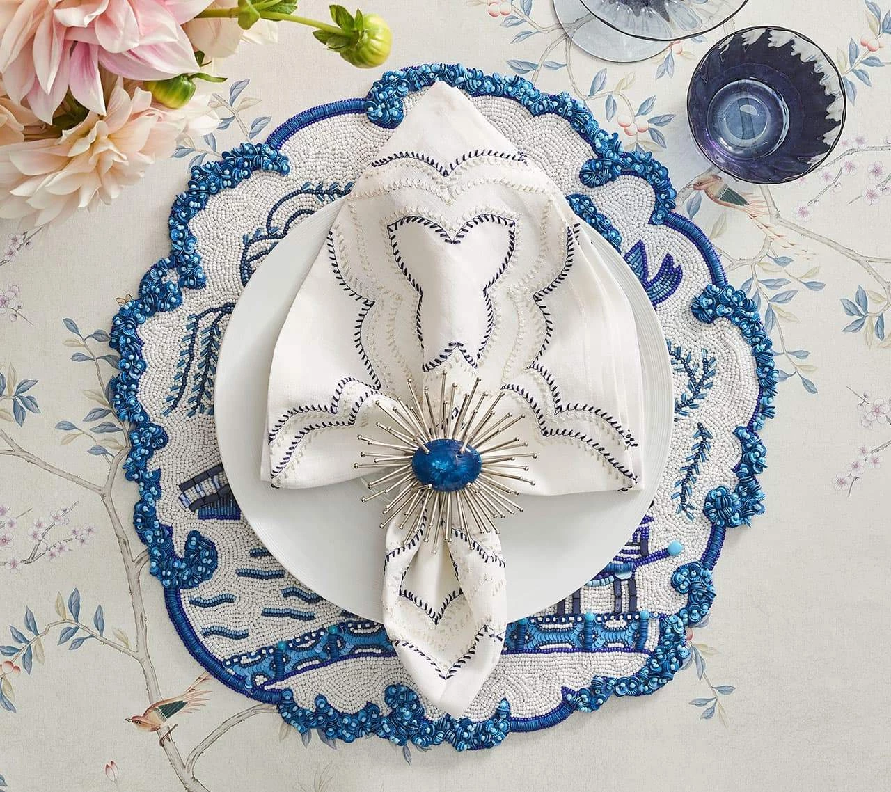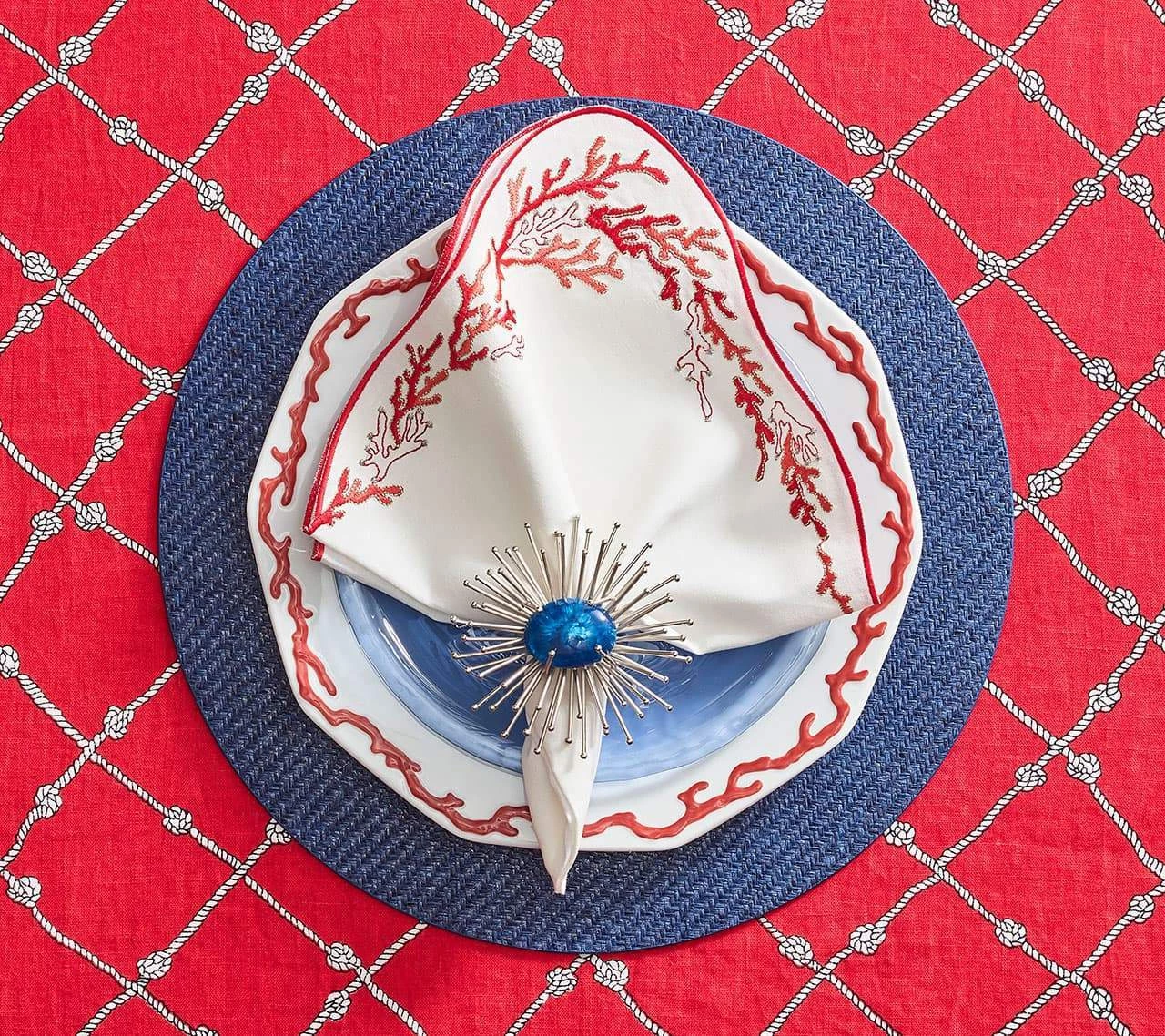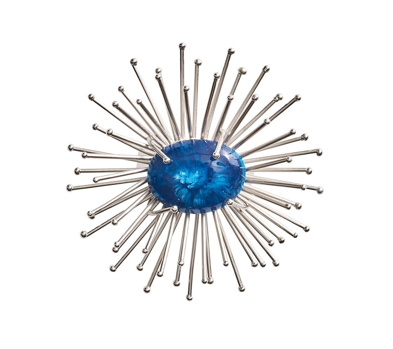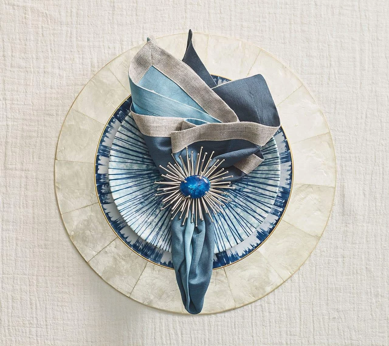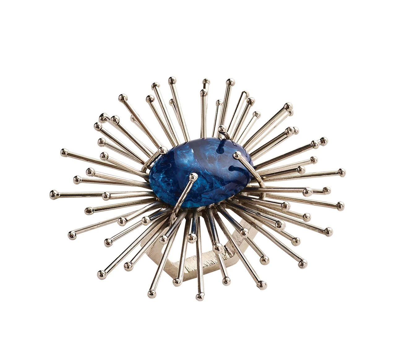 The handmade, silver Flare Napkin Ring is a metallic burst of energy. Each spoke of this silver napkin ring is meticulously welded and bent to create the unique shape. The silver napkin ring features hand-applied metallic paint and quartz and malachite replica center stones. Add a pop of zest to any table with this gold napkin ring.