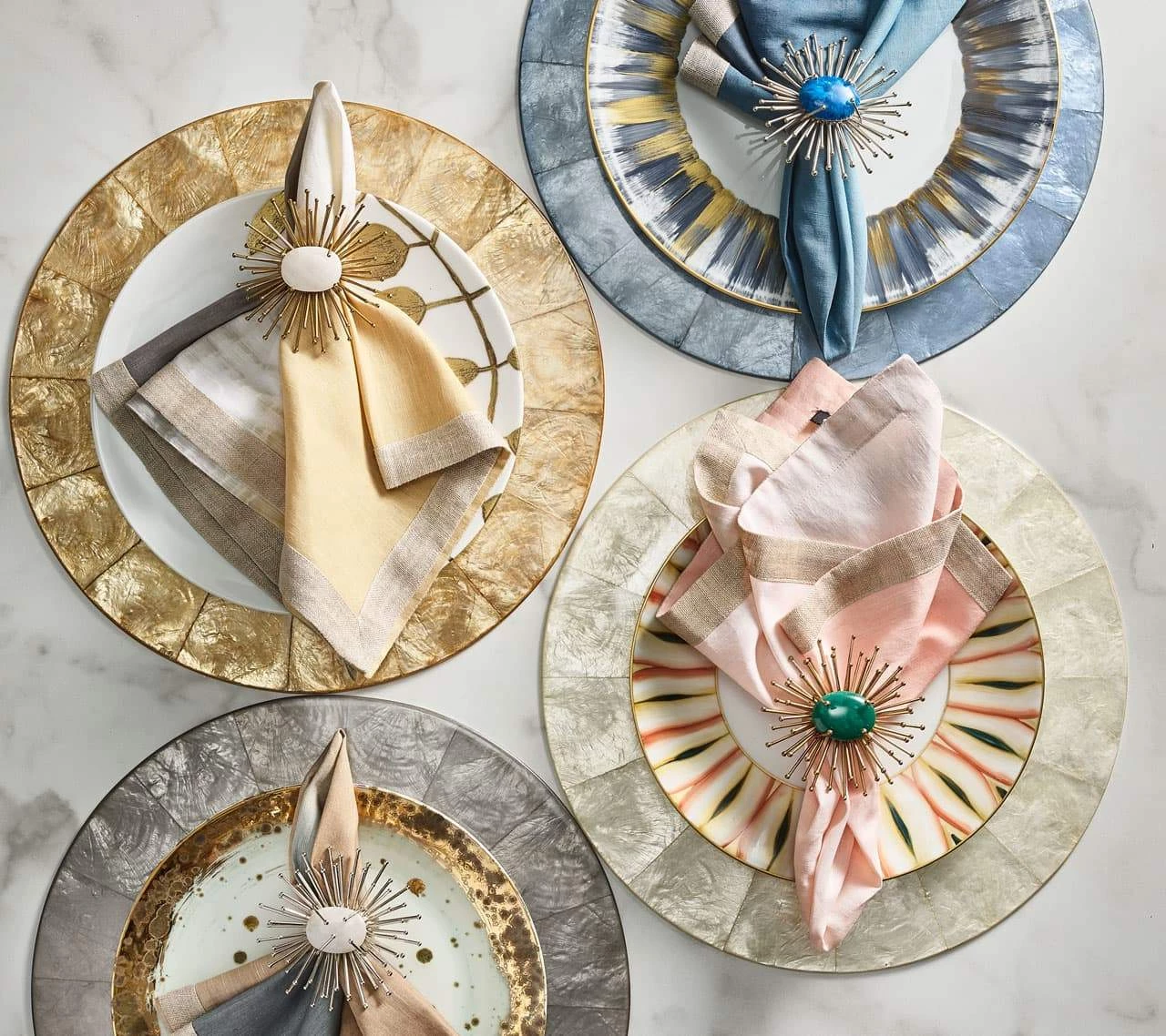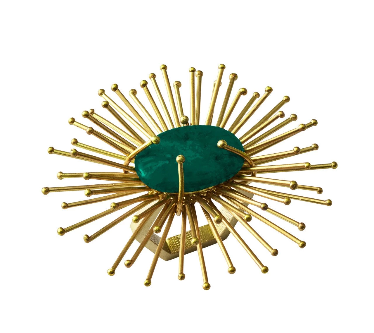 The handmade, brass Flare Napkin Ring is a metallic burst of energy. Each spoke of this gold napkin ring is meticulously welded and bent to create the unique shape. The brass napkin ring features hand-applied metallic paint and quartz and malachite replica center stones. Add a pop of zest to any table with this gold napkin ring.