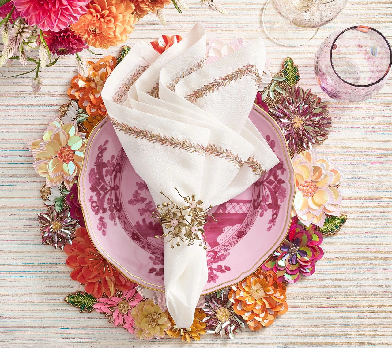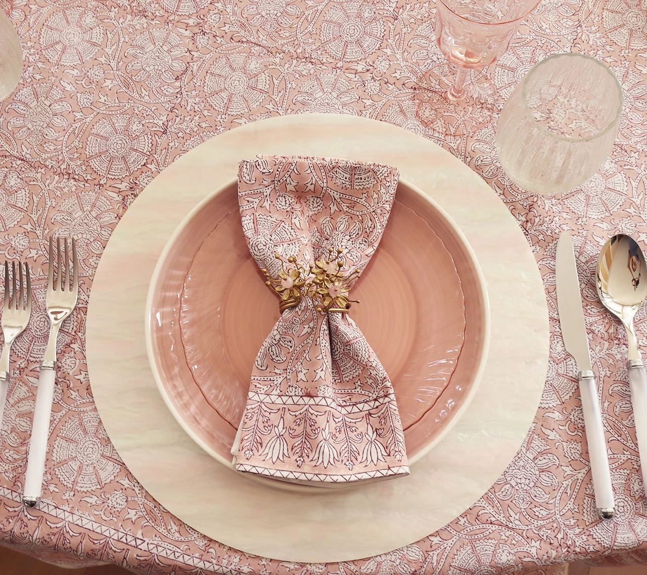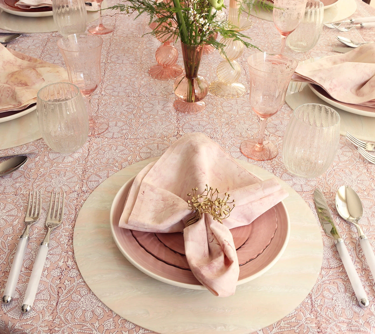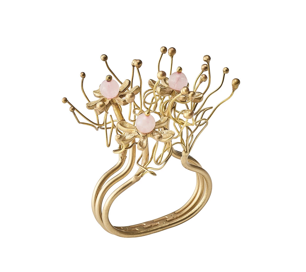 The brass Flora Napkin Ring has an organic yet refined oceanic feel. The hand-made brass napkin ring features rose quartz details growing and reaching from the base, like a plant. Due to the handmade nature, each piece will vary slightly.