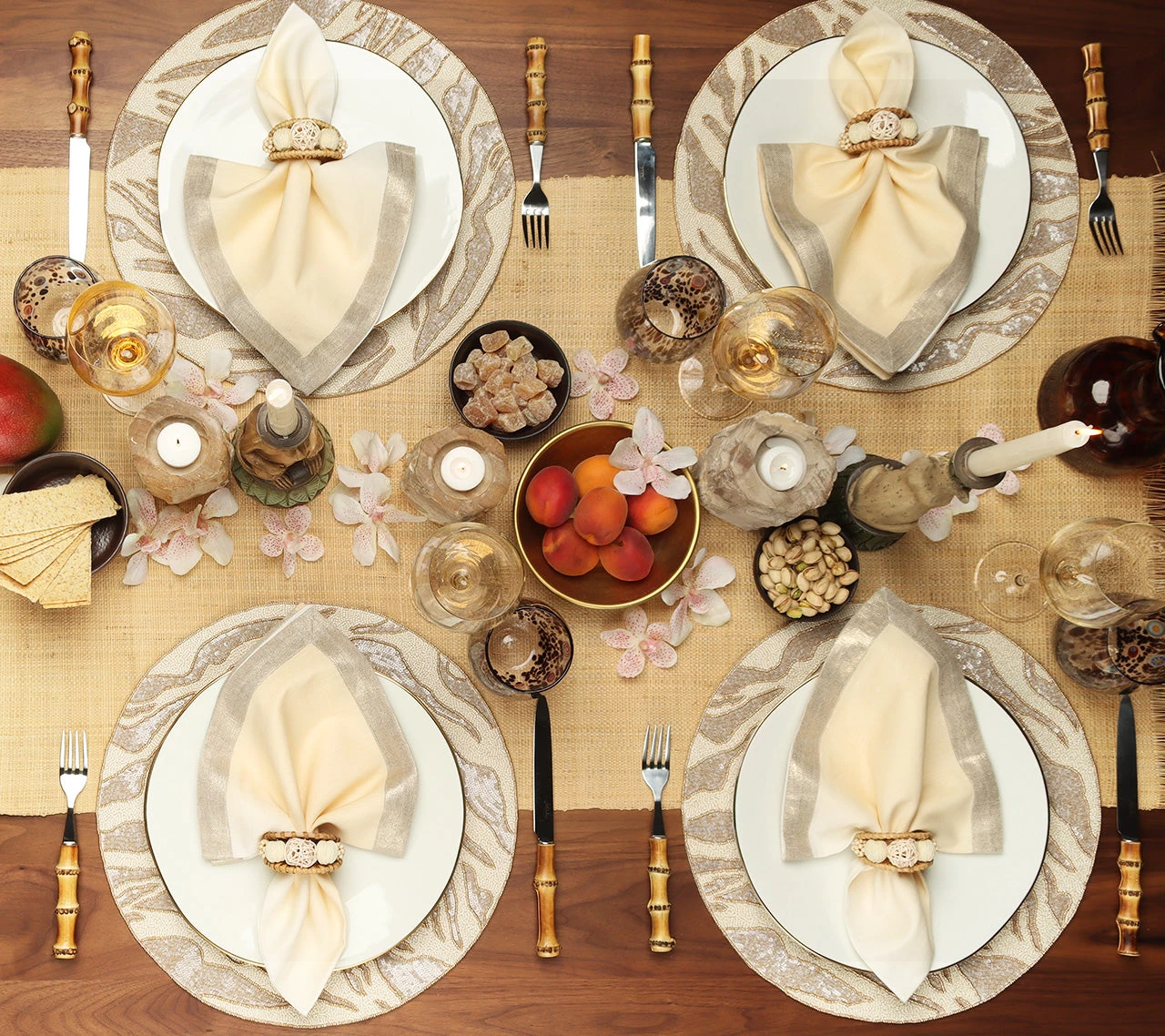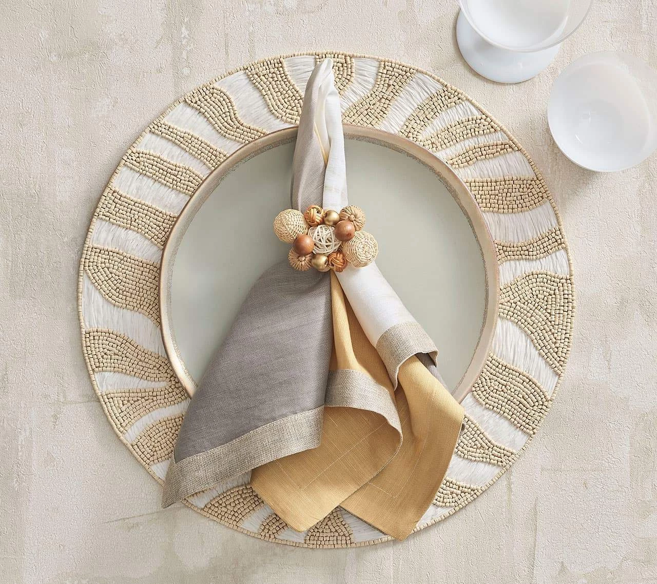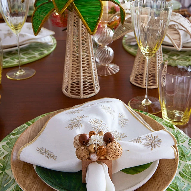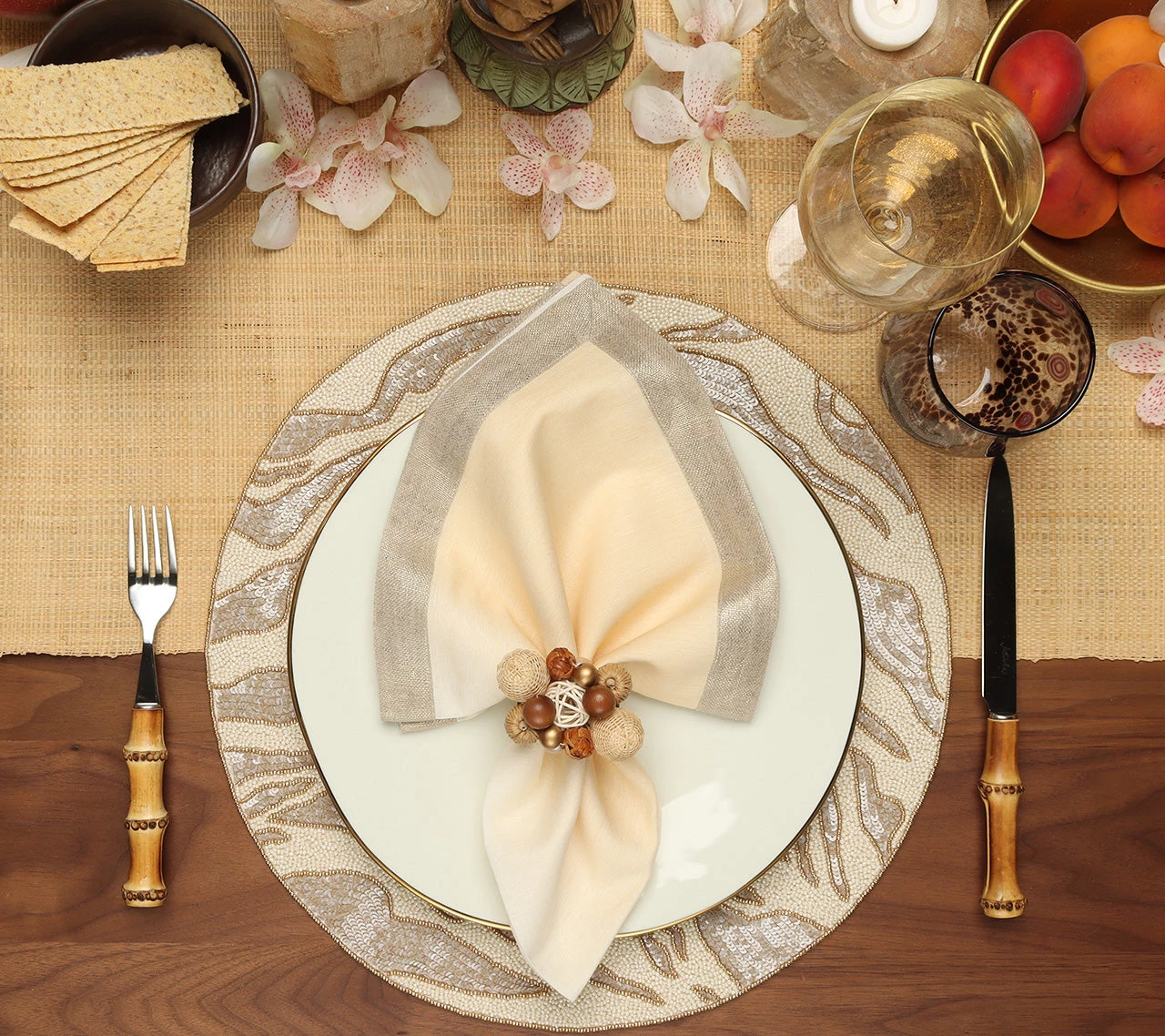 The textured Java Napkin Ring features mini woven baskets in natural colors and materials displayed in a cluster atop a wooden base. Seven different types of rattan and wooden beads are polished or woven by hand to create the bead-like baubles on this festive napkin ring. This exceptional napkin ring is hand-made using naturally occurring materials, variations are to be expected.
