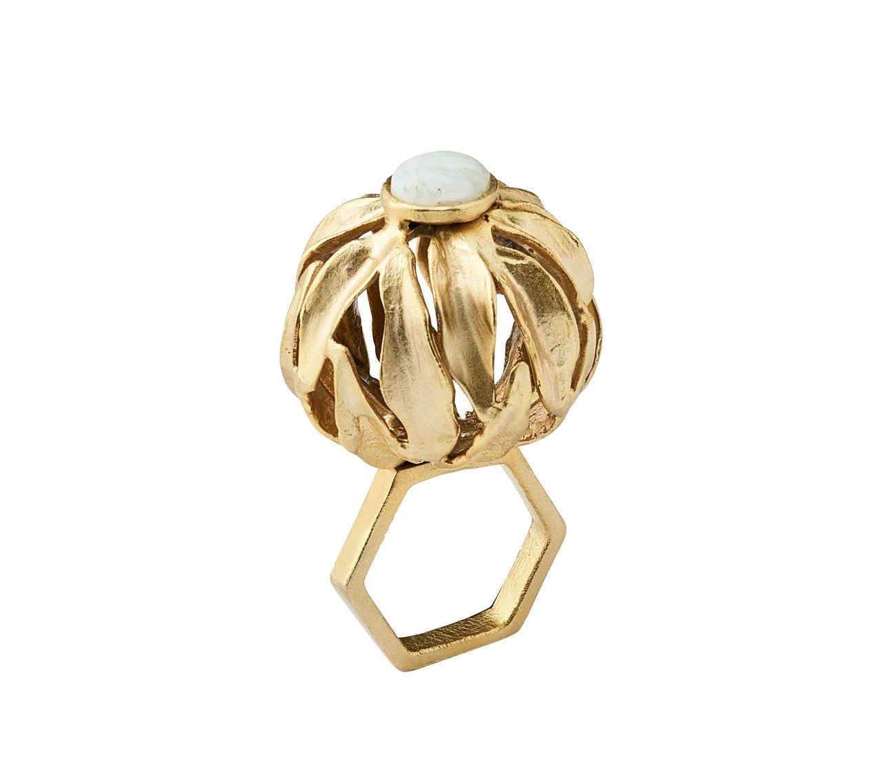 The vintage-inspired cast Orb Napkin Ring features a quartz stone atop a gold globe. Mimicking jewelry, this cast napkin ring adds a subtle elegance to any table. Dress up the quartz detail with a glamorous setting or add let the Orb Napkin Ring shine on its own.Â