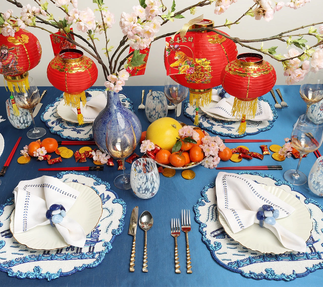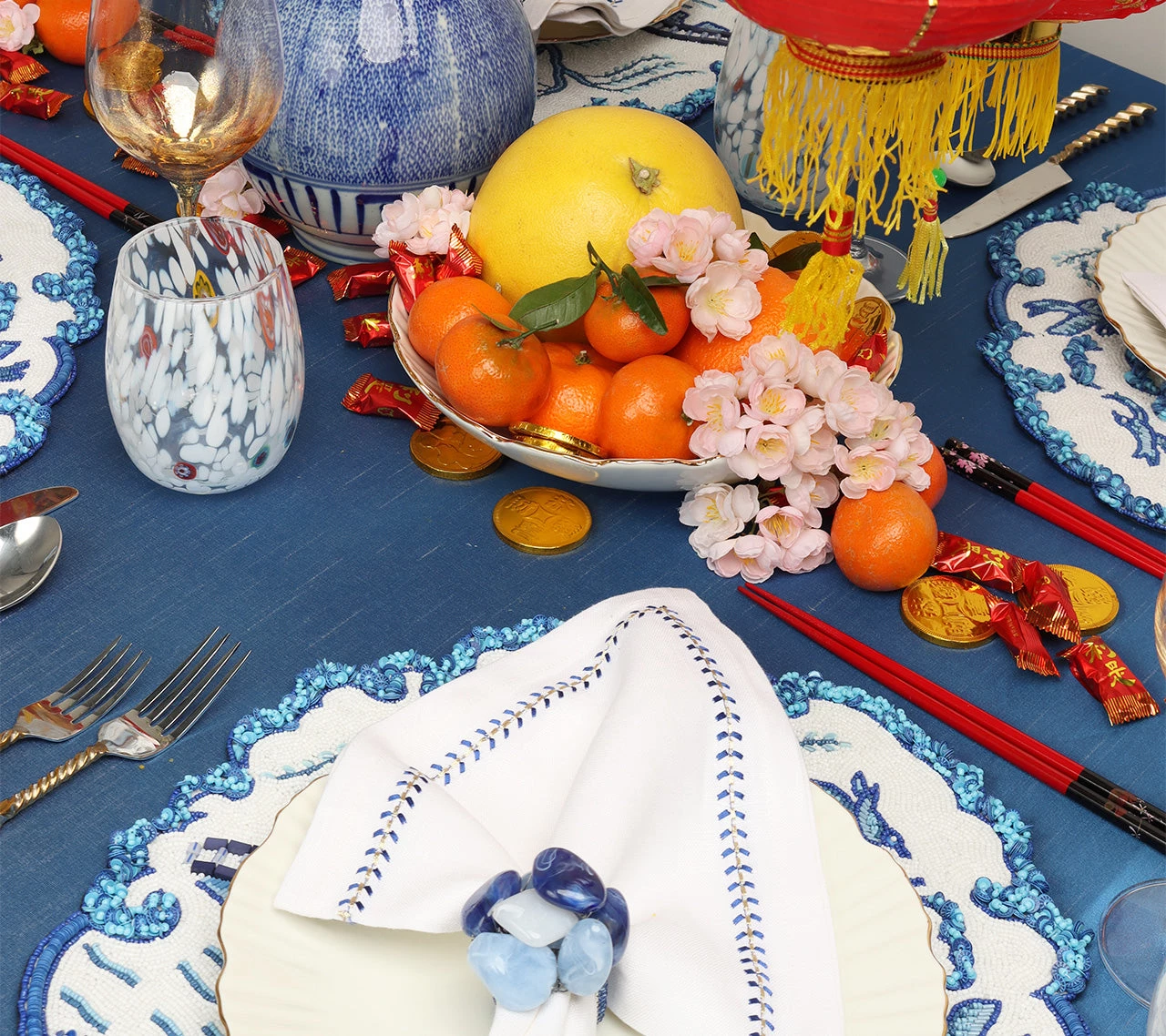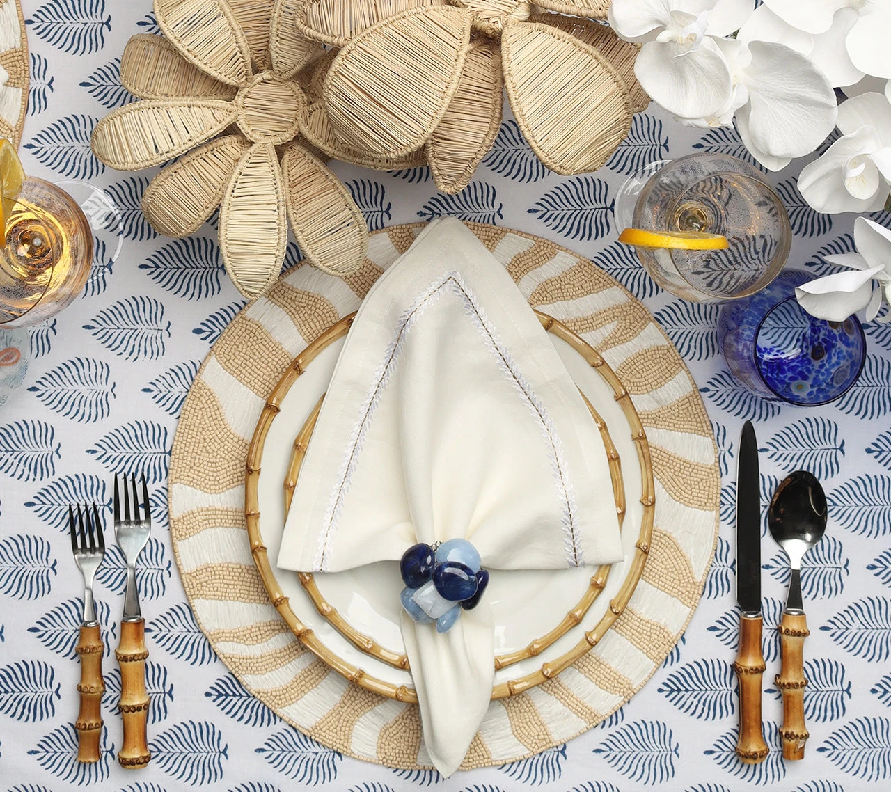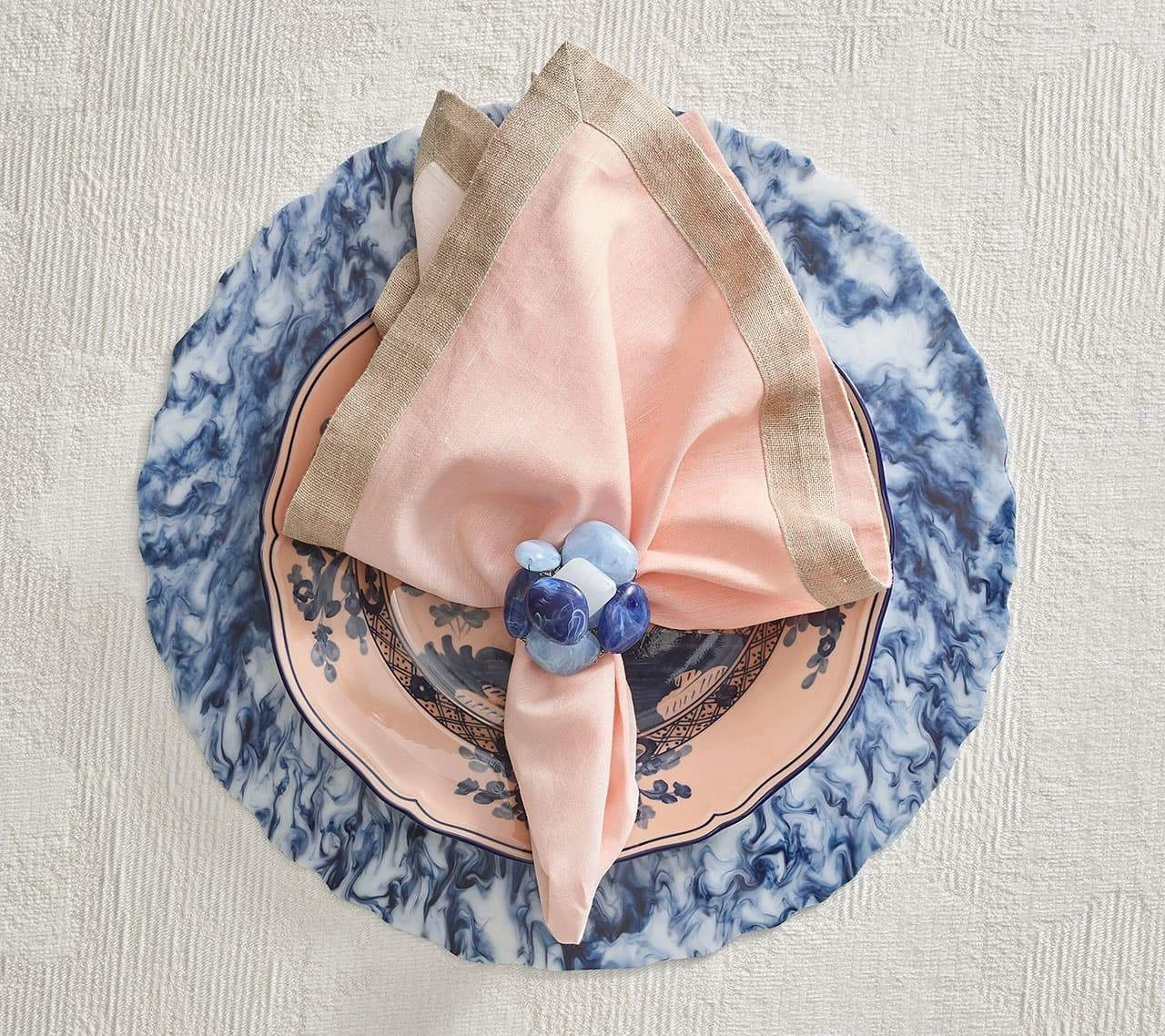 The Sea Stone Napkin Ring in navy features shades of blue resin stones set in clusters. These sea-inspired napkin rings are reminiscent of tumbled stones found upon the shore. Arranged at random, the stones are mounted on a beautifully beaded ring. These nautical napkin rings are the perfect addition to a bright and cheery table.
