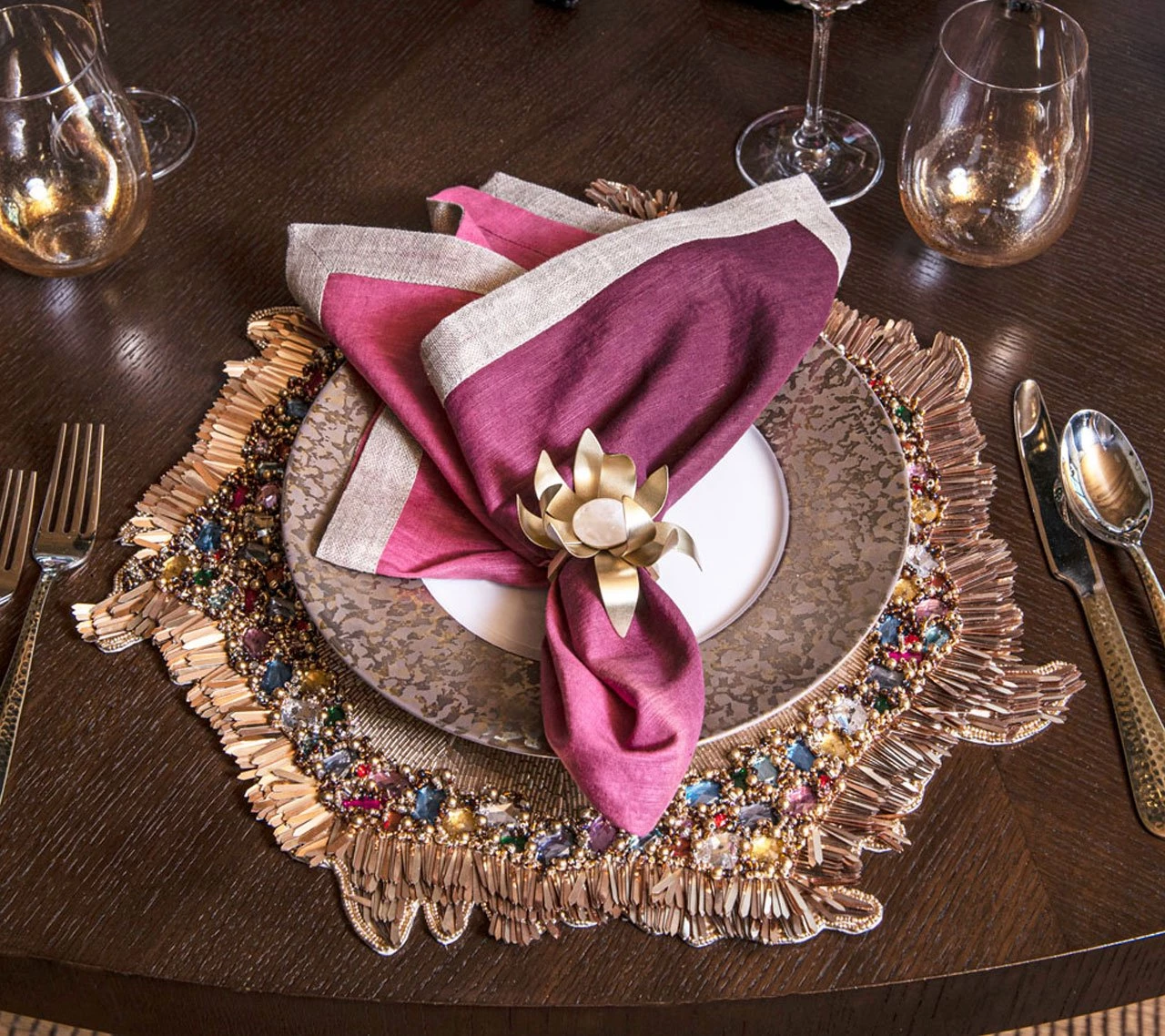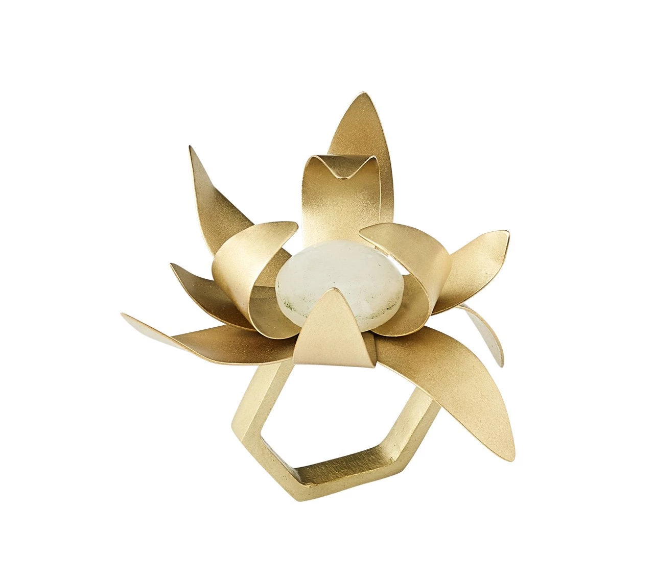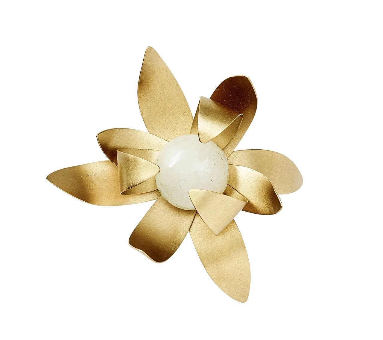 Inspired by the organic nature of sunflower petals, the Sunflower Napkin Ring features whimsical cast brass leaves surrounding a quartz center stone. The free-flowing brass petals create a sense of movement around the elegant crystal stone. An exquisite addition for a festive celebration any time of the year.