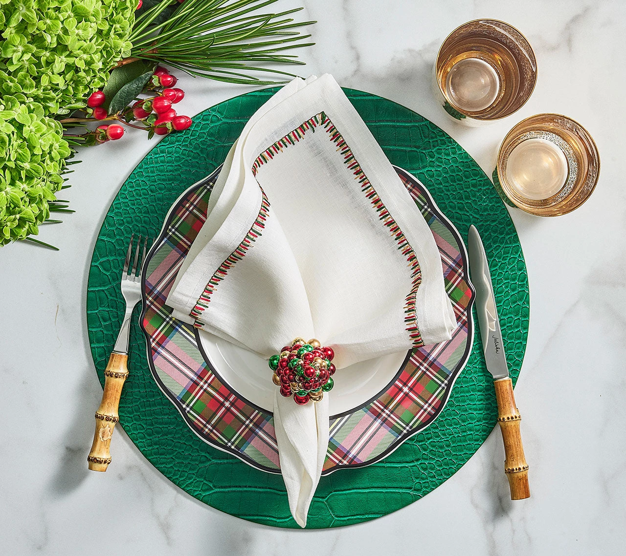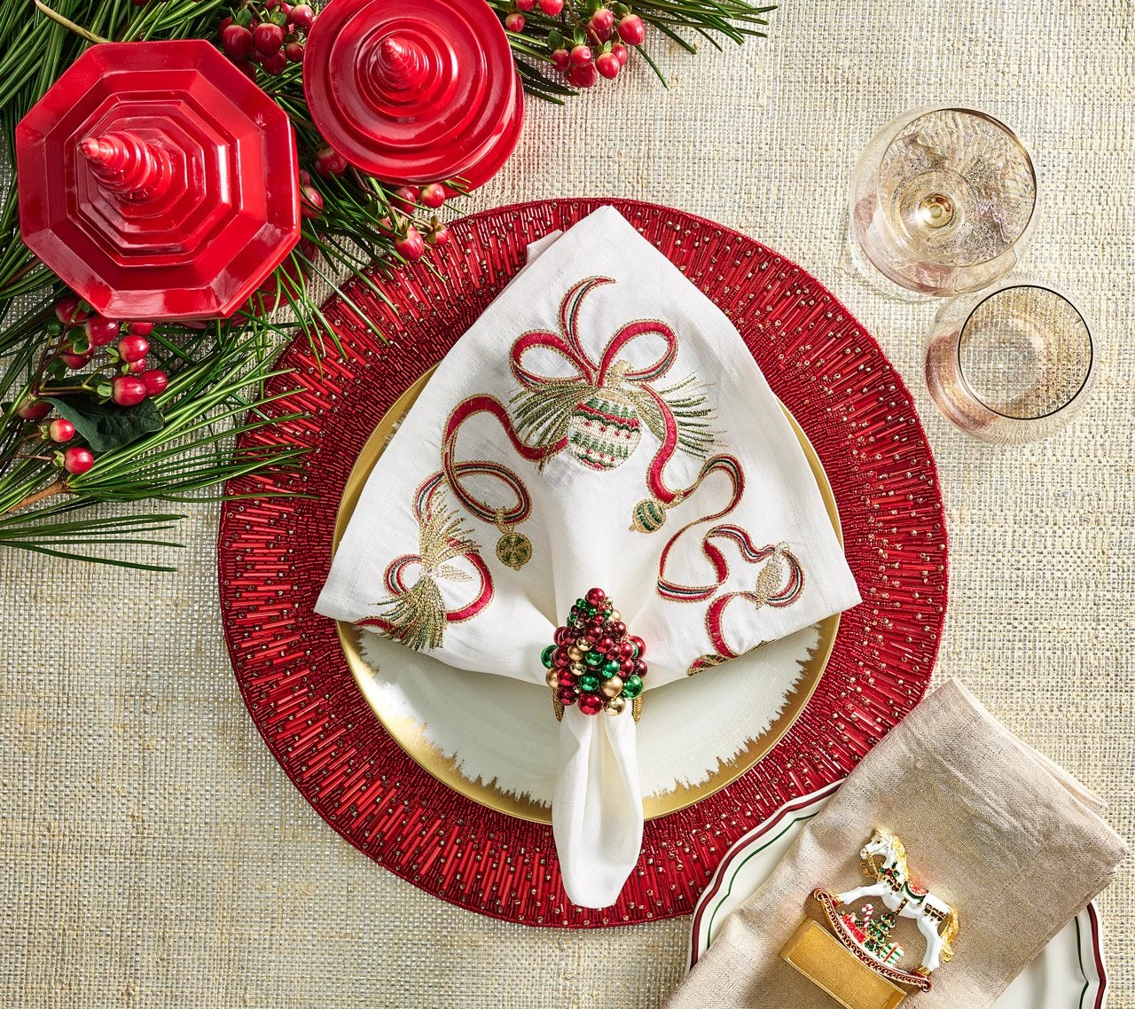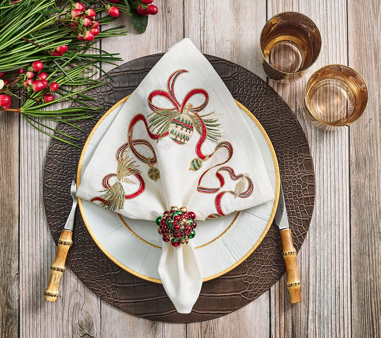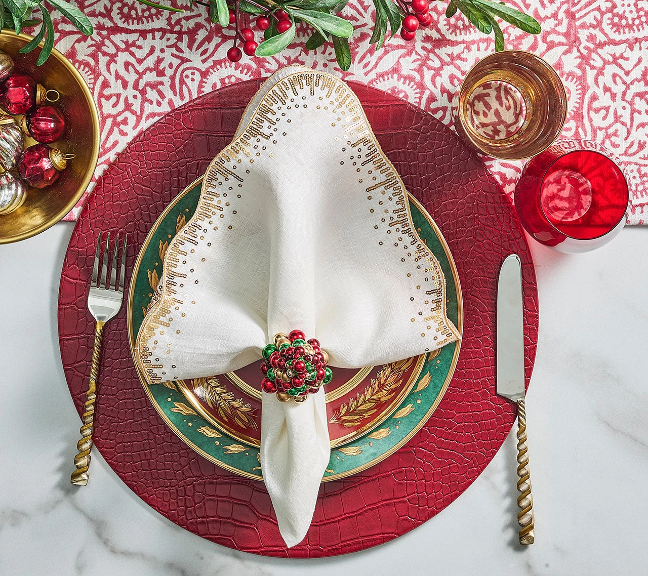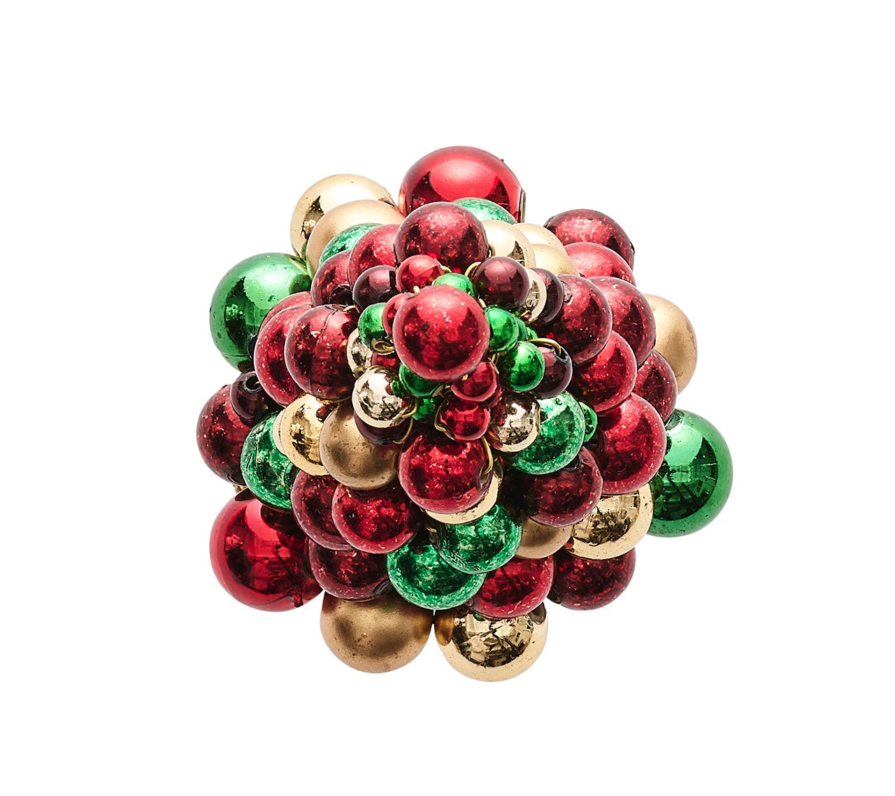 The classic Christmas-inspired Xmas Baubles Napkin Ring features a tree made from sparkling stacked globes in green, red, and gold. Various sizes of baubles are hand-strung and arranged to form a conical tree. The festive baubles sit atop a gold beaded, square ring.Â