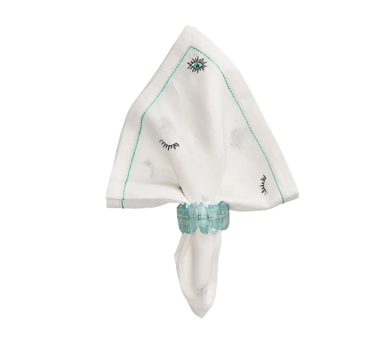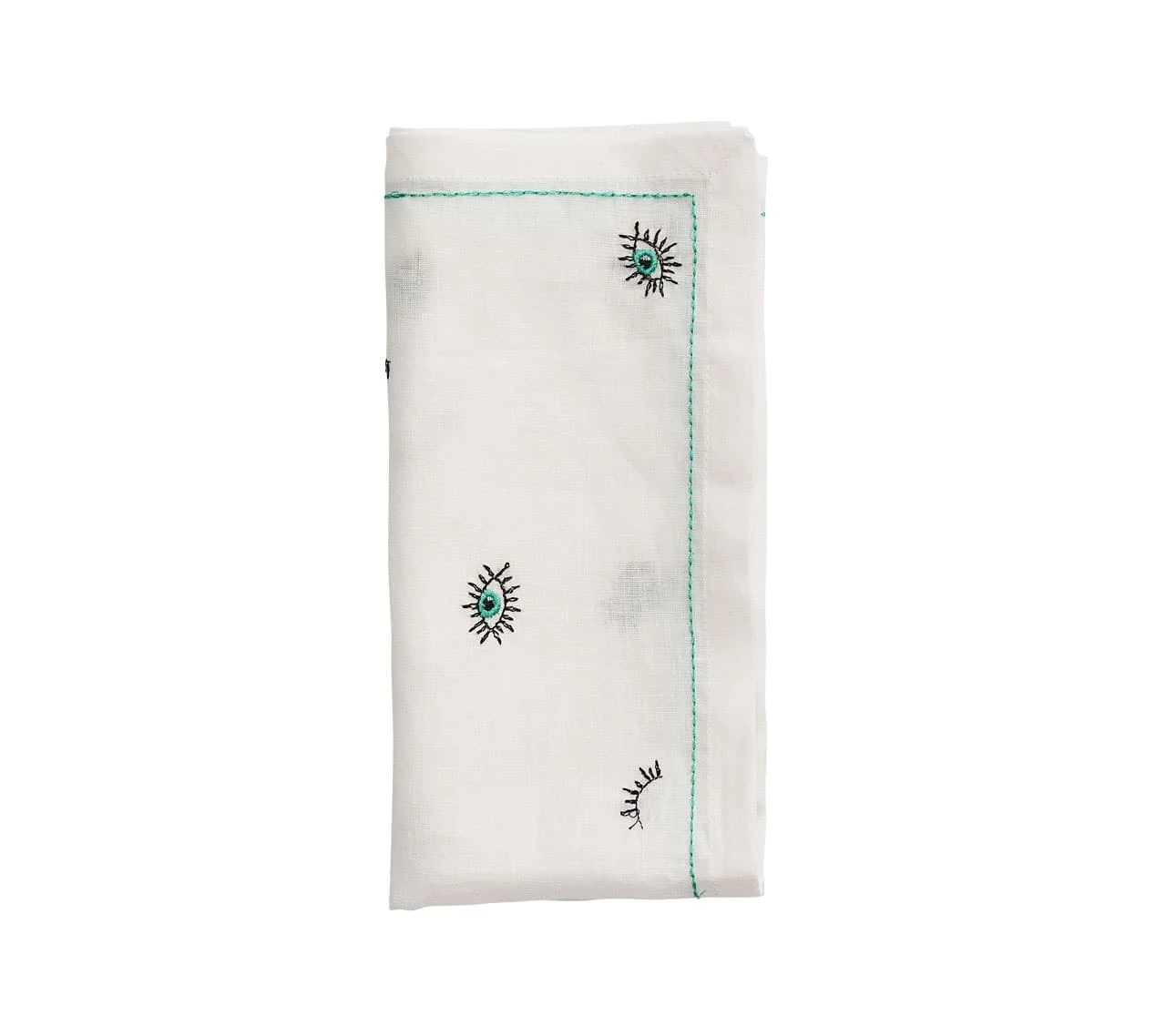 The white linen Bohemia Napkins feature a stark linen background and beautifully embroidered iconic elements in shades of seafoam green. With a yin-yang type of approach, these crisp linen napkins depict complementary embroidered imagery meant to help foster chitchat. Embroidered images include opened and closed eyes.