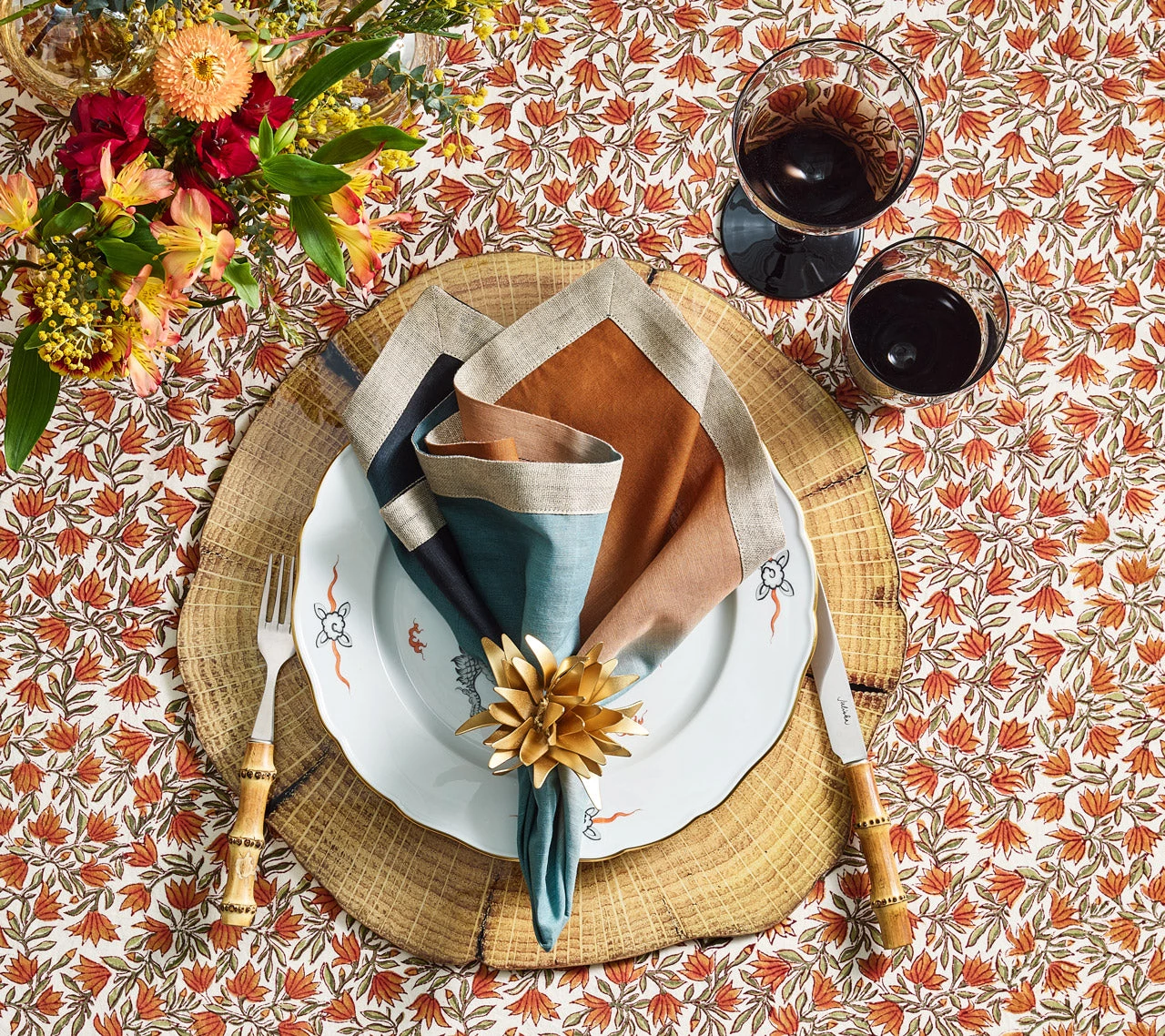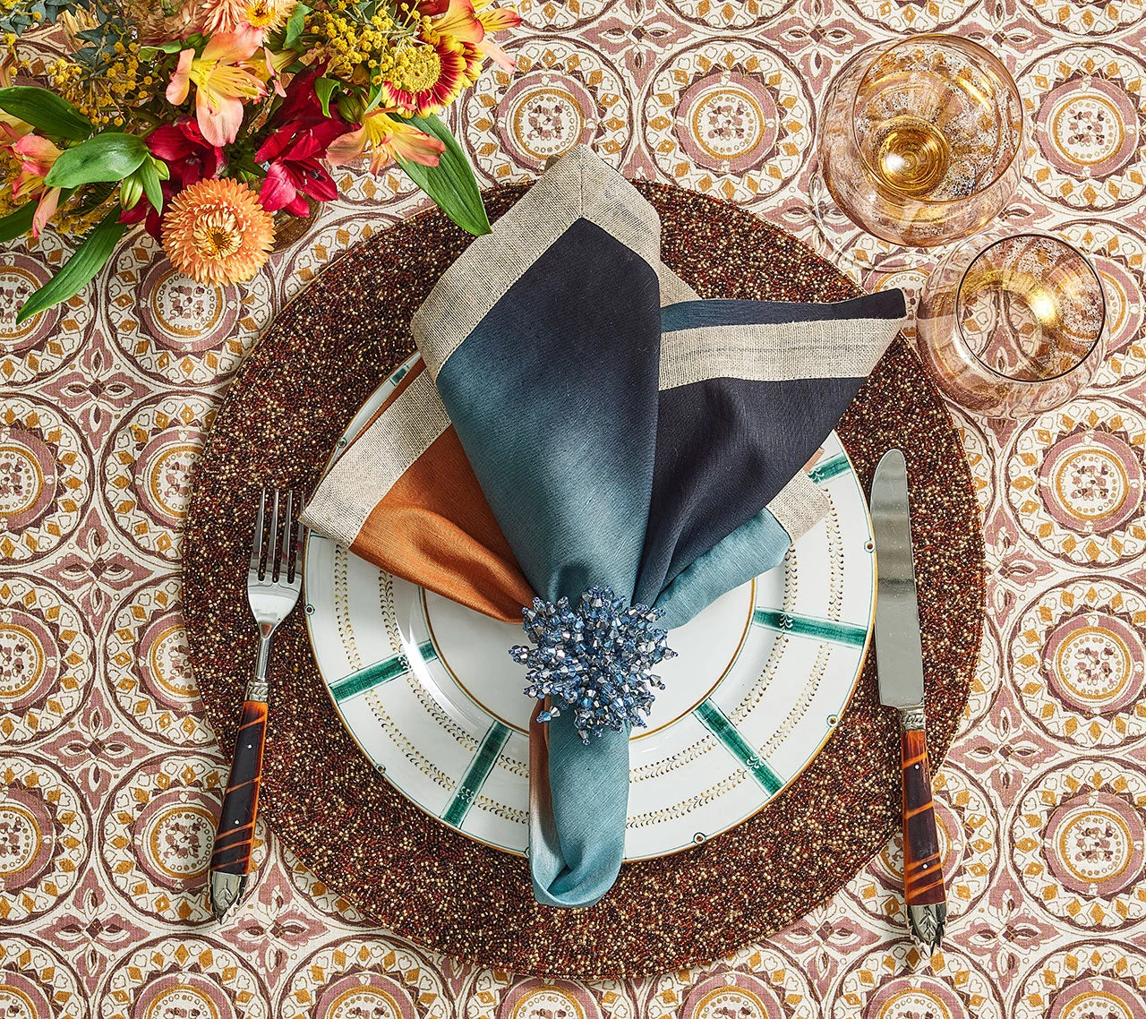 The Linen Dip Dye Napkin features an ombre gradation from midnight to copper, adding a subtle elegance to the refined linen napkin. This gorgeous rich color combination complements any festive fall table. These linen napkins are hand-dipped and dyed and accented with a luxurious metallic foil border.