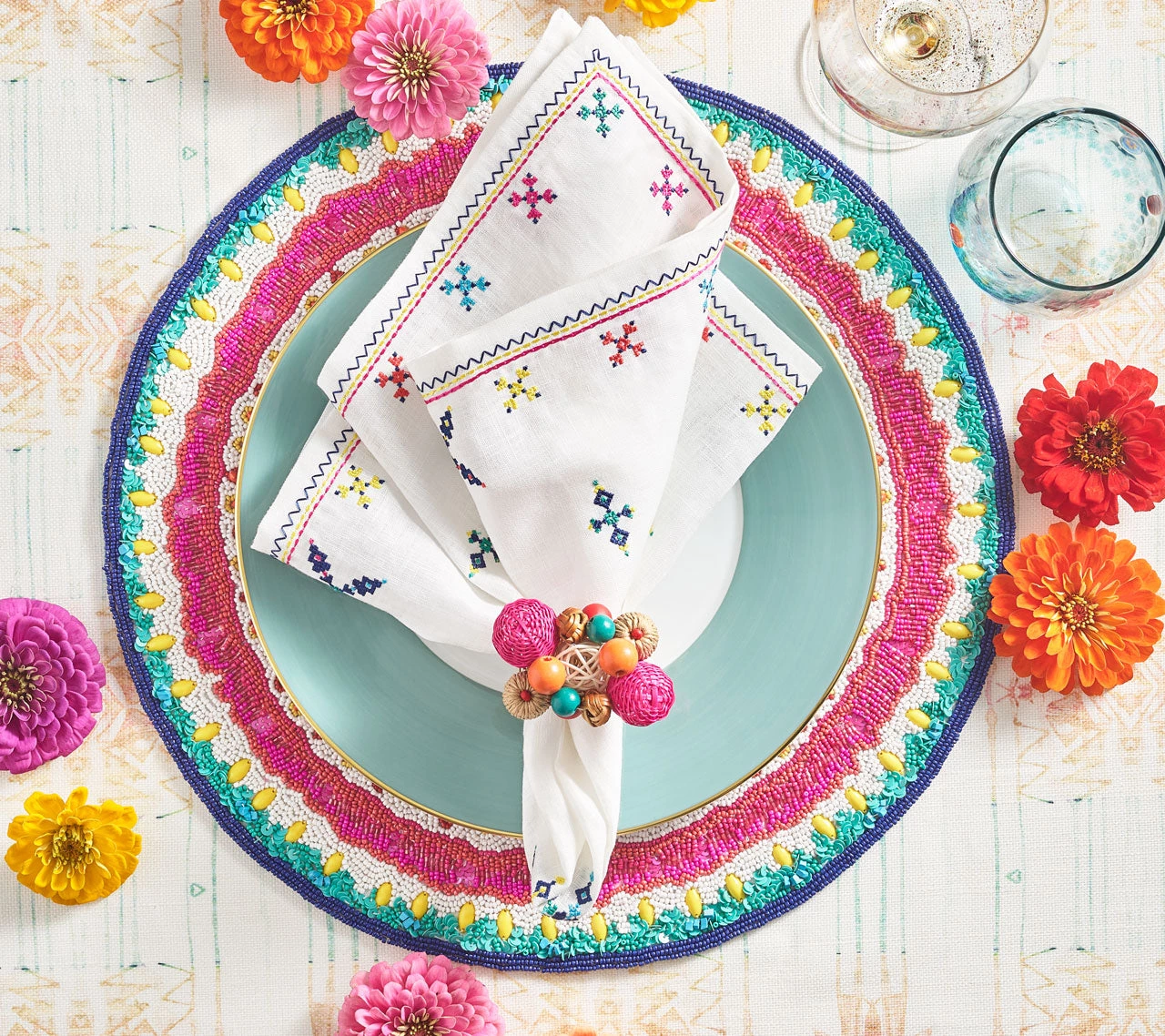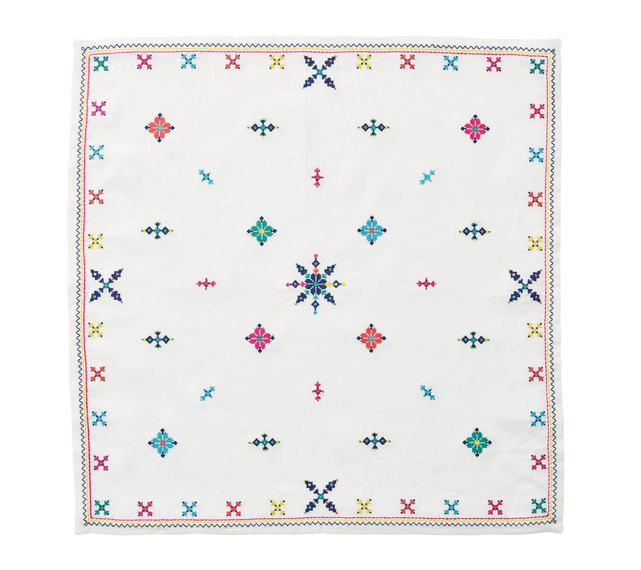 Traditional Moroccan embroidery inspired the linen Fez Napkin. The white napkin features colorful embroidered details arranged in a symmetrical pattern across the napkin. A multicolored striped embroidered border completes the festive napkin.