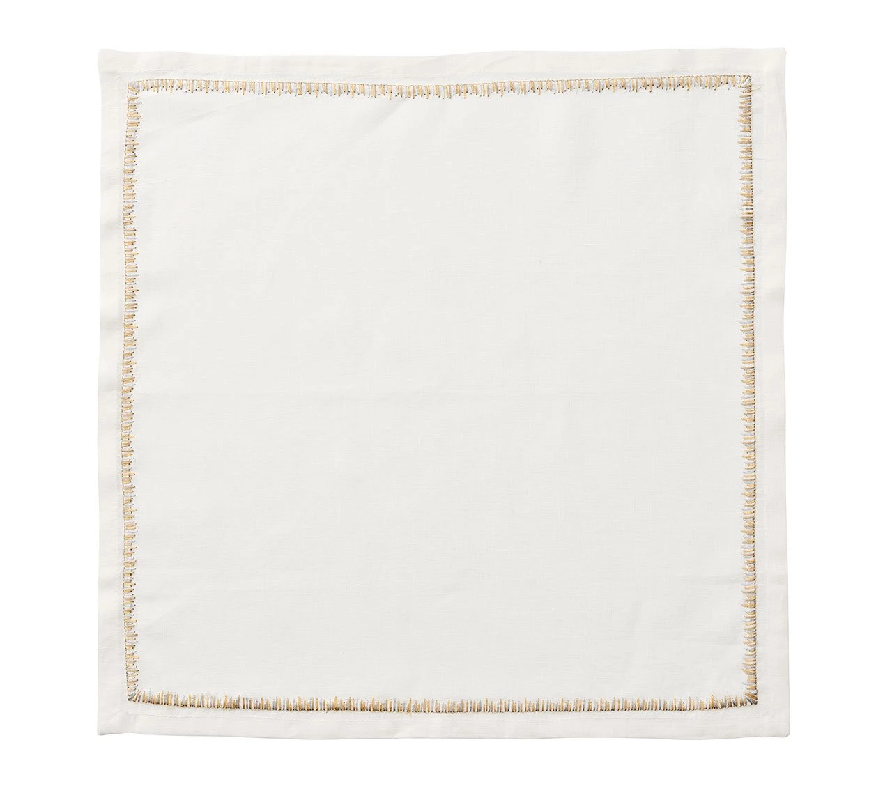 A festive take on the classic, crisp white linen napkin, the linen Filament Napkin features long, floating embroidered stitching in traditional gold and silver thread. These long stitches are reminiscent of the filaments in the center of a lightbulb and add a subtle elegance to any holiday table.