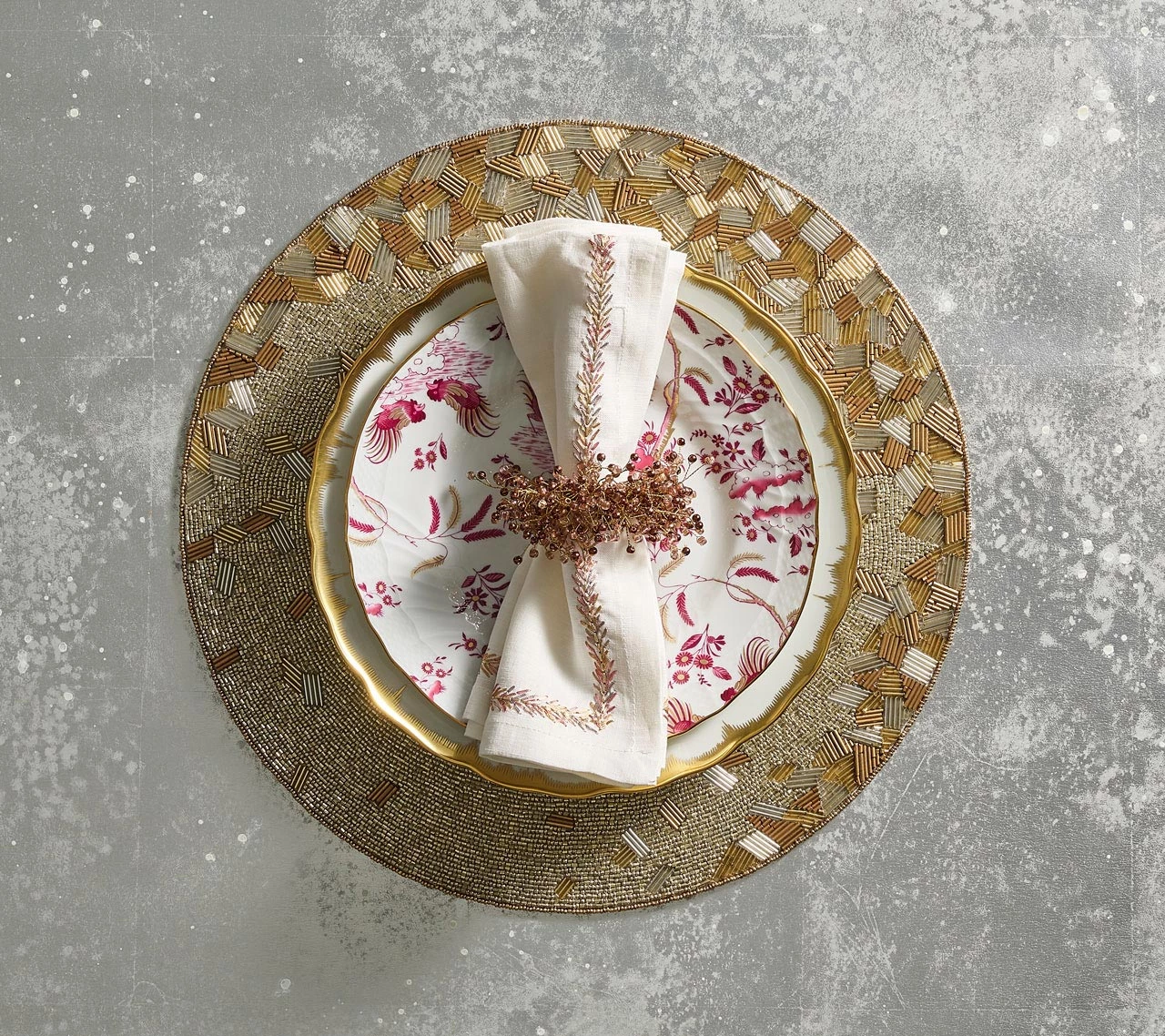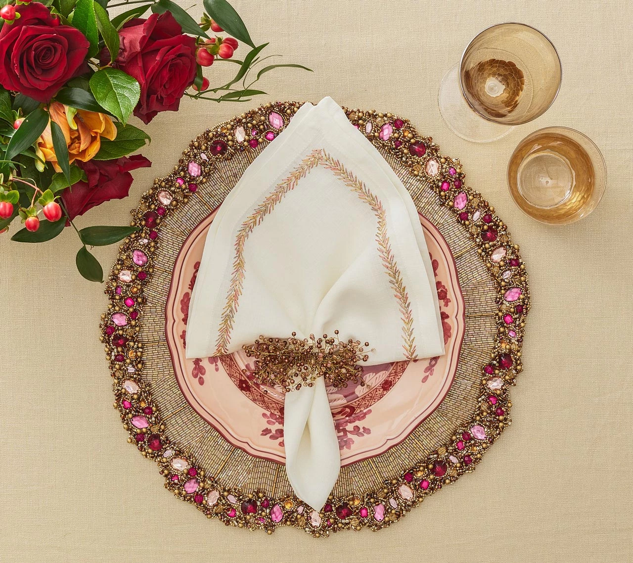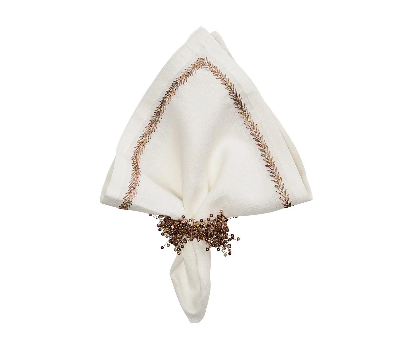 The linen Jardin Napkin in white and shades of rose gold, bronze and silver features intricate embroidery along with the trim of the white linen napkin. This elegant linen napkin is versatile and can be used in both casual and formal table settings. The Jardin Napkin is perfect for your fall table setting.