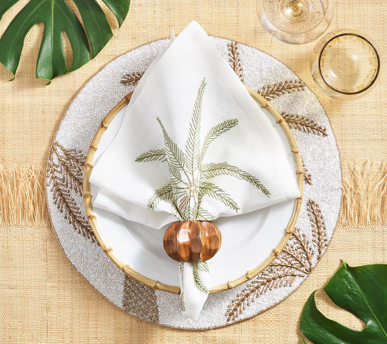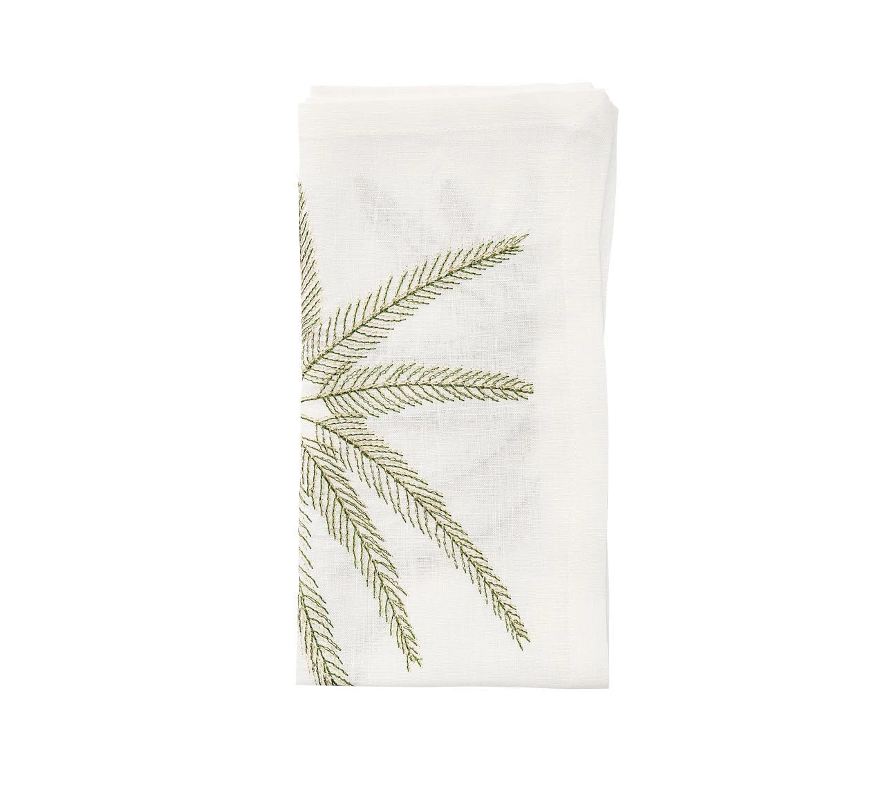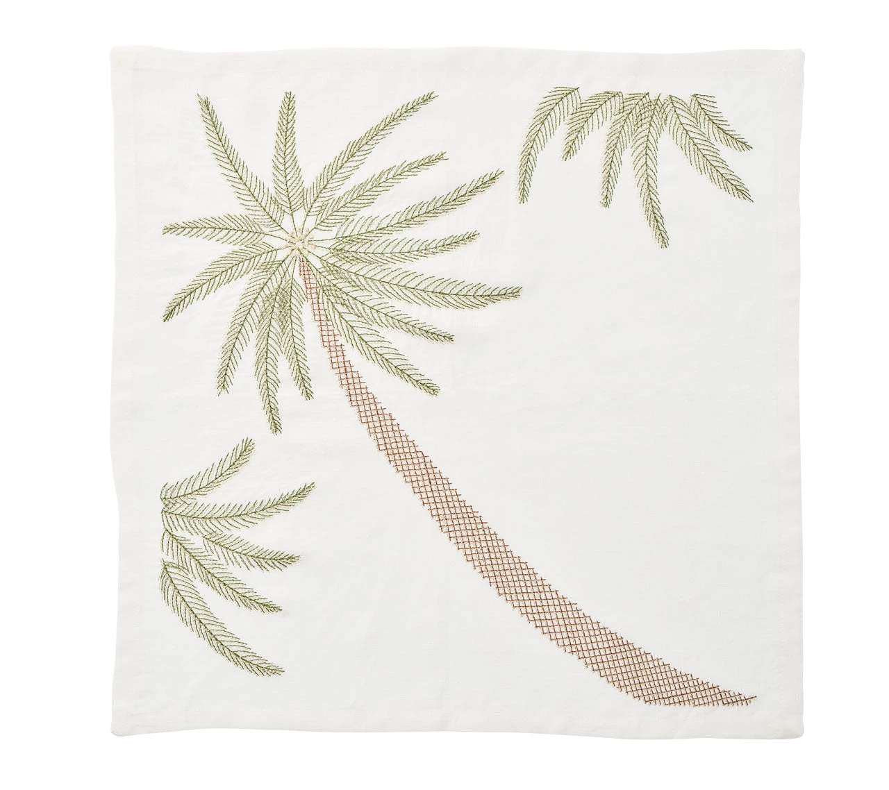 Inspired by palm trees, the aptly named Palm Coast Napkin showcases a hand-drawn design of palm trees embroidered on a white linen napkin. The green embroidered palm fronds seem to bend and sway off the napkin while the golden embroidered trunk anchors the motif.