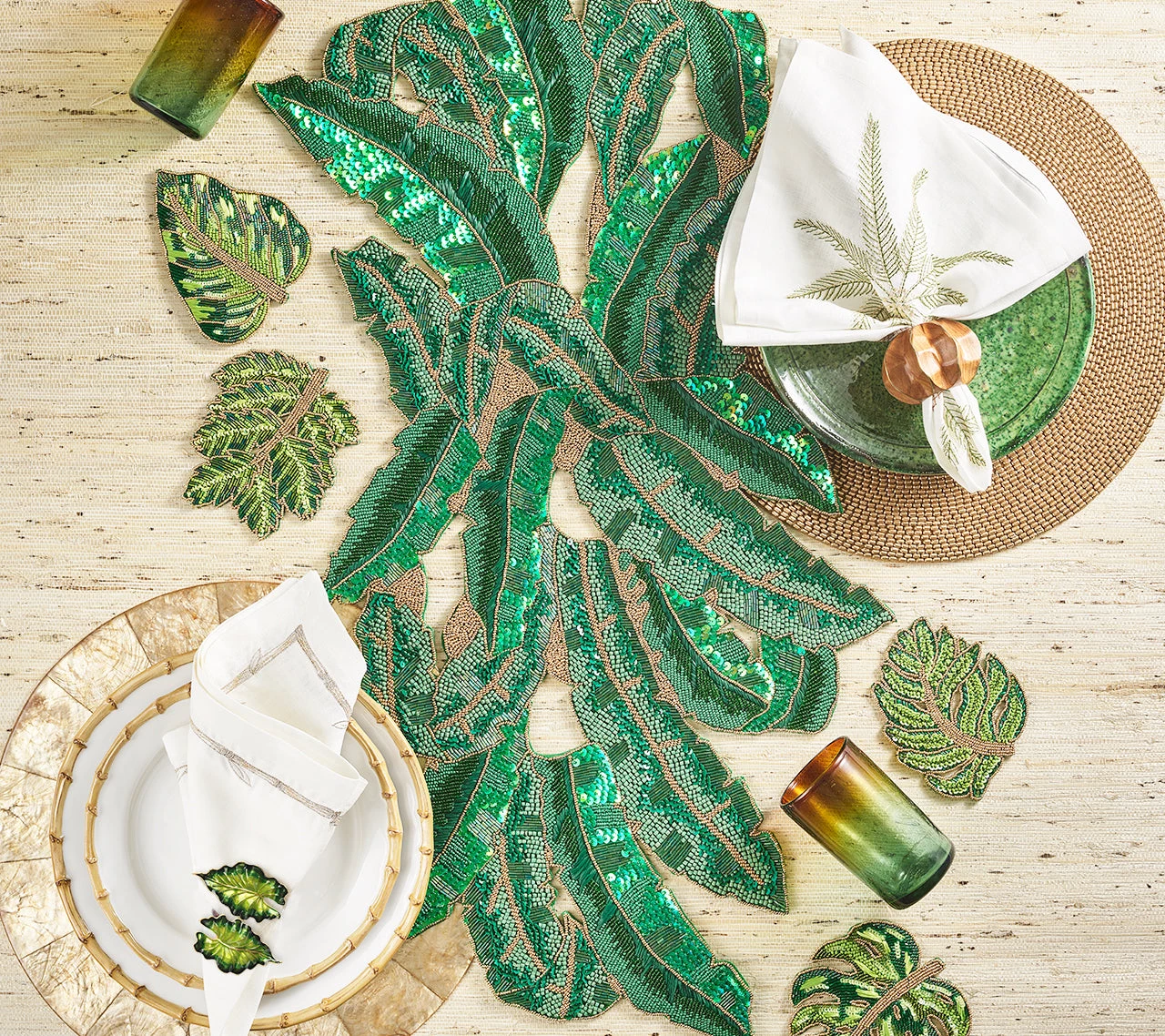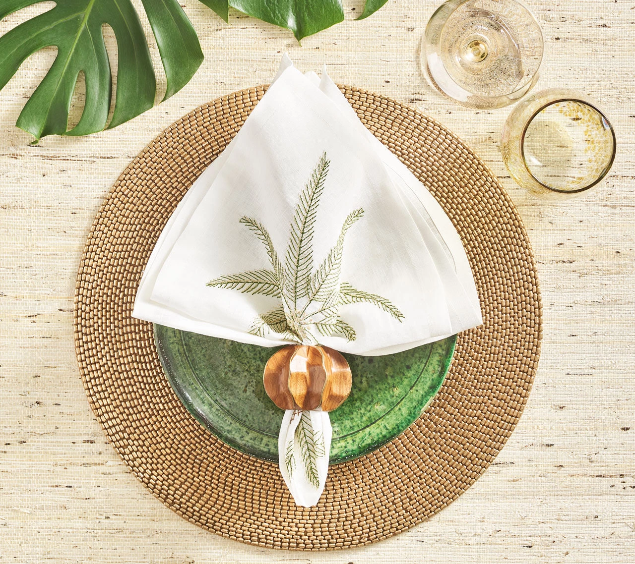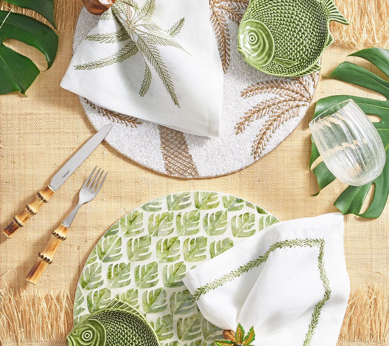 Inspired by palm trees, the aptly named Palm Coast Napkin showcases a hand-drawn design of palm trees embroidered on a white linen napkin. The green embroidered palm fronds seem to bend and sway off the napkin while the golden embroidered trunk anchors the motif.