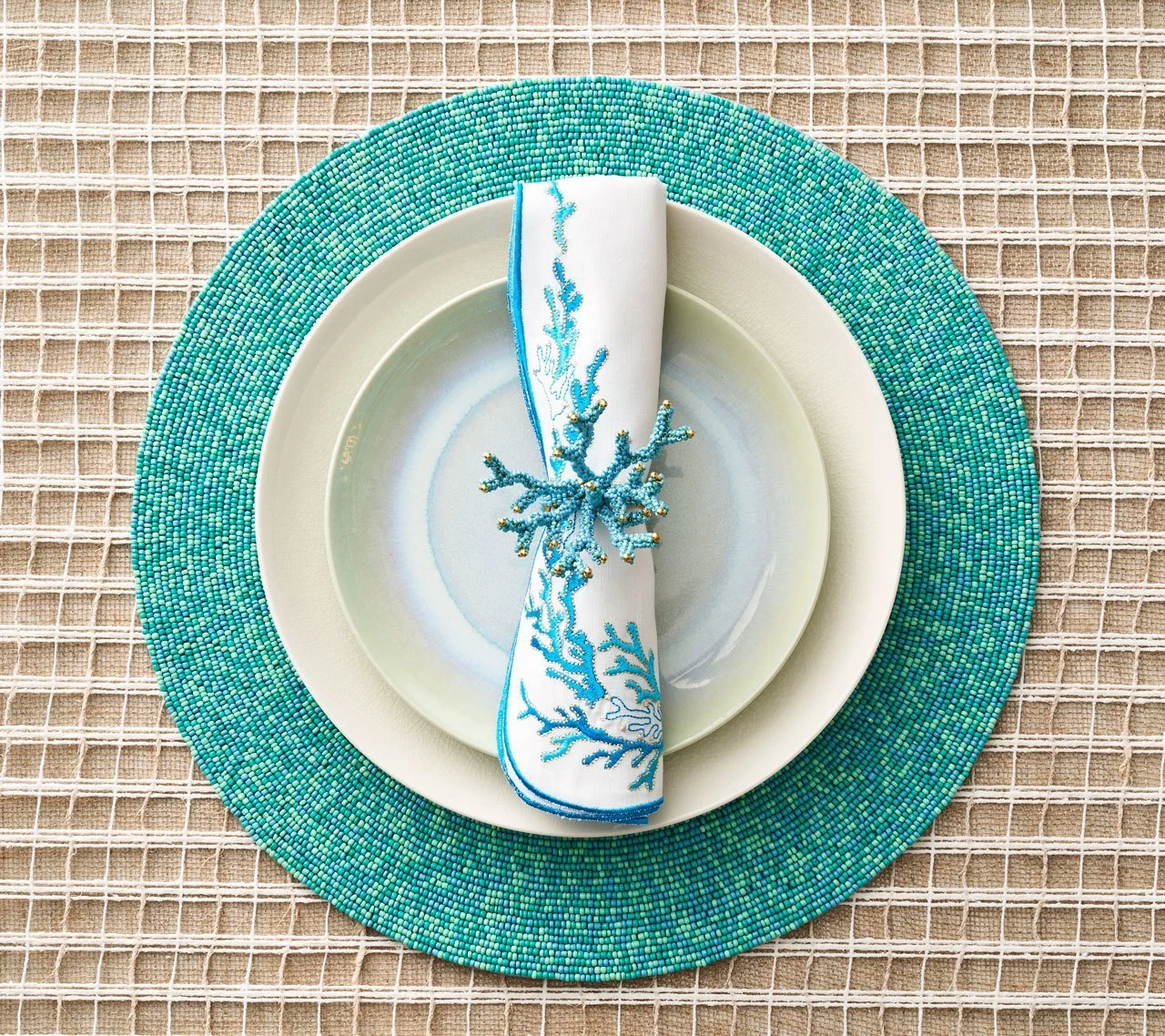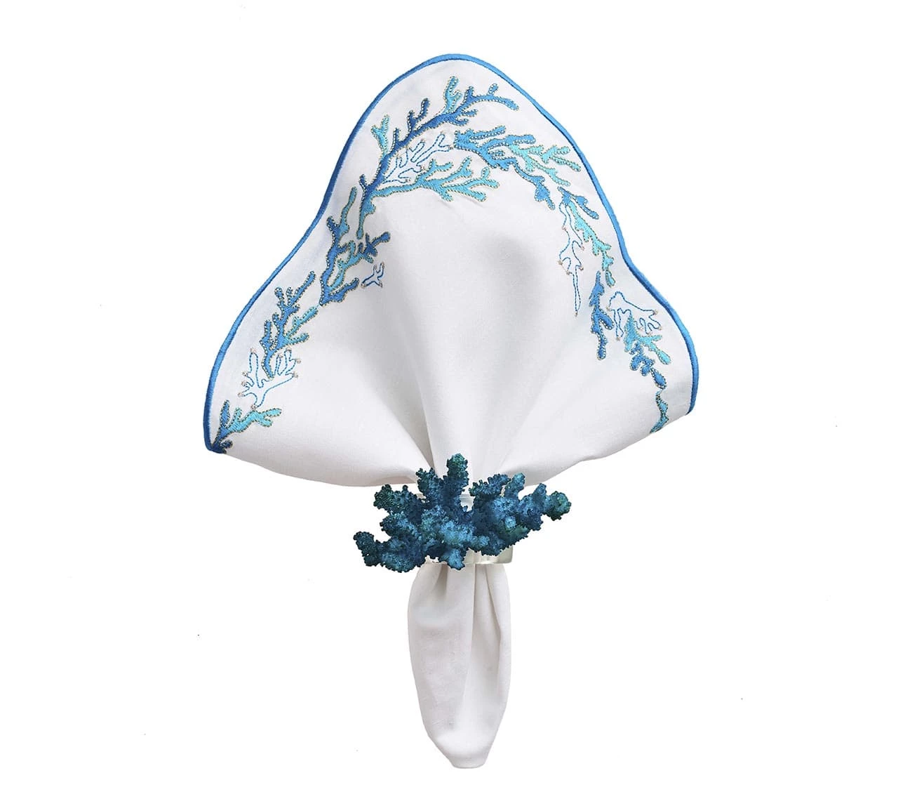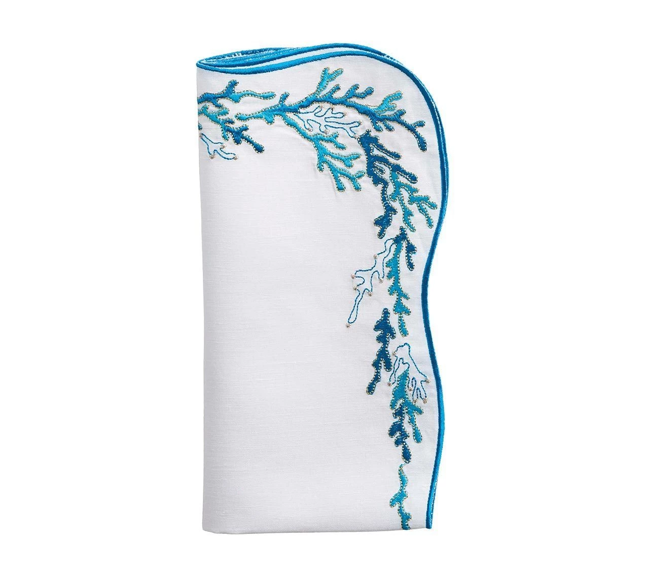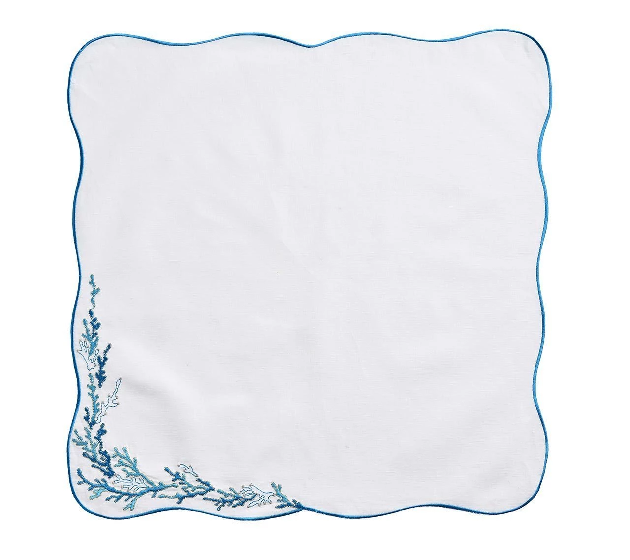With a wave-like shaped embroidered edge, a delicate coral reef design dresses up these napkins for a graceful oceanic table. Available in three colors.
