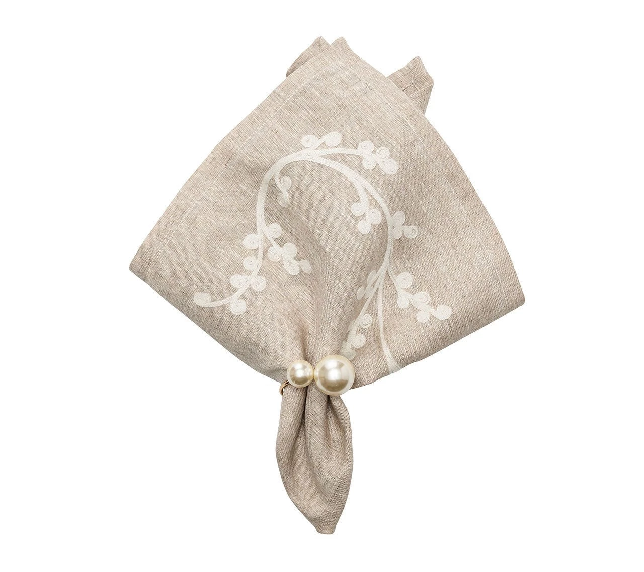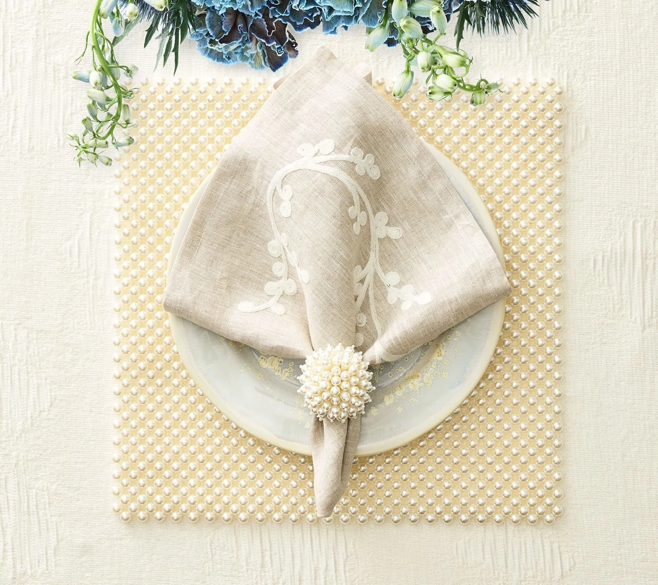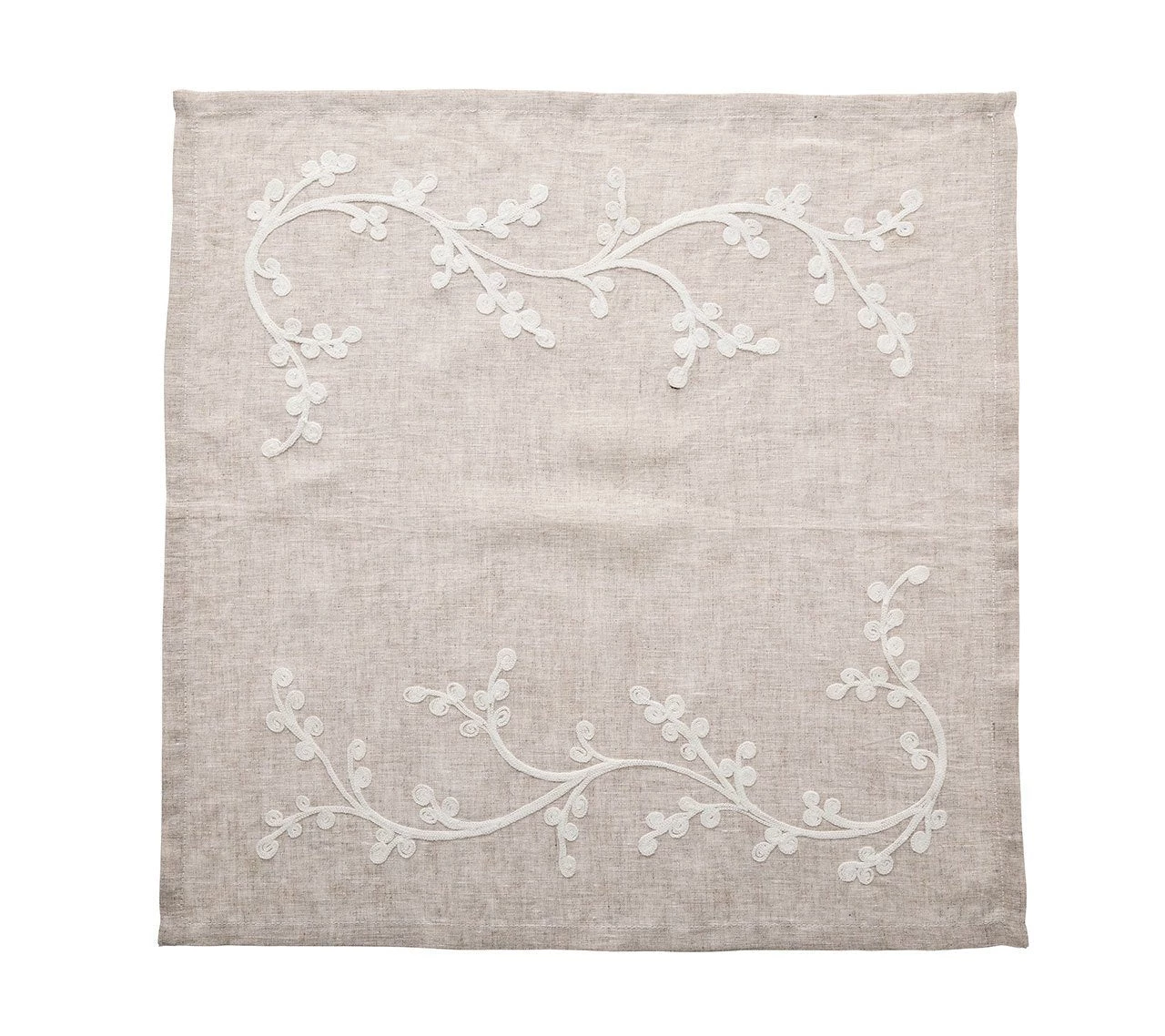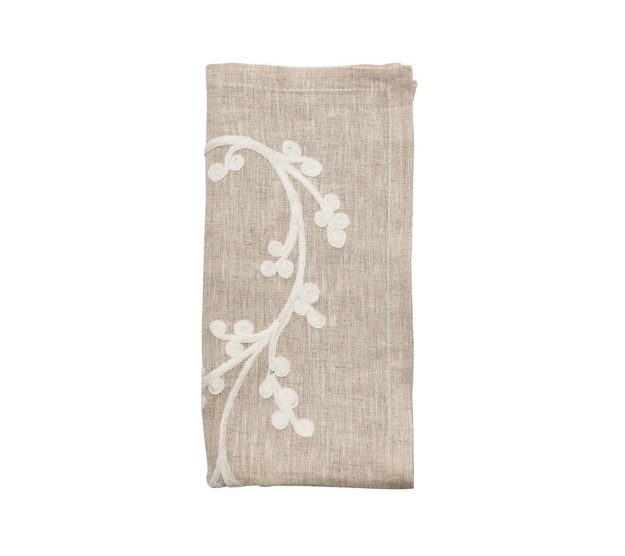 The embroidered linen Sakura Napkin features the age-old crewel embroidery to create an intricate scroll pattern. This type of embroidery requires a strong, long-staple thread spun from wool which creates depth and complexity to the design. The embroidered linen napkin with ivory embroidery is incredibly versatile and complements any table setting from a casual lunch for two to a dinner party or wedding celebration.