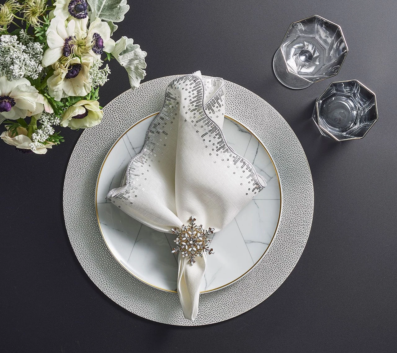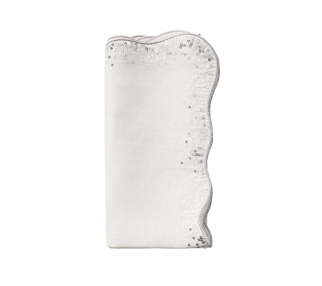 The undulating metallic silver sequins on the Sequin Spray Napkin create a festive effect on the crisp white linen background. A festive approach to a classic napkin, the Sequin Spray adds a touch of elegance to any holiday table.