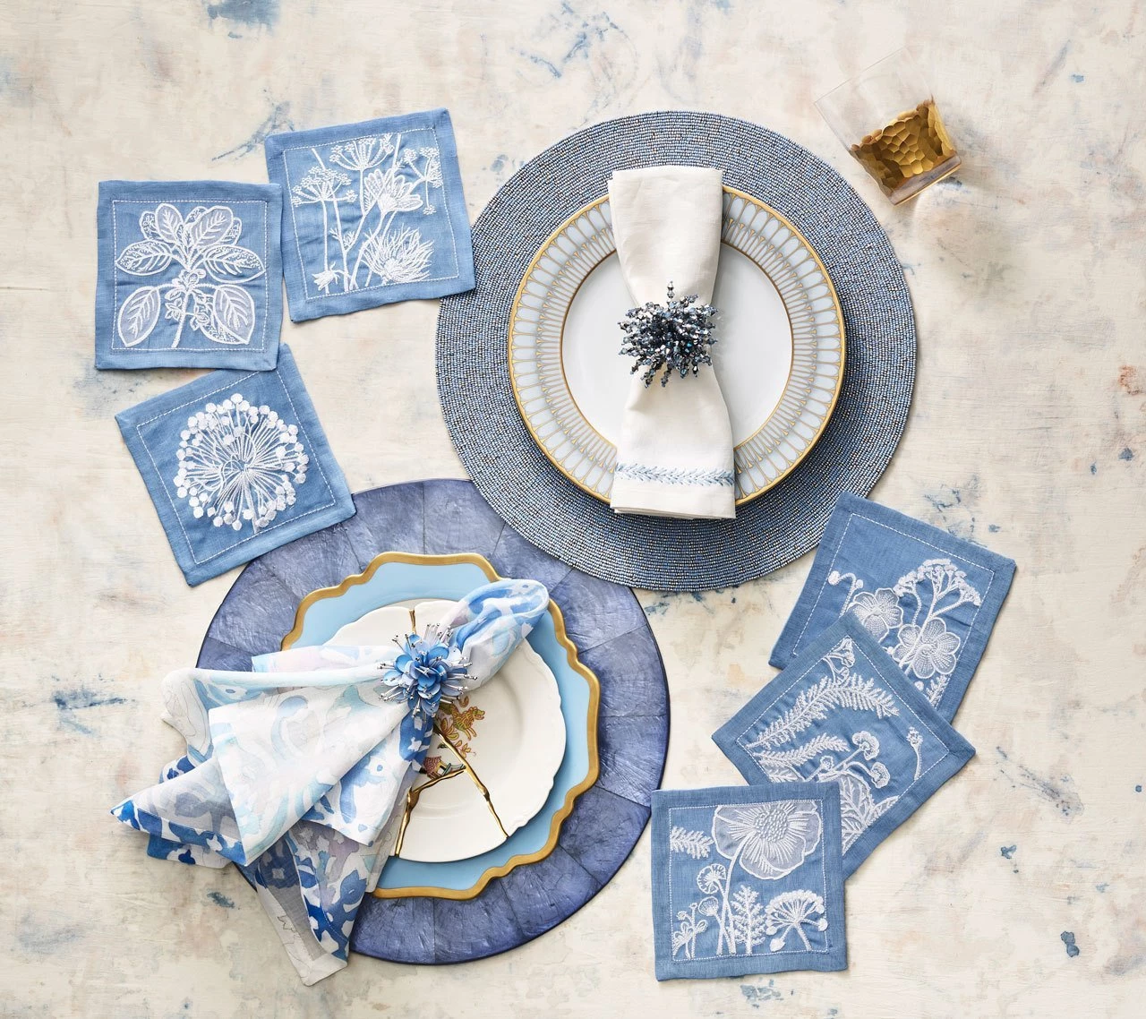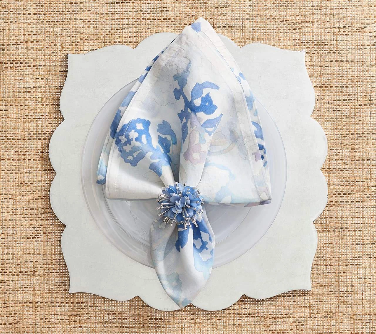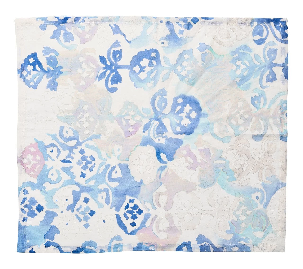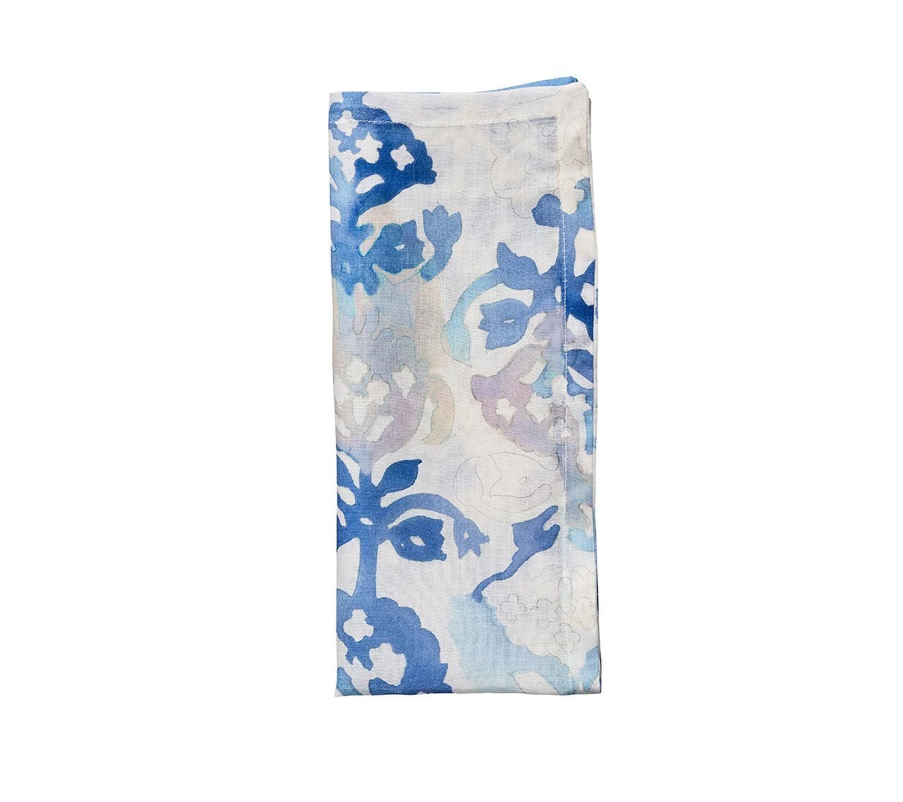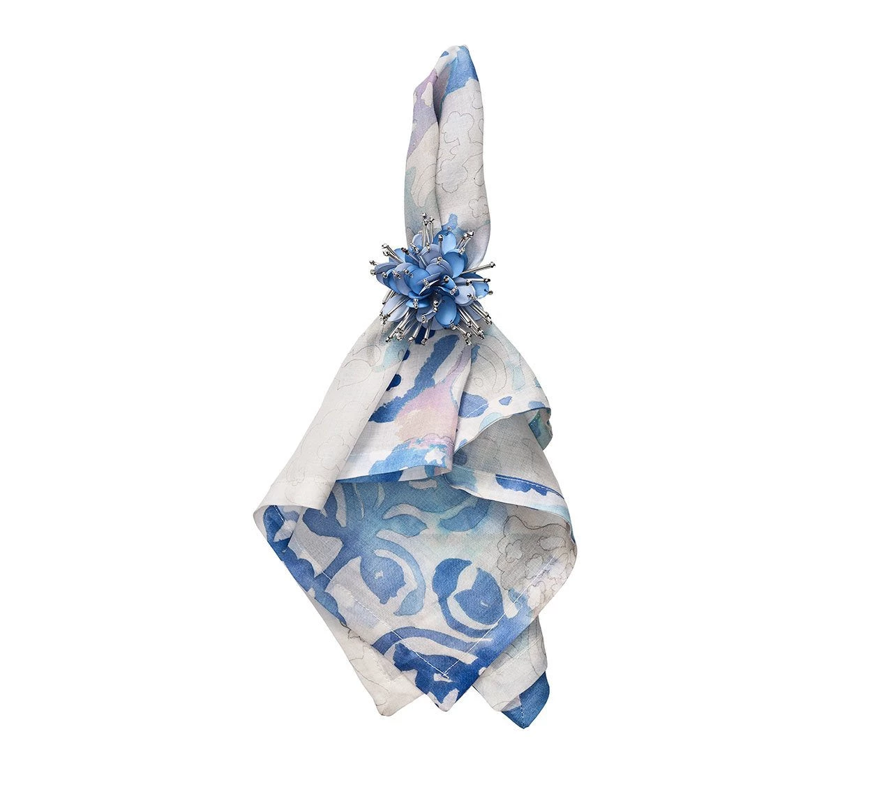 The Watercolor Napkin is a printed cloth napkin showcasing a hand-painted floral motif on linen fabric. This white summery cloth napkin features a fluid watercolor design in blues, pinks and purples.