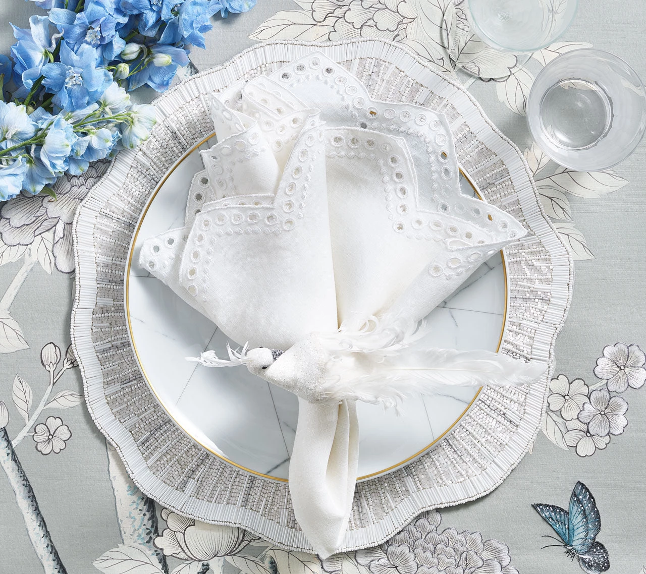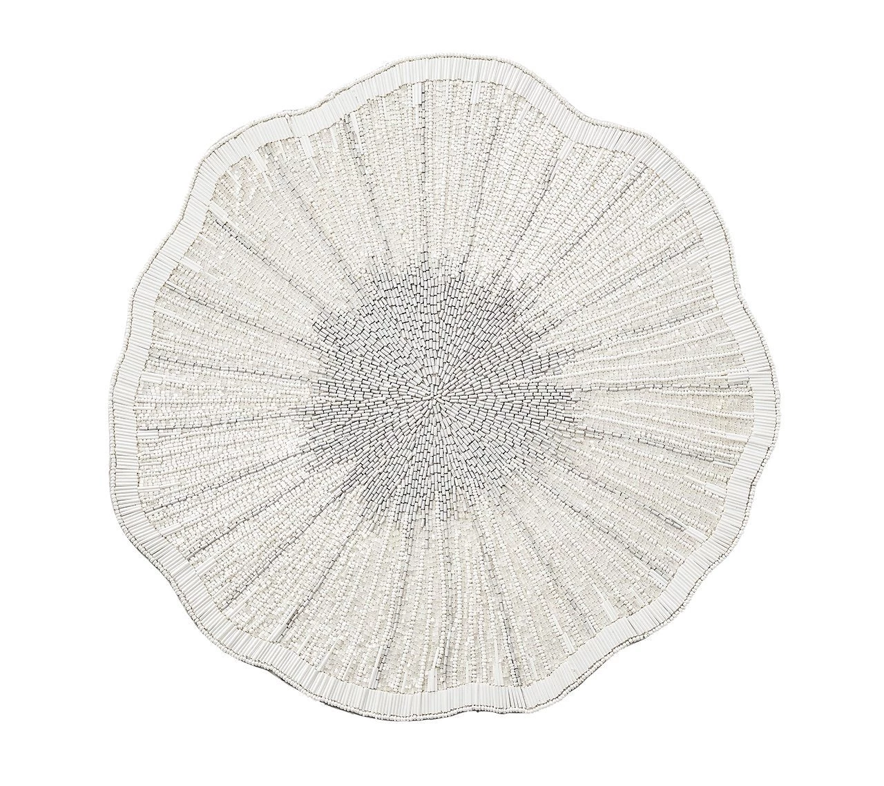 As its namesake suggests, the Nova Placemat exudes brightness. The hand-beaded Nova Placemat features a beautiful ombre effect, created by the intricate hand placement of grey and white glass beads and bordered by horizontal, translucent white beads. This effervescent look is the perfect setting for a bridal shower or afternoon luncheon.