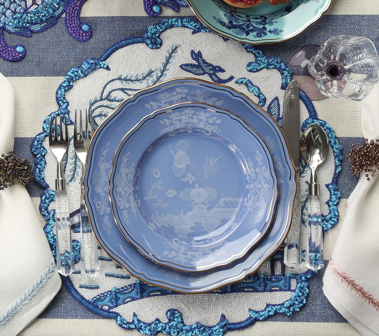 The Oriente Italiano collection features airbrushed strokes with delicate hues on porcelain. A stylized carnation, in the tradition of Florentine ceramics and reinterpreted by Gio Ponti in 1946. Decorated by hand in Italy.