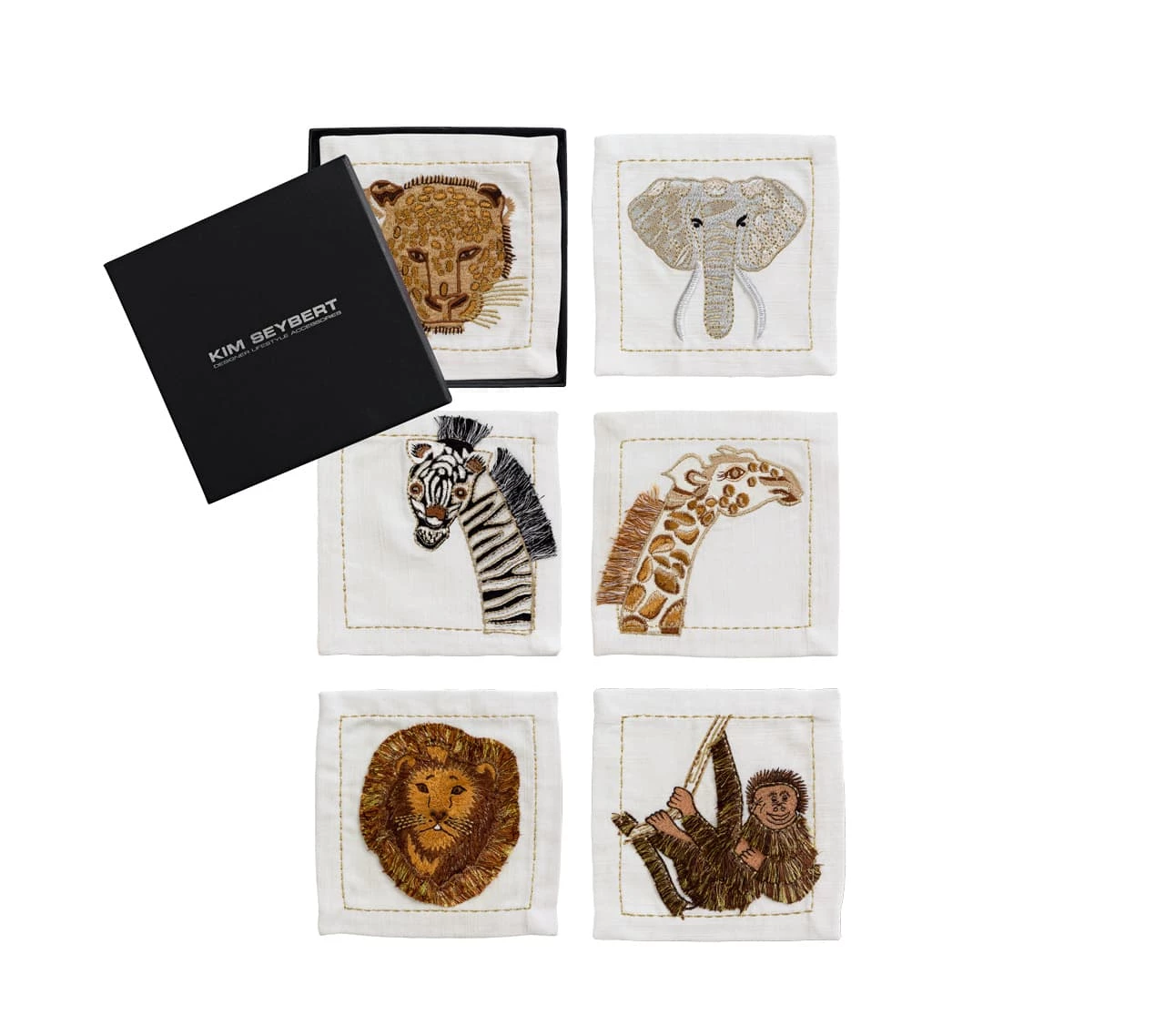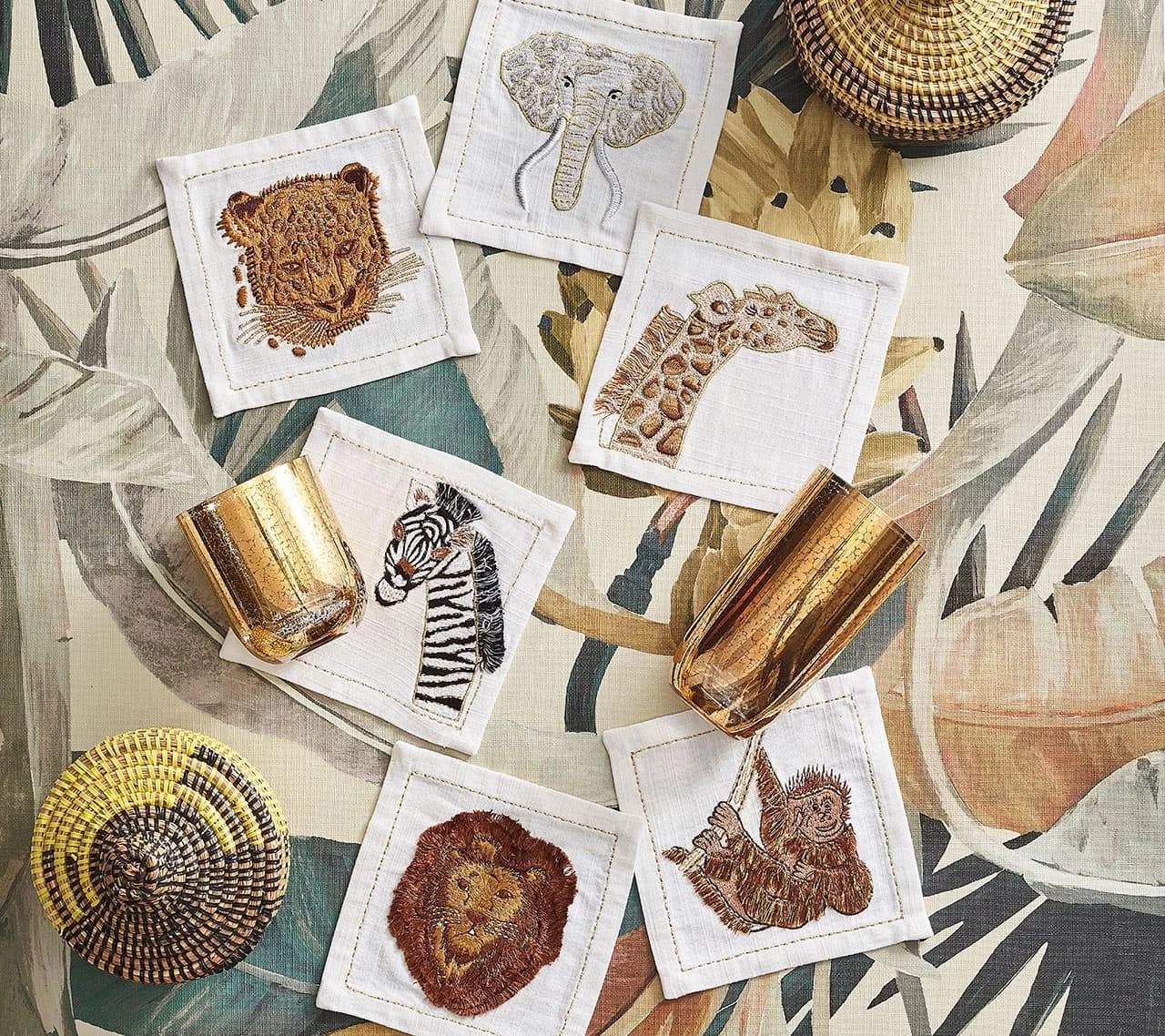 No detail was left out when designing the embroidered linen Out of Africa Cocktail Napkins. Each design was hand-drawn in a whimsical yet realistic manner. This same approach was taken with the embroidery, each animal features a three-dimensional tactile element. From the fringe on the giraffe and zebra to the raised embroidered elephant tusks, these linen cocktail napkins are pieces of art.