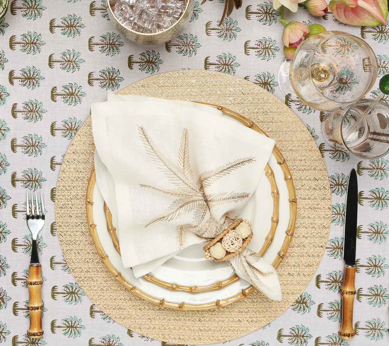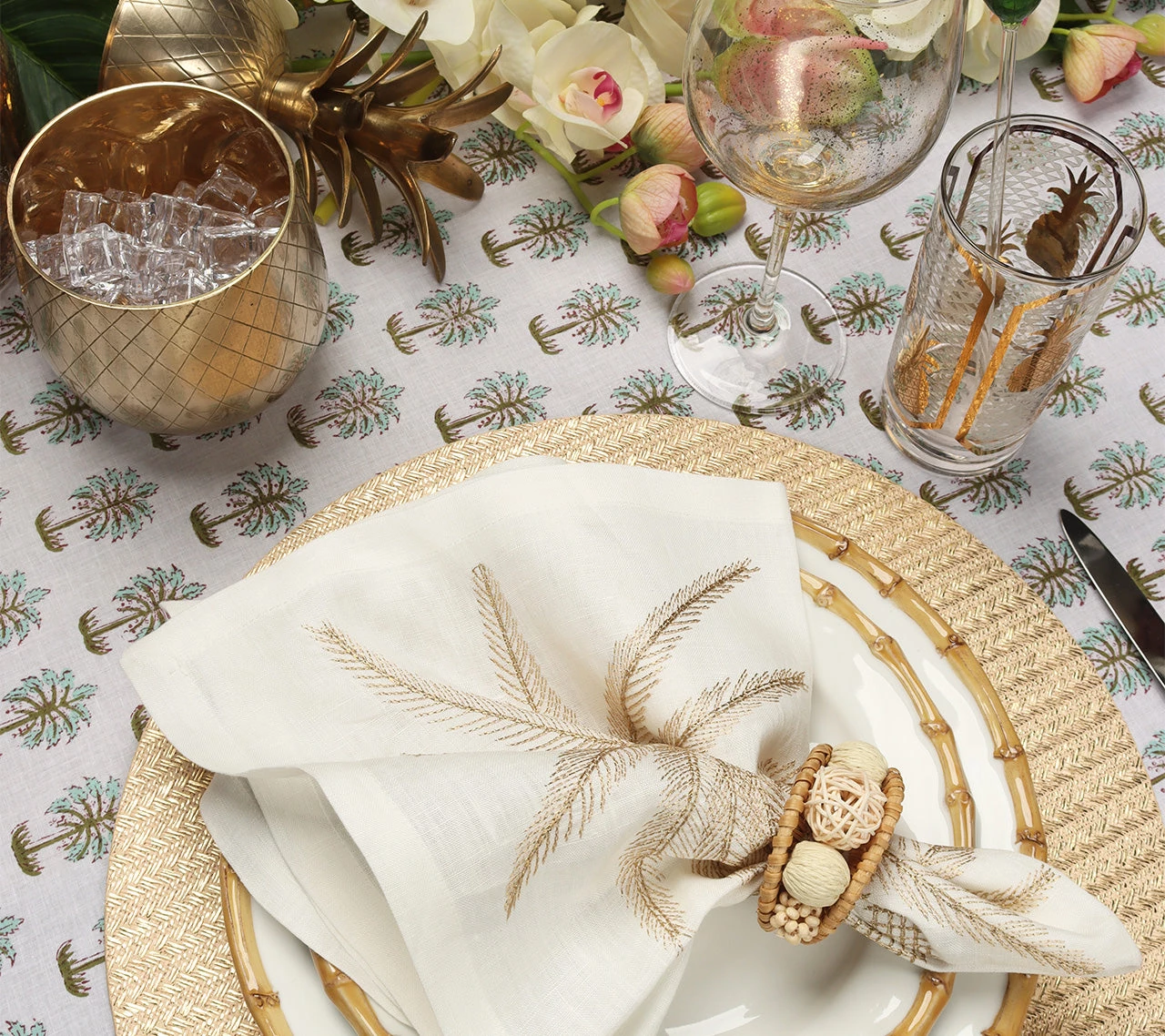 Inspired by palm trees, the aptly named Palm Coast Napkin showcases a hand-drawn design of palm trees embroidered on a white linen napkin. The natural embroidered palm fronds seem to bend and sway off the napkin while the golden embroidered trunk anchors the motif.
