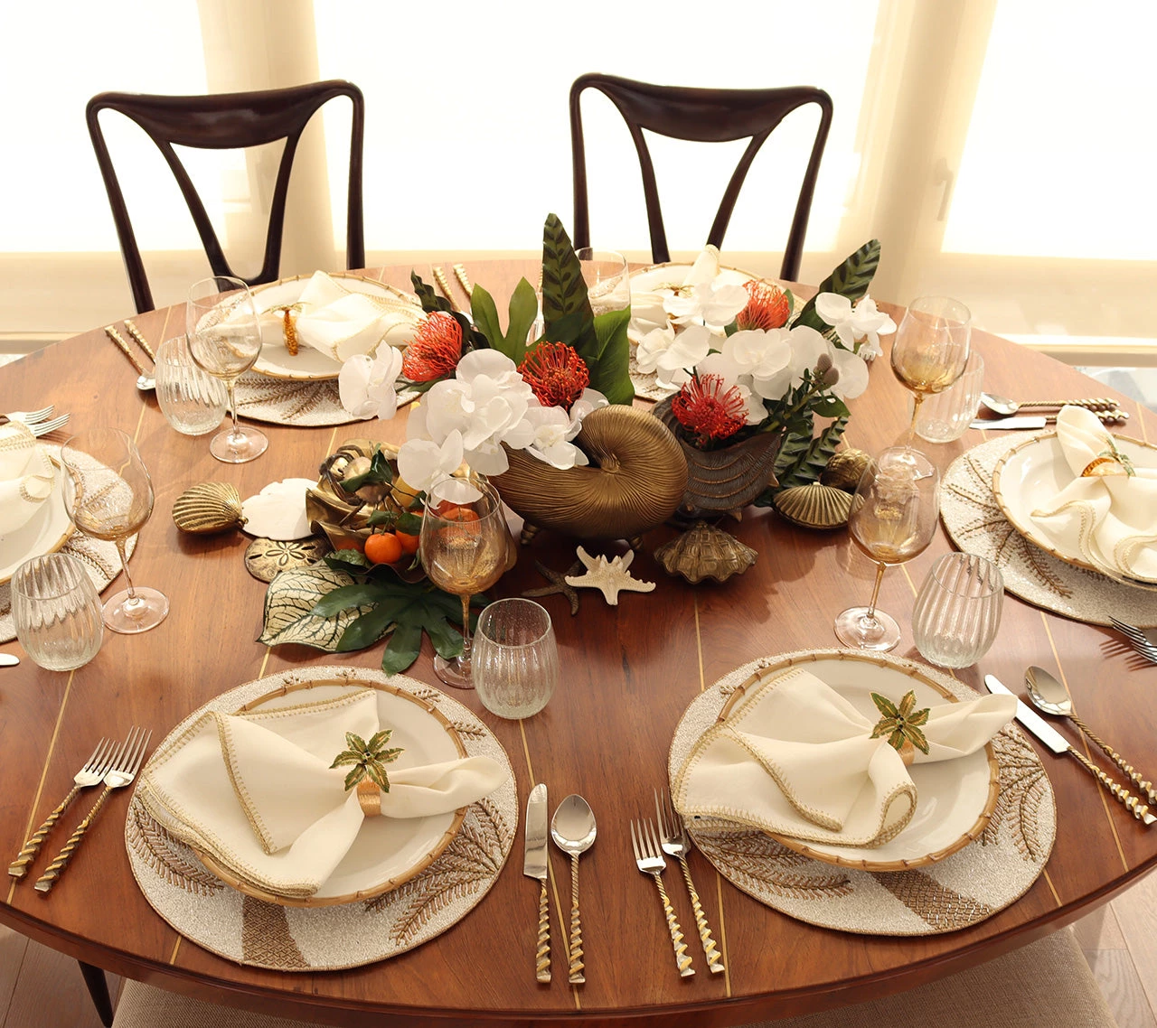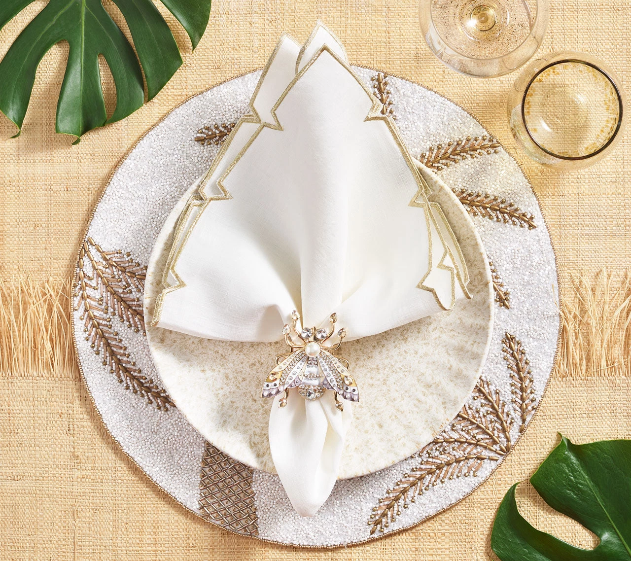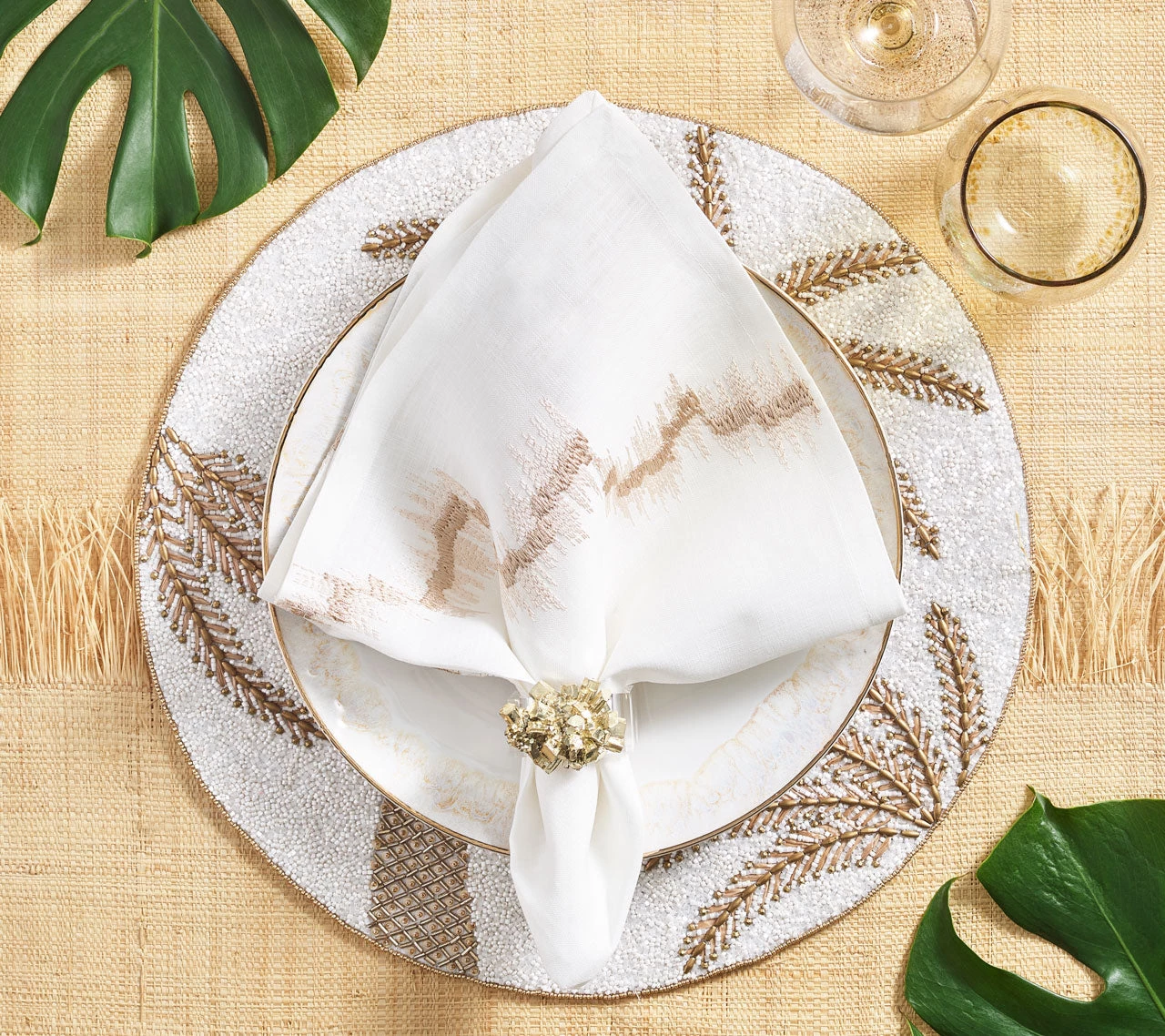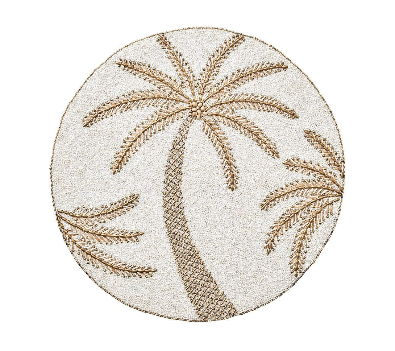 Inspired by palm trees, the aptly named beaded Palm Coast Placemat showcases a design of palm trees made from natural raffia. Each raffia stitch is delicately applied by hand onto a serene white beaded background.
