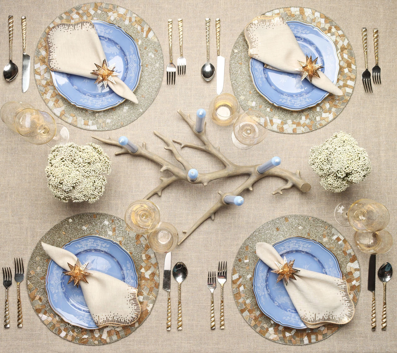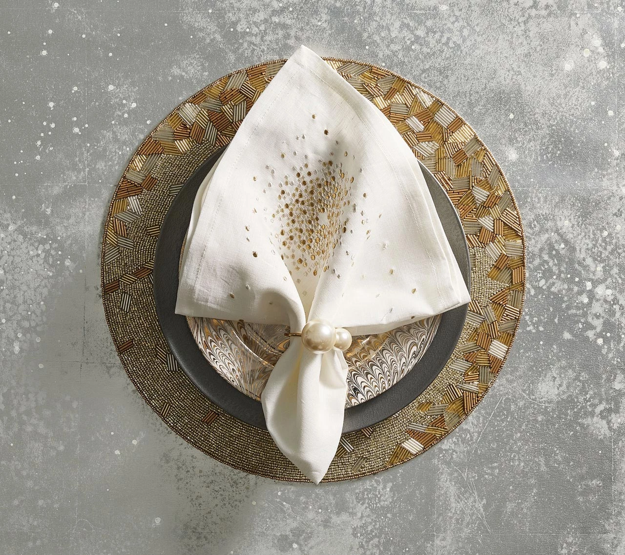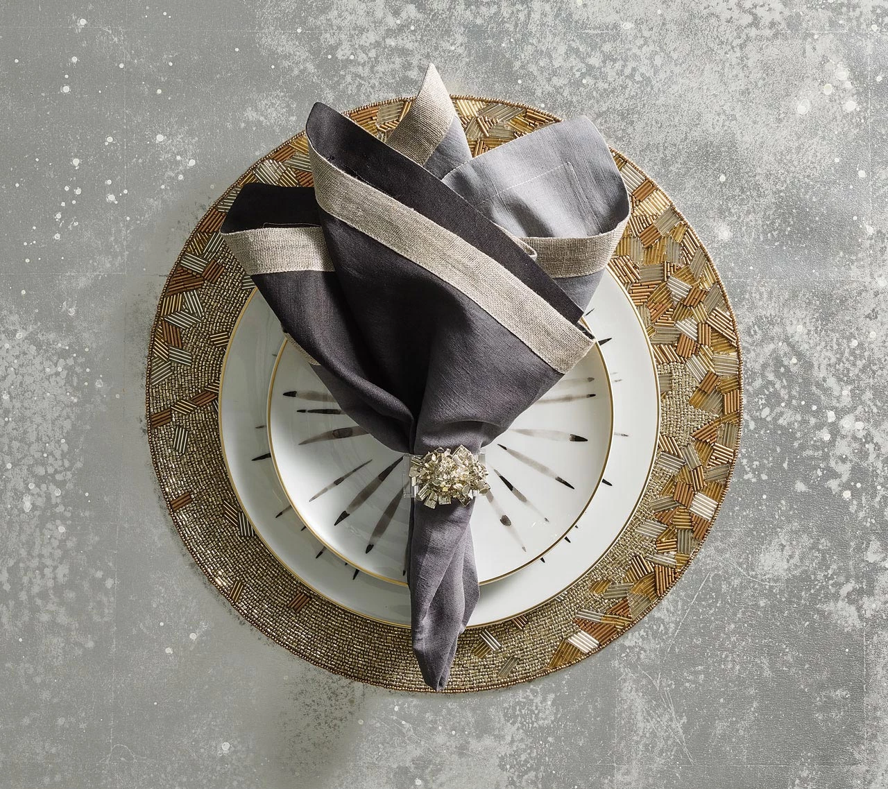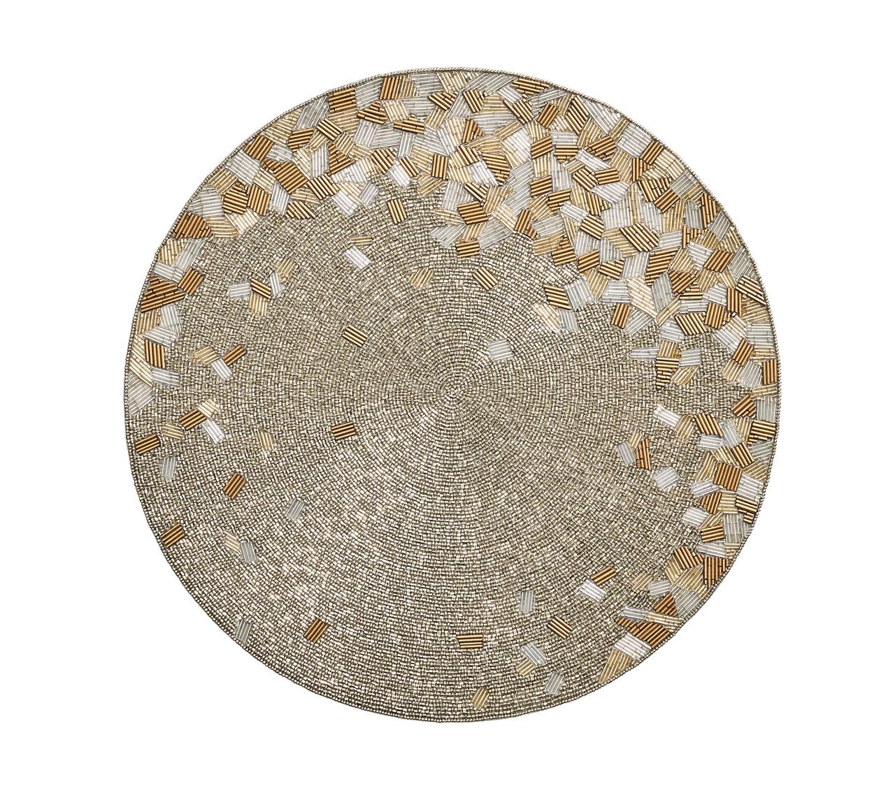 The Abstract Placemat is a modern beaded round placemat featuring exquisitely detailed beading. The placemats, available in gold and silver, are inspired by twinkling lights. This glass beaded placemat includes glass bugle beads cut in a variety of lengths and angles creating facets that radiate light. These round placemats set the stage for a stunning formal and celebratory tablescape. Sold as a placemat set of four.Â