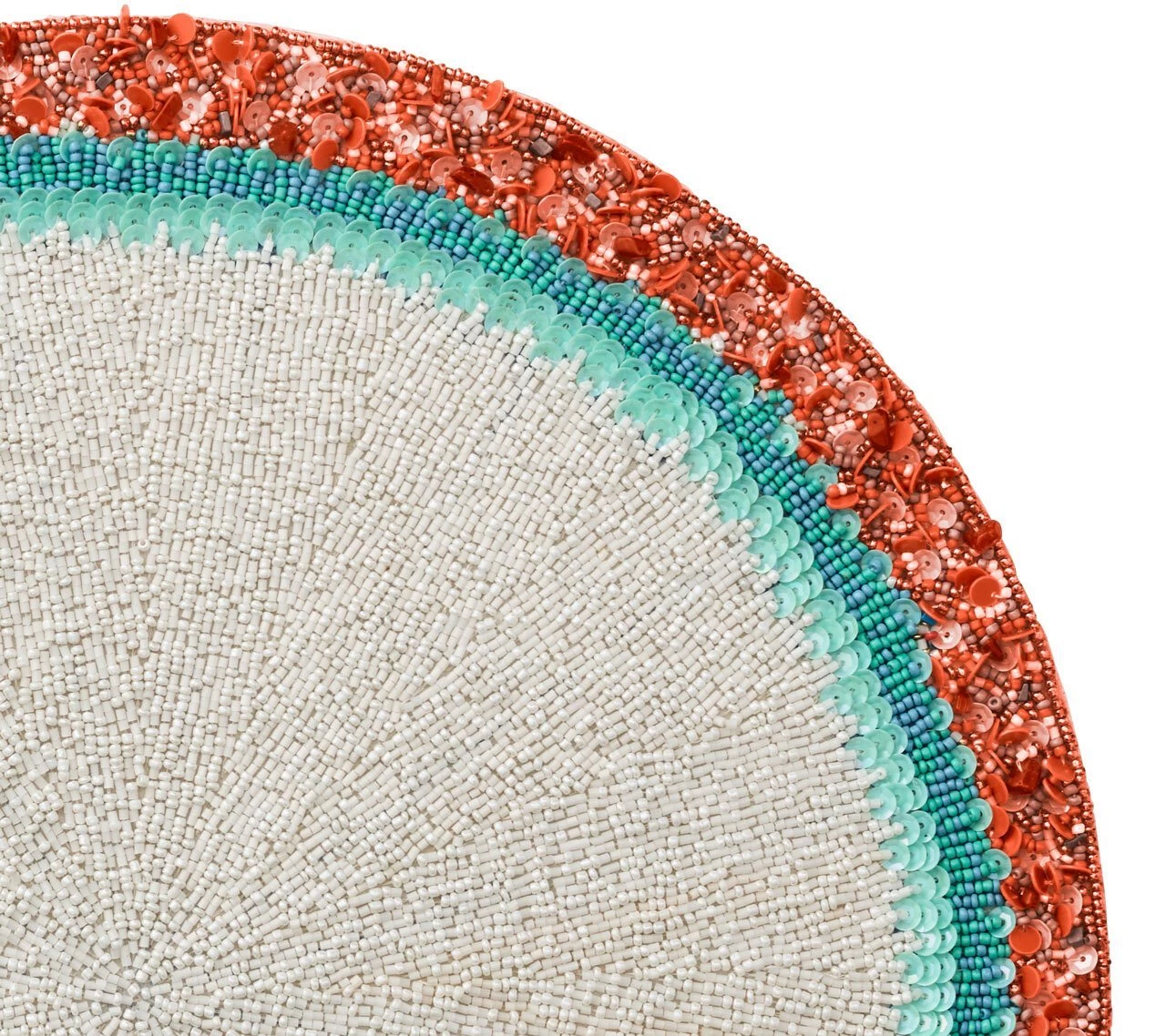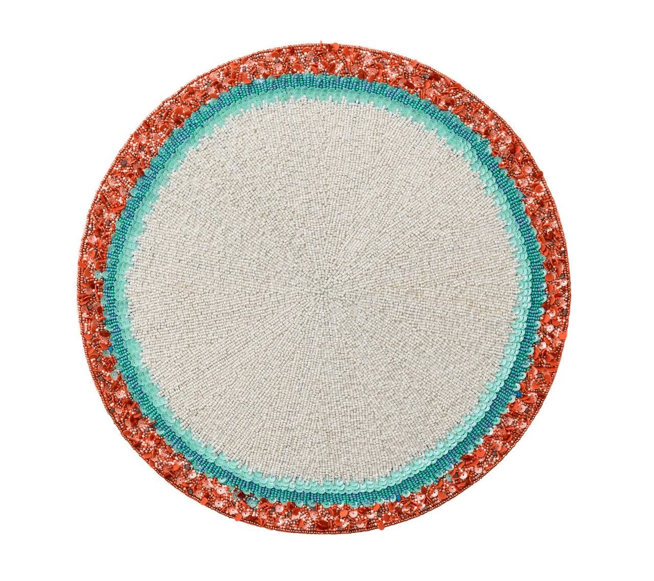 The round beaded Amalfi Placemat features intricate white, turquoise and coral beading and draws inspiration from the azure waters and the coral formations of the Italian Mediterranean. An ombre beaded gradation from ivory to turquoise to coral is completely handmade using glass beads and sequins. The perfect backdrop for a seaside-themed table setting . The beaded Amalfi Placemat is sold in sets of four.