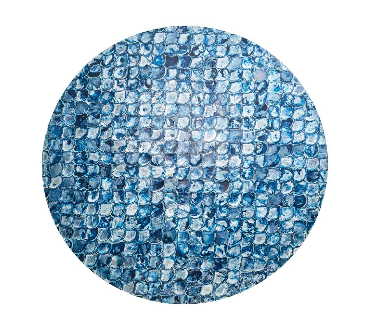 The round capiz Camellia Placemat is a softer take on the scalloped design motif found on traditional china dinnerware. This round placemat features hand-dyed Capiz shells in a vibrant navy. The naturally occurring shell absorbs the dye differently allowing for a stunning color variation on each placemat. The shells are hand-placed in a scale-like pattern, creating a one-of-a-kind round placemat.