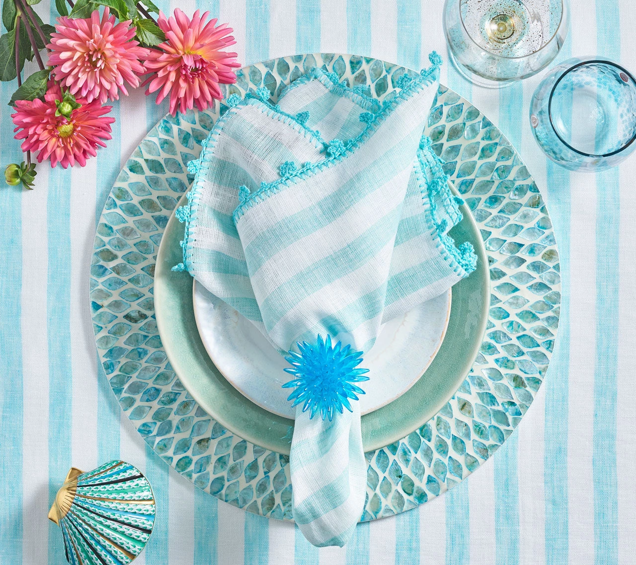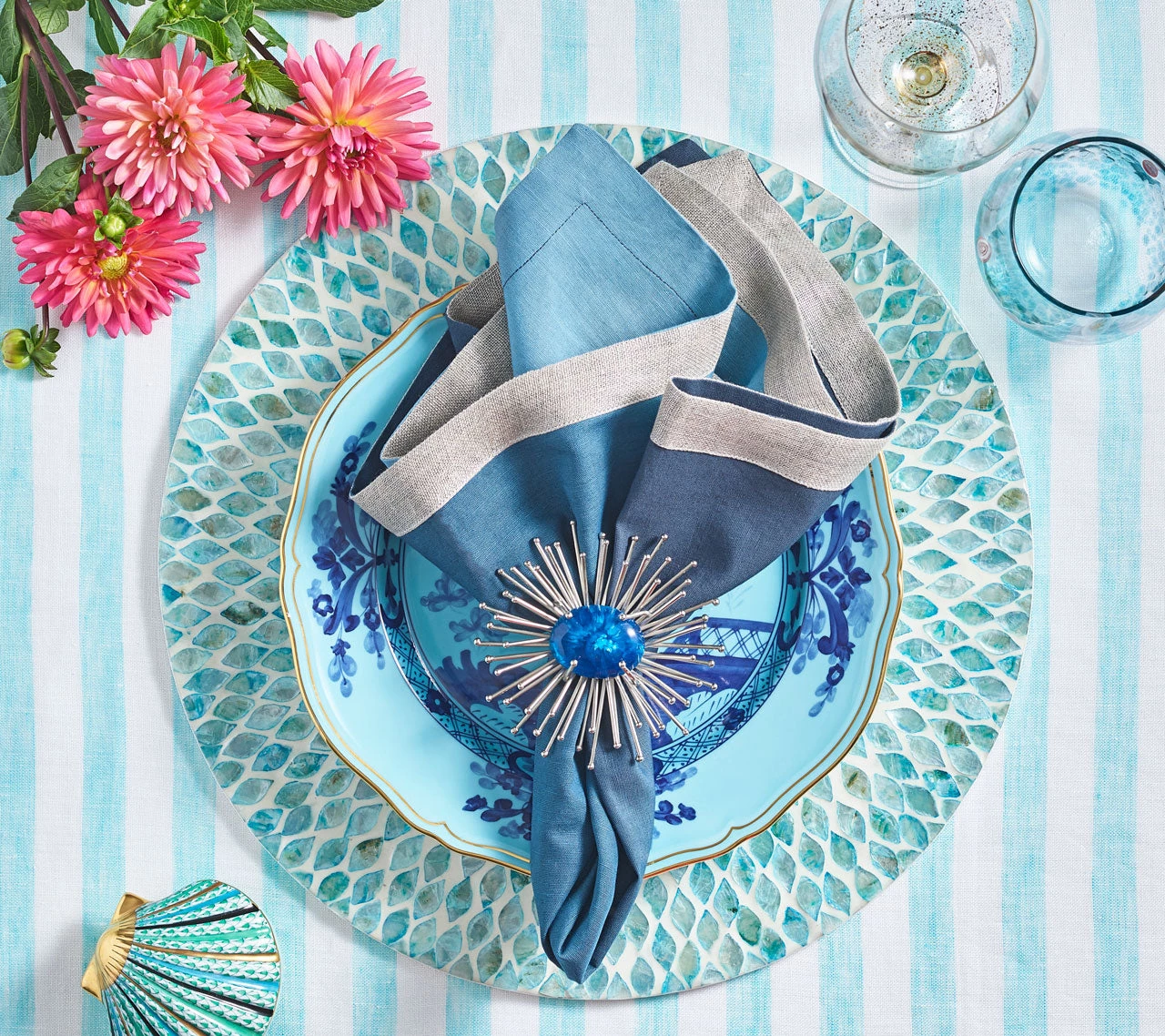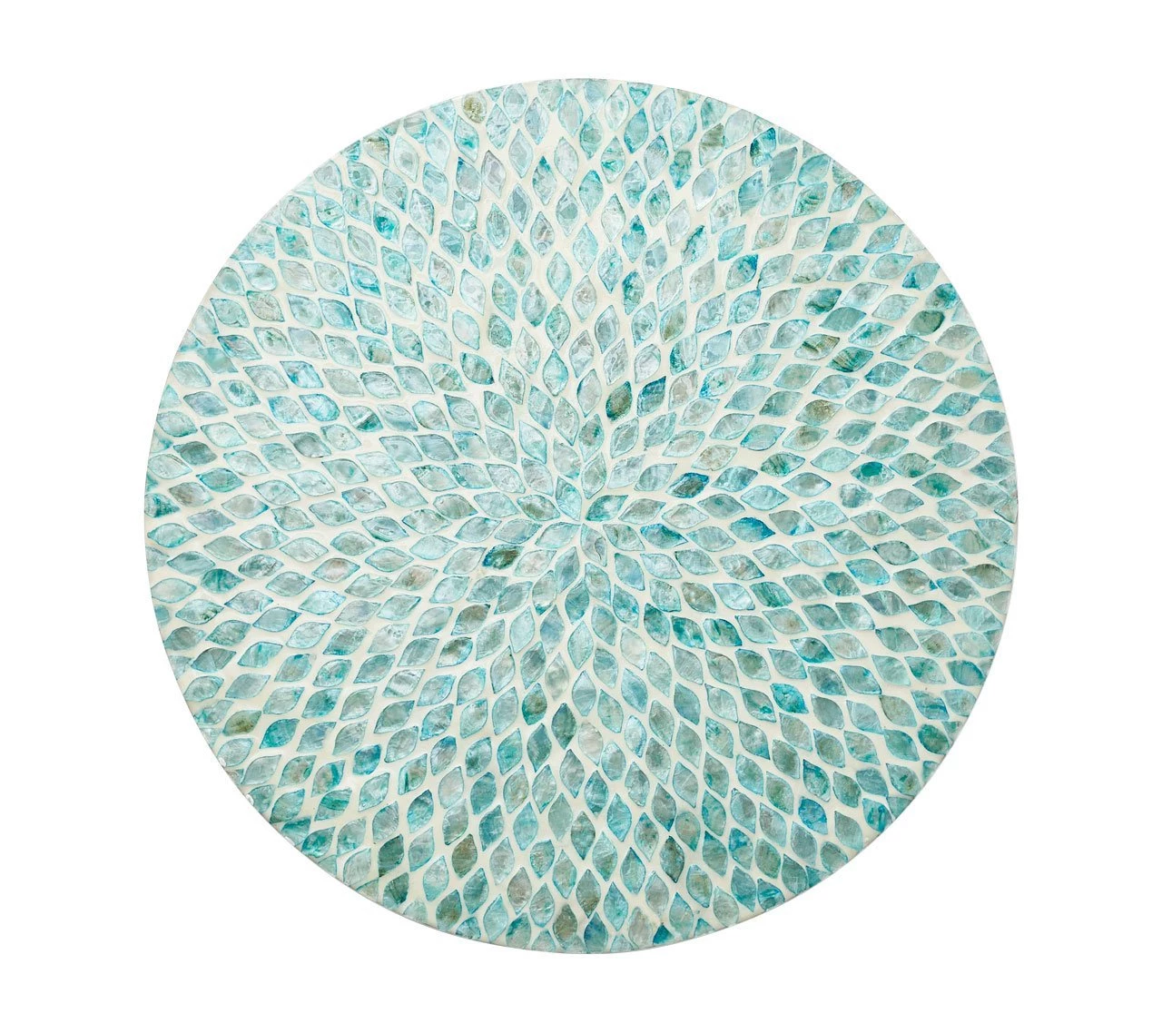 Perfect for a midsummer soiree the Marquis Placemat in seafoam is a sophisticated take on summer entertaining. Featuring capiz shells that are cooked in a unique process to obtain a gentle hue, then hand-cut and inlaid in a radiating pattern to form the Marquis Placemat. This solely hand-crafted placemat allows for variation, each placemat is one-of-a-kind.