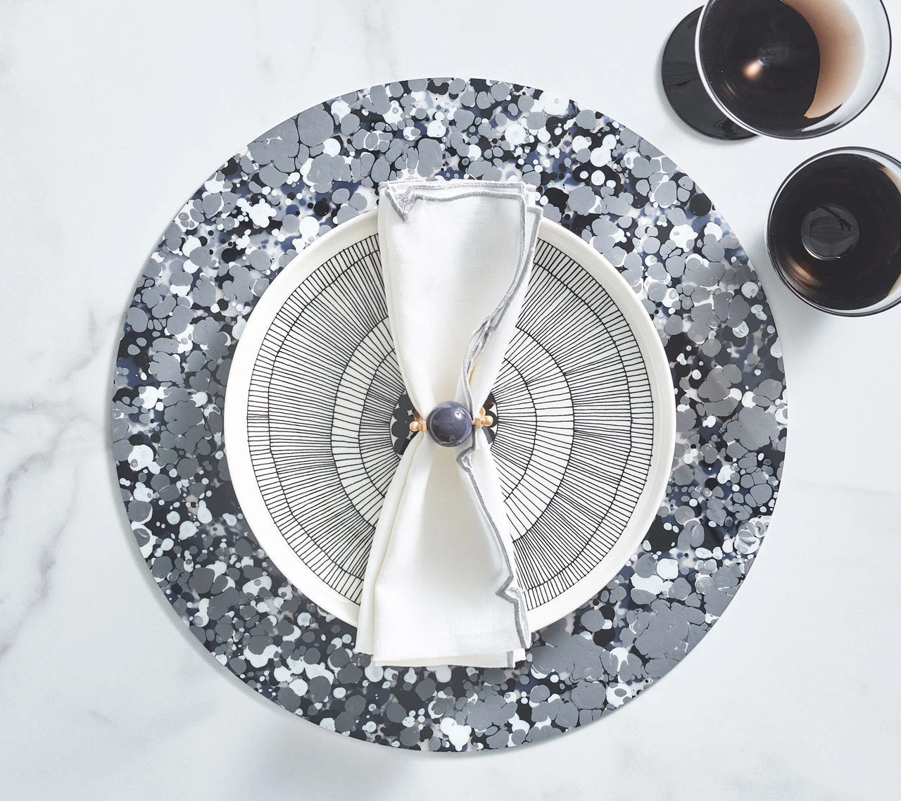 Perfect for outdoor entertaining, the Splash Placemat works in any setting. The acrylic Splash Placemat features splattered hand-poured resin that is resilient and is easy to wipe clean. Available in white/blue or gray/black.