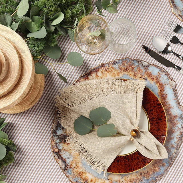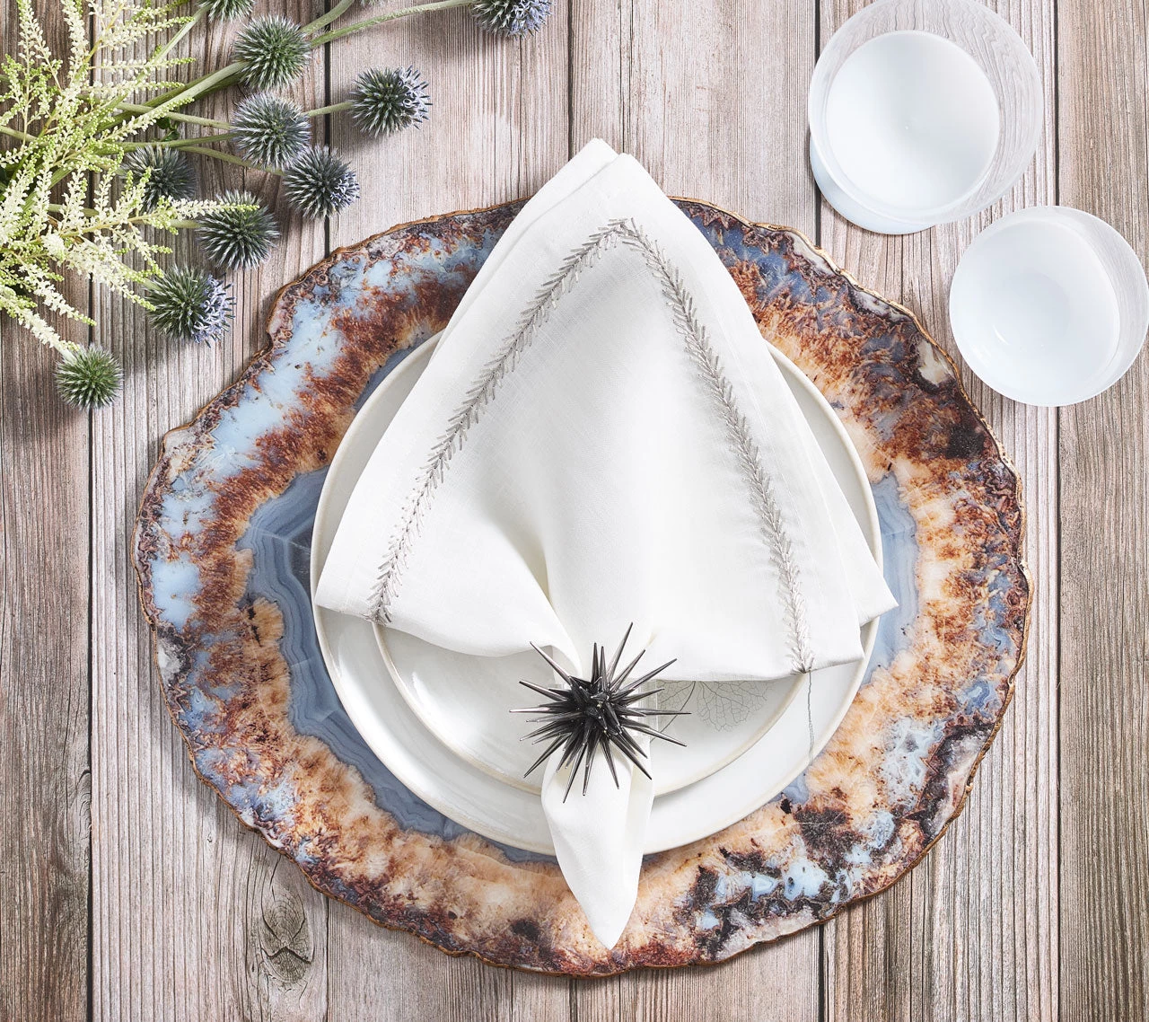 The Strata Placemat is inspired by the striking bands created by distinct layers of sedimentary rock found in the earth’s crust. The organic shape of the Strata Placemat and the free-flowing bands of golds mixed with blue-gray tones mimic the naturally occurring striations. This acrylic placemat is easy to wipe clean and features a cork backing.