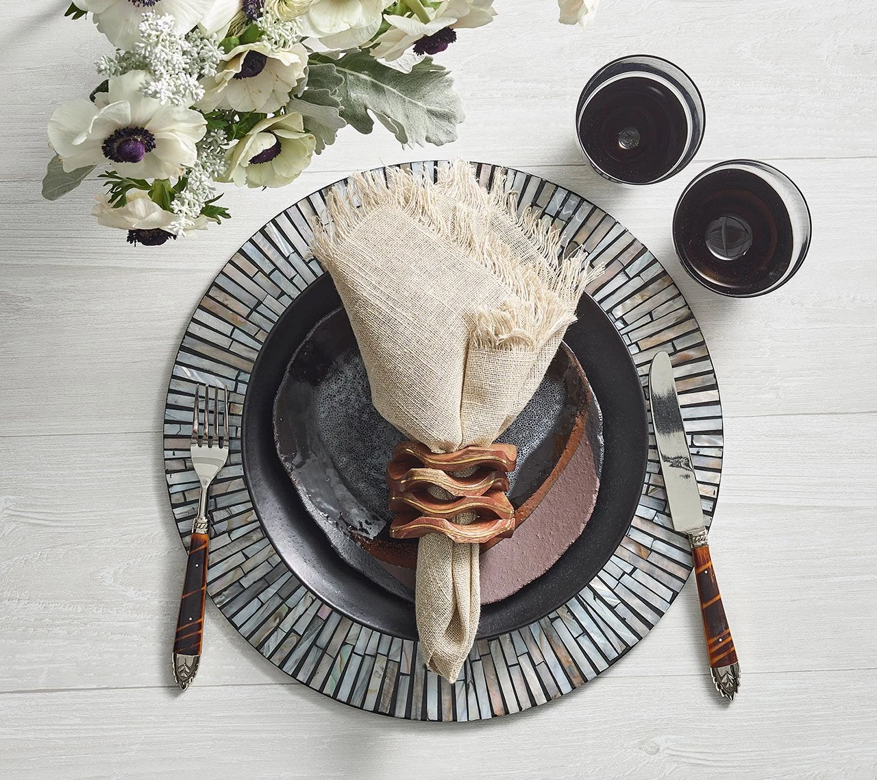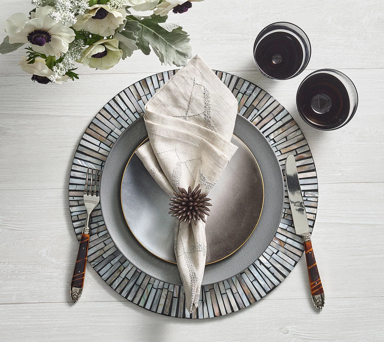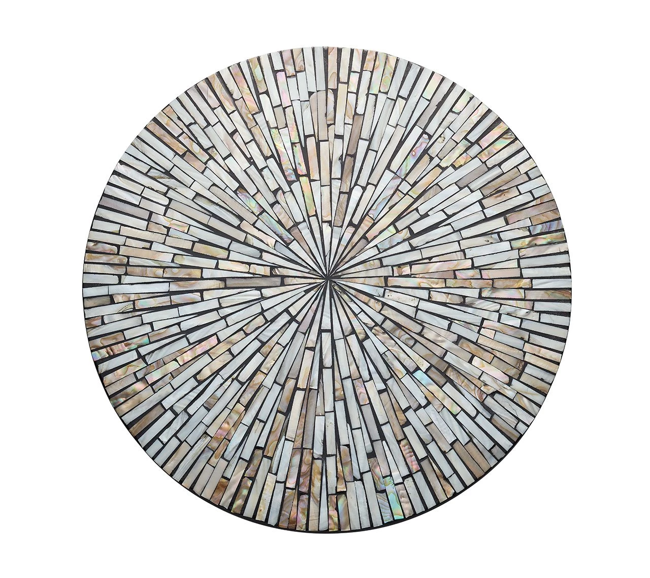 Tahiti, French Polynesia’s largest and most diverse island, is known for its tranquil ocean waters and host of serene lagoons. Evocative of this soothing atmosphere, the Tahiti Placemat features natural materials arranged in a fluid style. Rare mother-of-pearl pieces are hand-dyed natural gray and taupe hues and hand-cut to achieve an artisanal look.