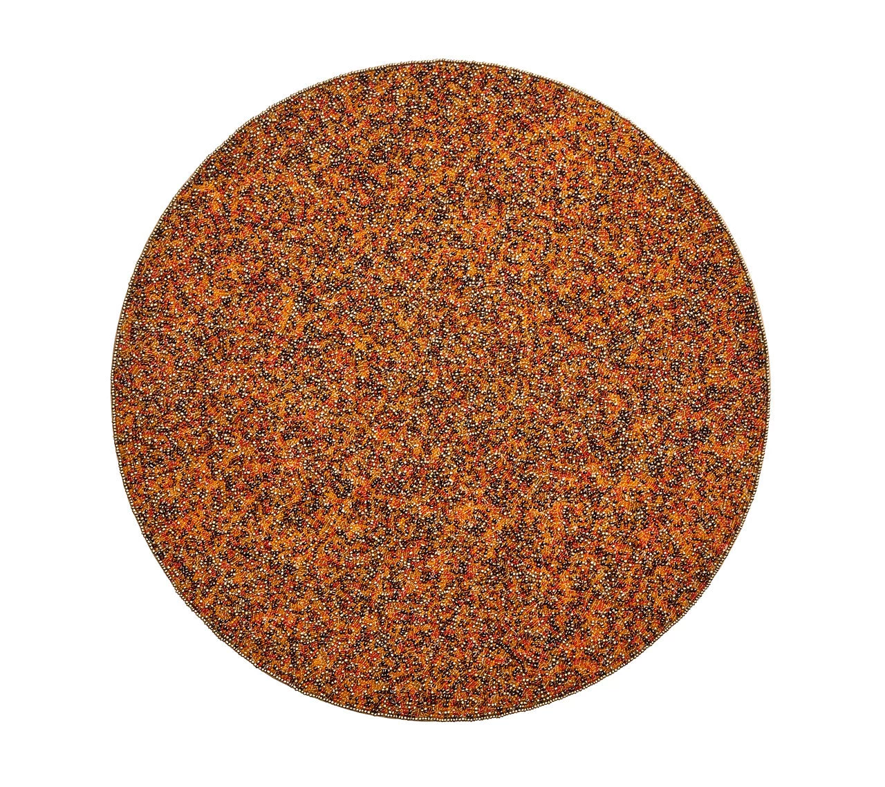 Named for a traditional style of beading, the round, beaded Vermicelli Placement is hand-beaded with incredible attention to detail. Customarily a circular design, this beaded stitch is an elevated technique and translates beautifully as an adornment for the table. The amber, beaded, round placemat adds a touch of sparkle to a quiet dinner or enhances an already festive table.