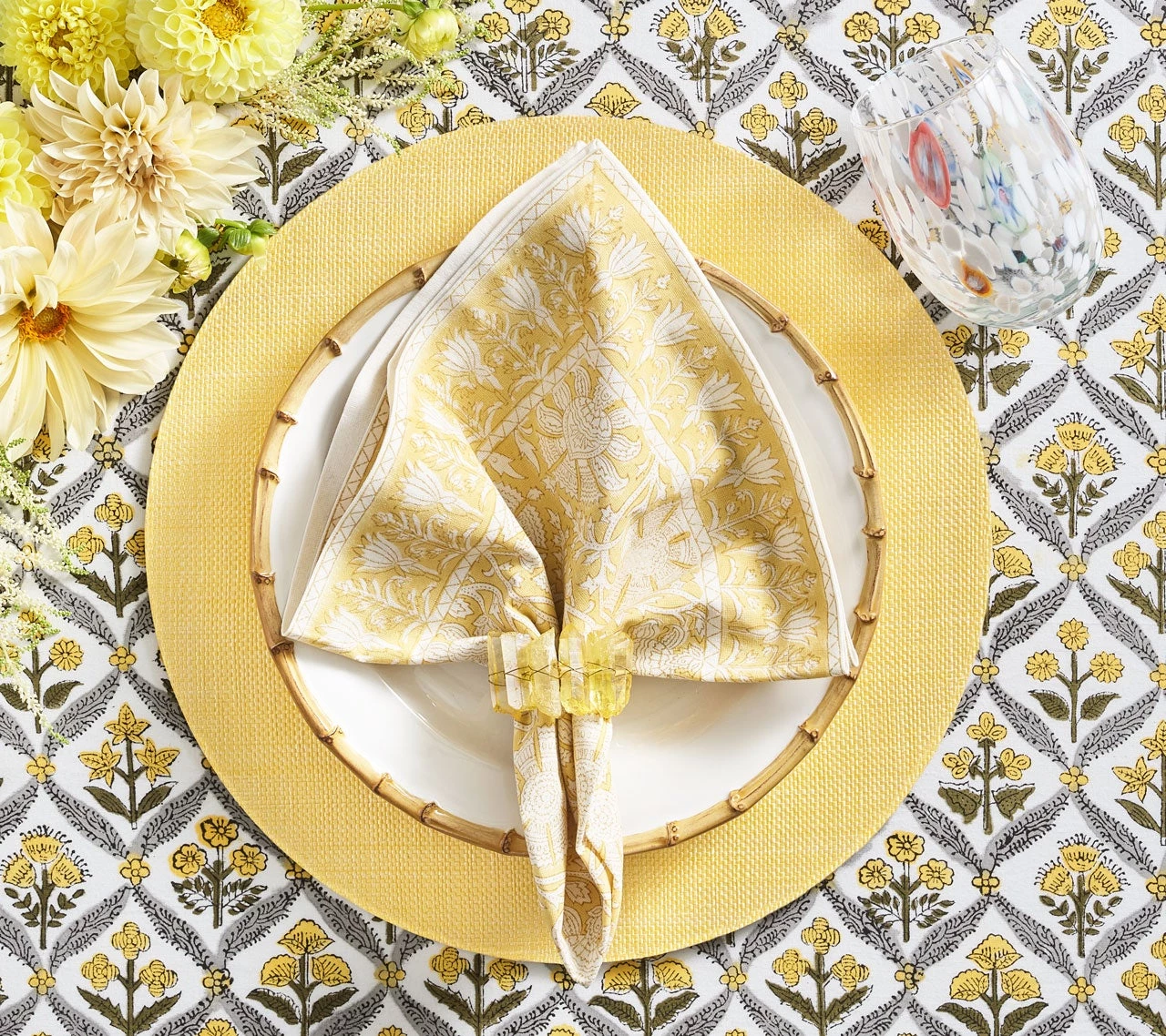 Inspired by the grounded patterns found throughout the Provence region of southern France, the cloth Provence Napkin features a playful yellow pattern. Pair with the coordinating tablecloth for a uniform table or mix and match patterns for truly a country-inspired setting.
