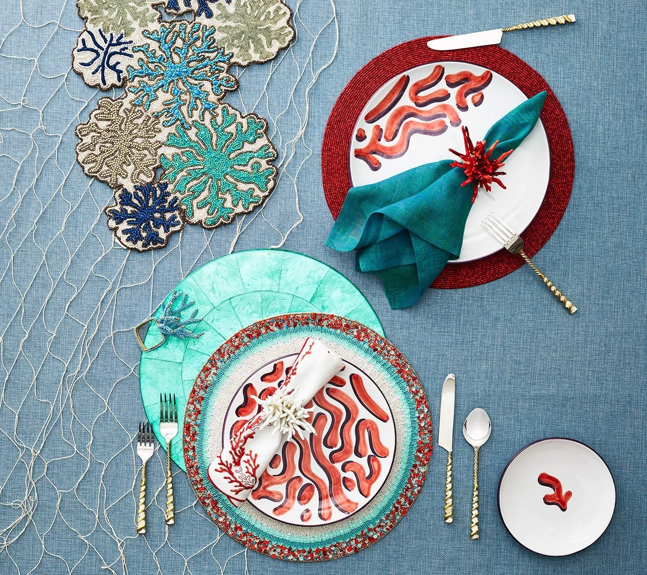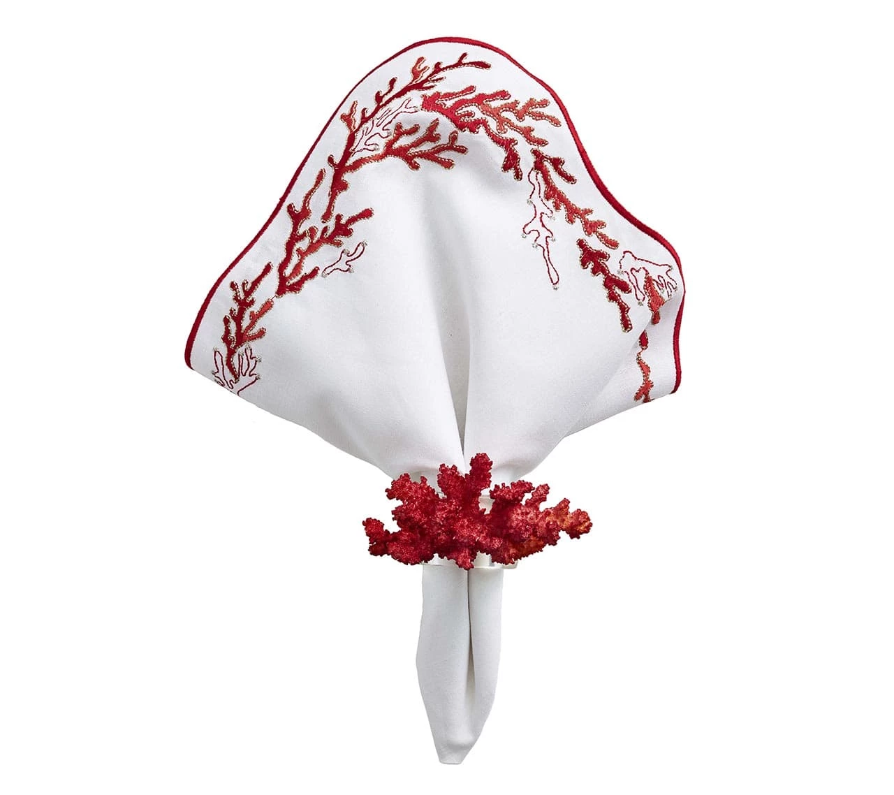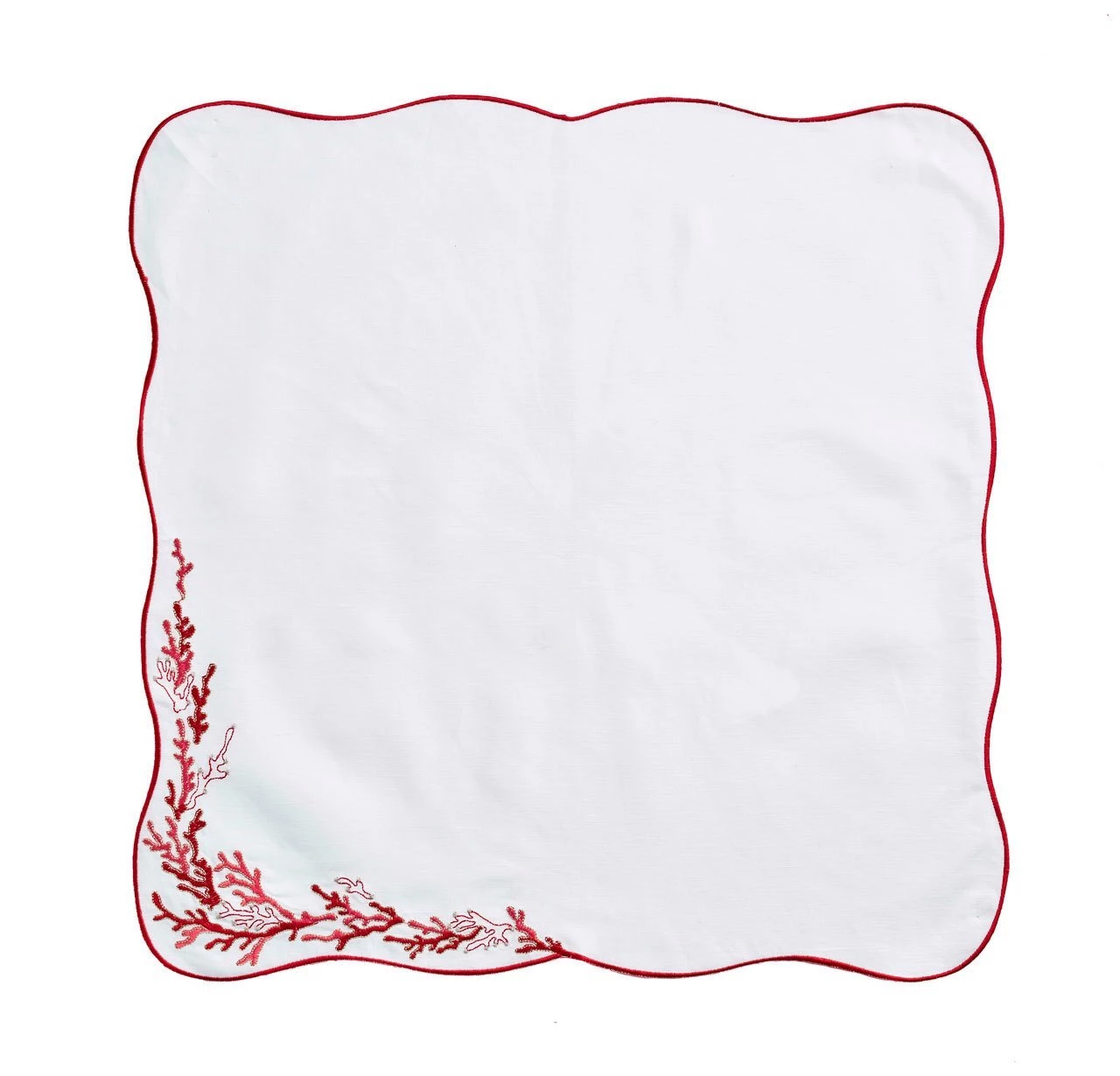 With a wave-like shaped embroidered edge, a delicate coral reef design dresses up these napkins for a graceful oceanic table. Available in three colors.