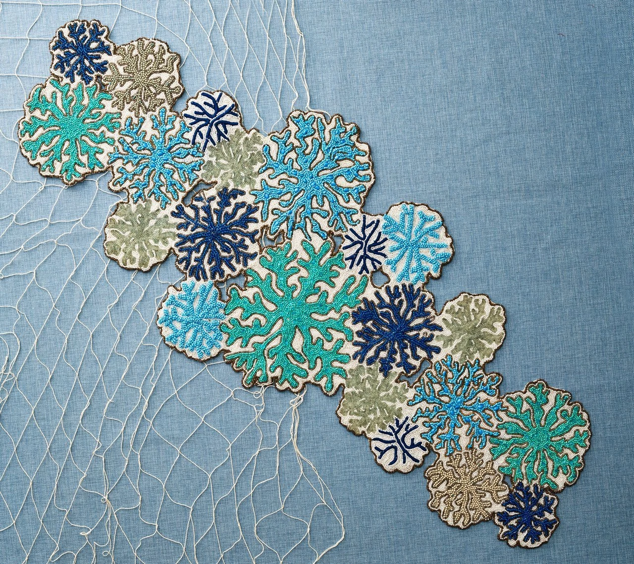 Kim Seybert’s Round Coral beaded table runner in turquoise, white and blue is hand beaded with a 100% cotton backing. The Coral Beaded Table Runner is a great centerpiece for a summer, beach or coastal themed table setting.