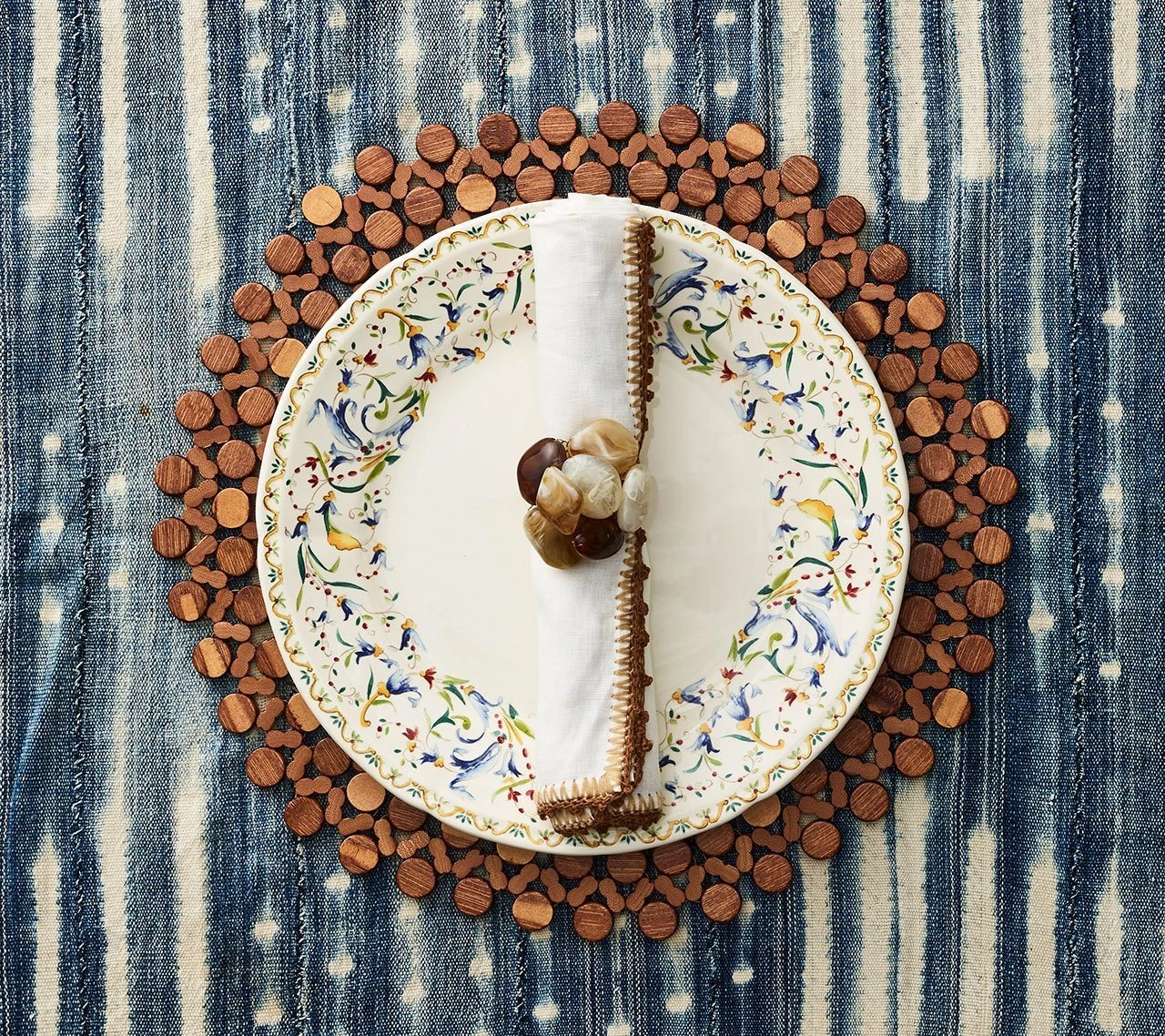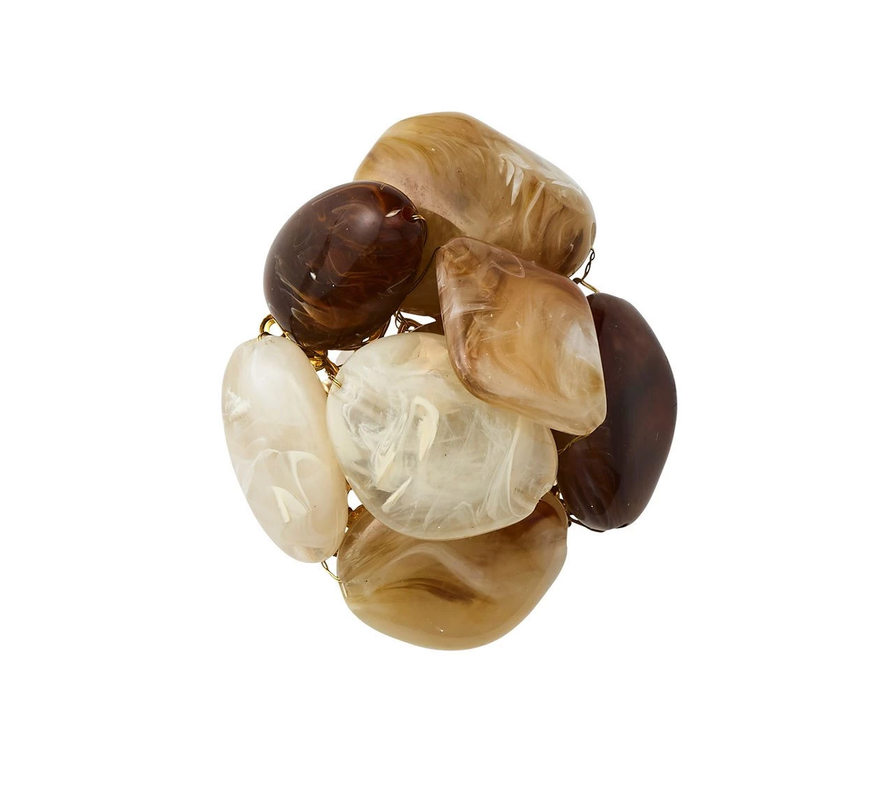The Sea Stone Napkin Ring in beiges and browns feature natural hues of resin stones set in clusters. These organic napkin rings are reminiscent of tumbled stones found upon the shore. Arranged at random, the stones are mounted on a beautifully beaded napkin ring. These elegant beaded napkin rings are the perfect addition to a modern rustic setting.