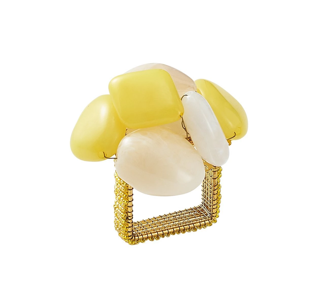 The Sea Stone Napkin Ring features sunny shades of yellow andÊcream resin stones set in clusters. These summery napkin rings are reminiscent of tumbled stones found upon the shore. Arranged at random, the stones are mounted on a beautifully beaded napkin ring. These beaded napkin rings are the perfect addition to a bright and cheery table.