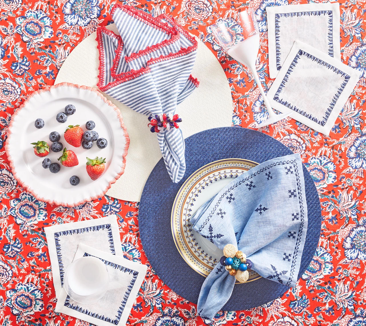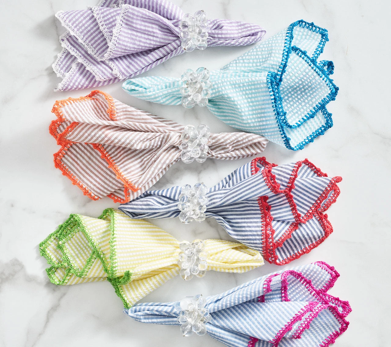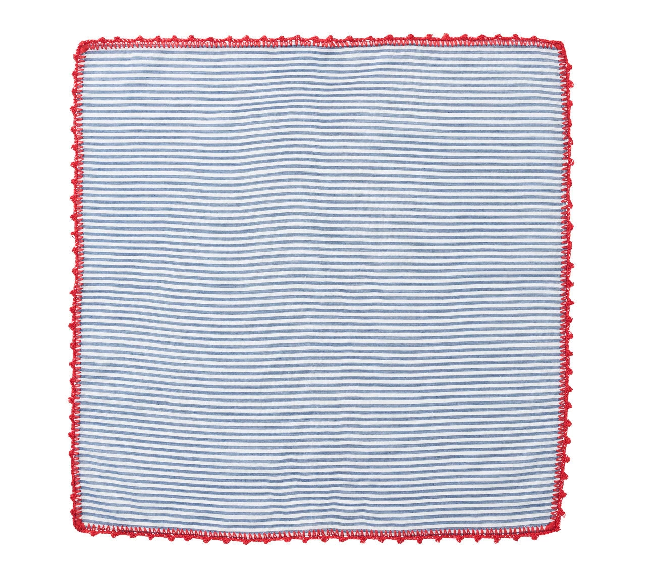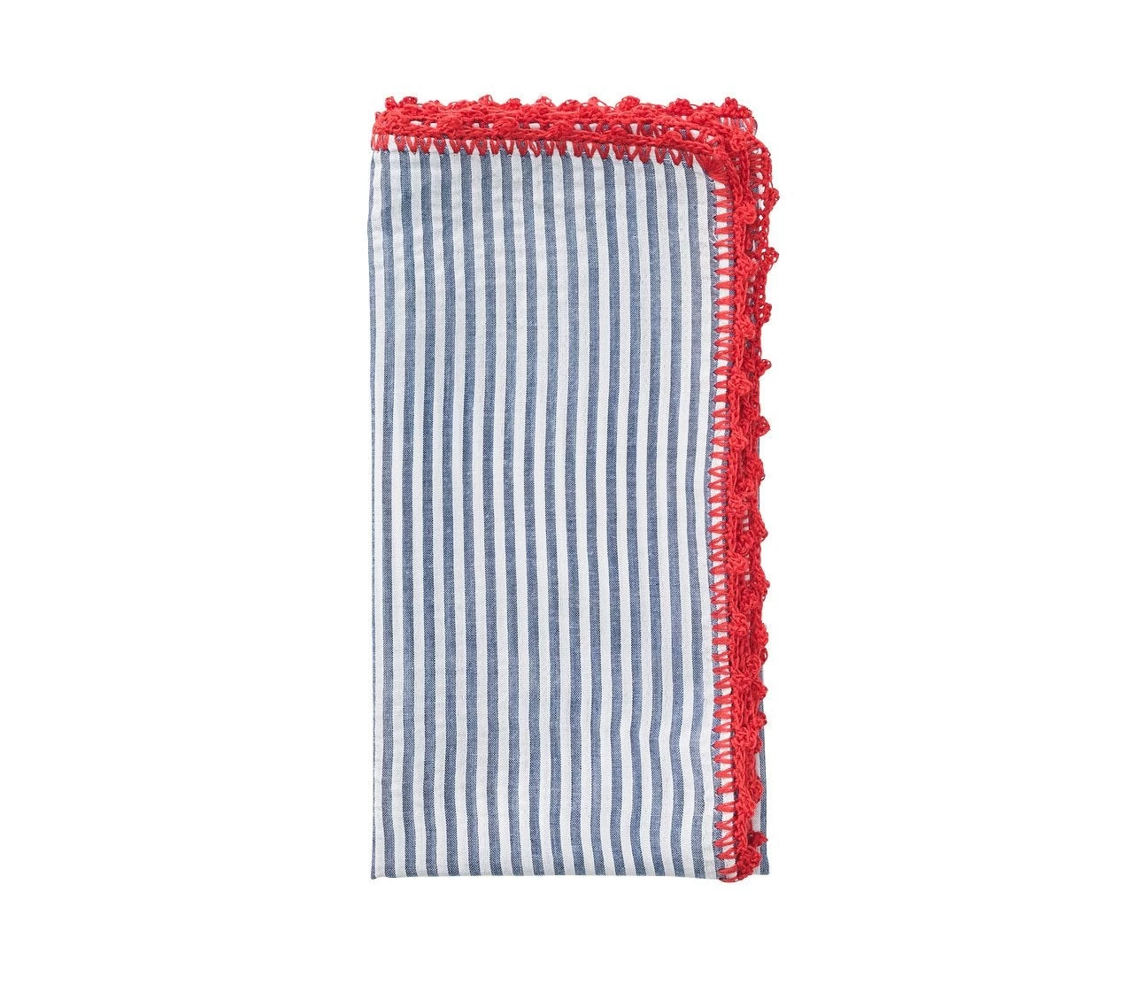 The cotton Seersucker Napkin is the perfect summertime entertaining staple. Featuring a slack-tension weave results in a crinkled cotton fabric with a puckered look. The navy striped cotton napkin features a contrasting bright red, hand-crocheted edge. The napkin is wrinkled by nature which allows for easy care.