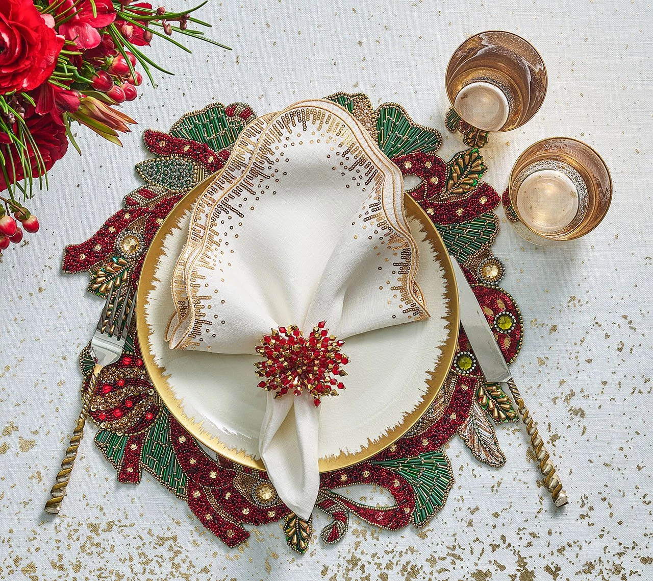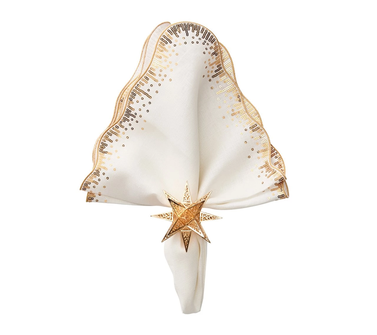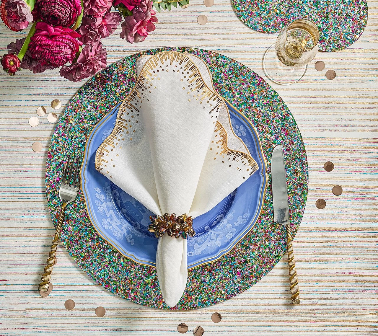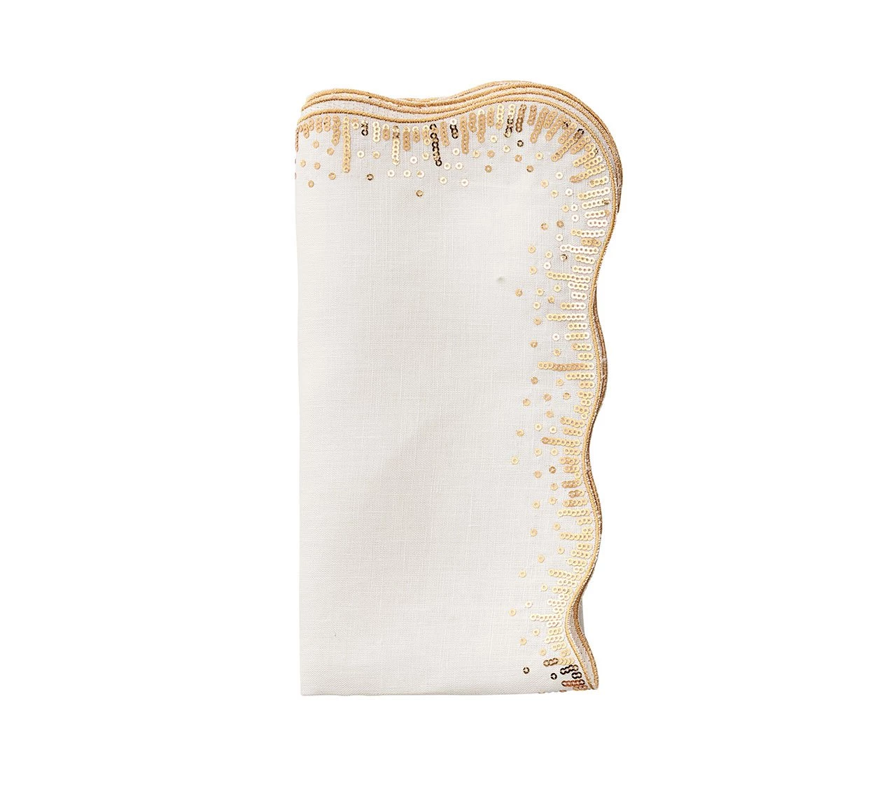The undulating metallic gold sequins on the Sequin Spray Napkin create a festive effect on the crisp white linen background. A festive approach to a classic napkin, the Sequin Spray adds a touch of elegance to any holiday table.