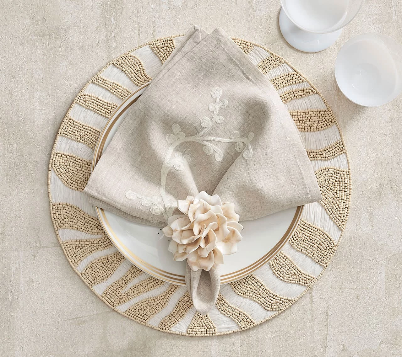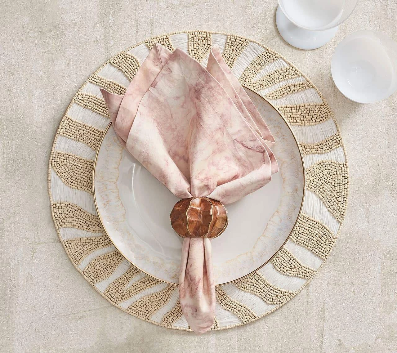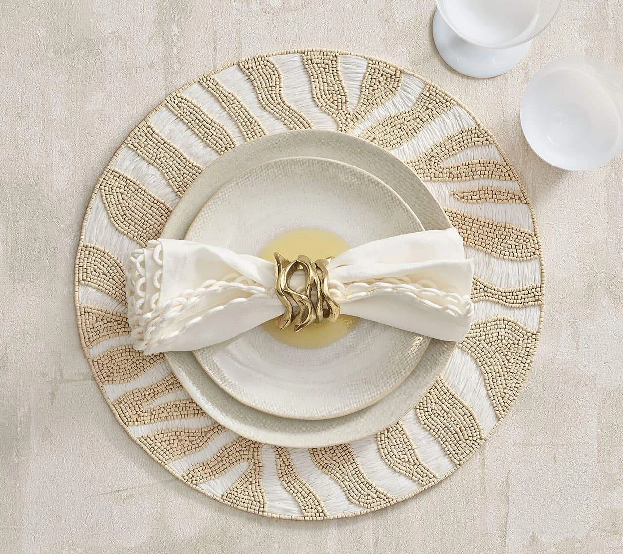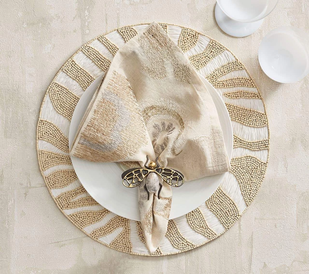 The round, beaded Serengeti Placemat is a modern take on the time-honored zebra motif, inspired by the Great Migration in Africa. Natural and white beaded stripes replace the traditional striping found on the grazing zebra; the round, beaded Serengeti Placemat features bleached wooden beads that contrast with the stark white woven raffia.