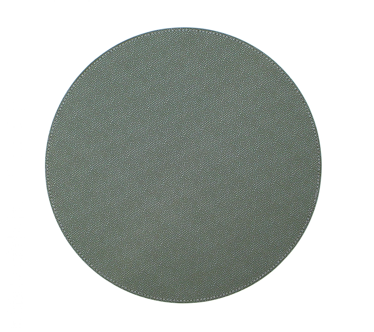 The round Shagreen Placemat in a serene sage green features a sophisticated faux granular hide. A beautiful replica of the traditional rough pattern, this round placemat is sleek and elegant. The soft sage green completes this polished look. Perfect for everyday dining or for an lavish dinner party, these round placemats are easy to care for; simply wipe down before storing.