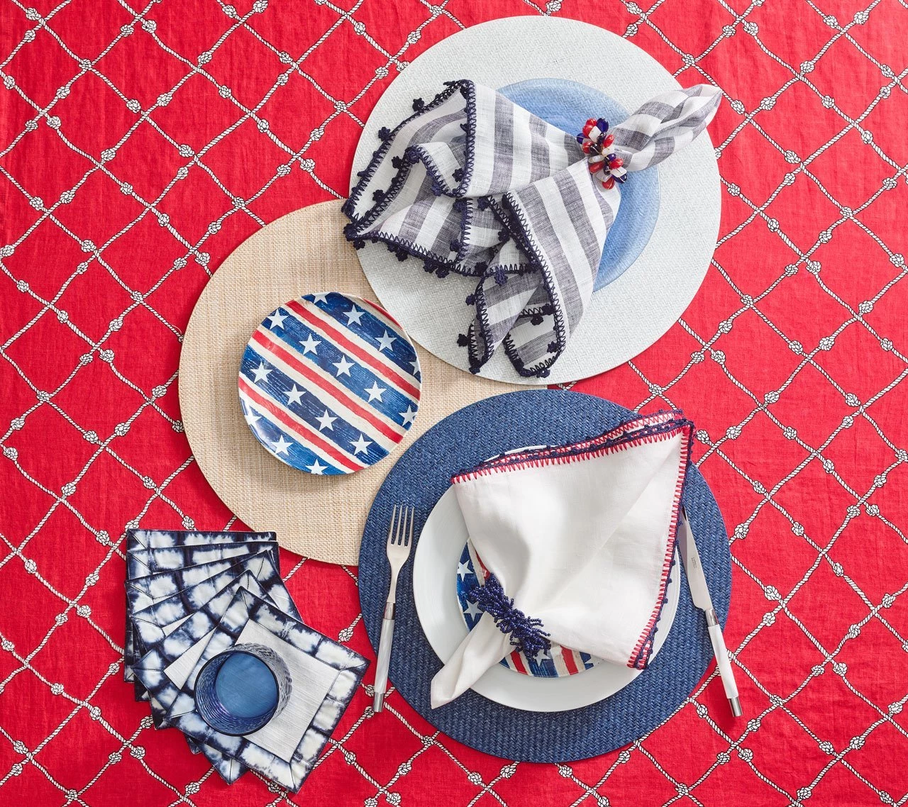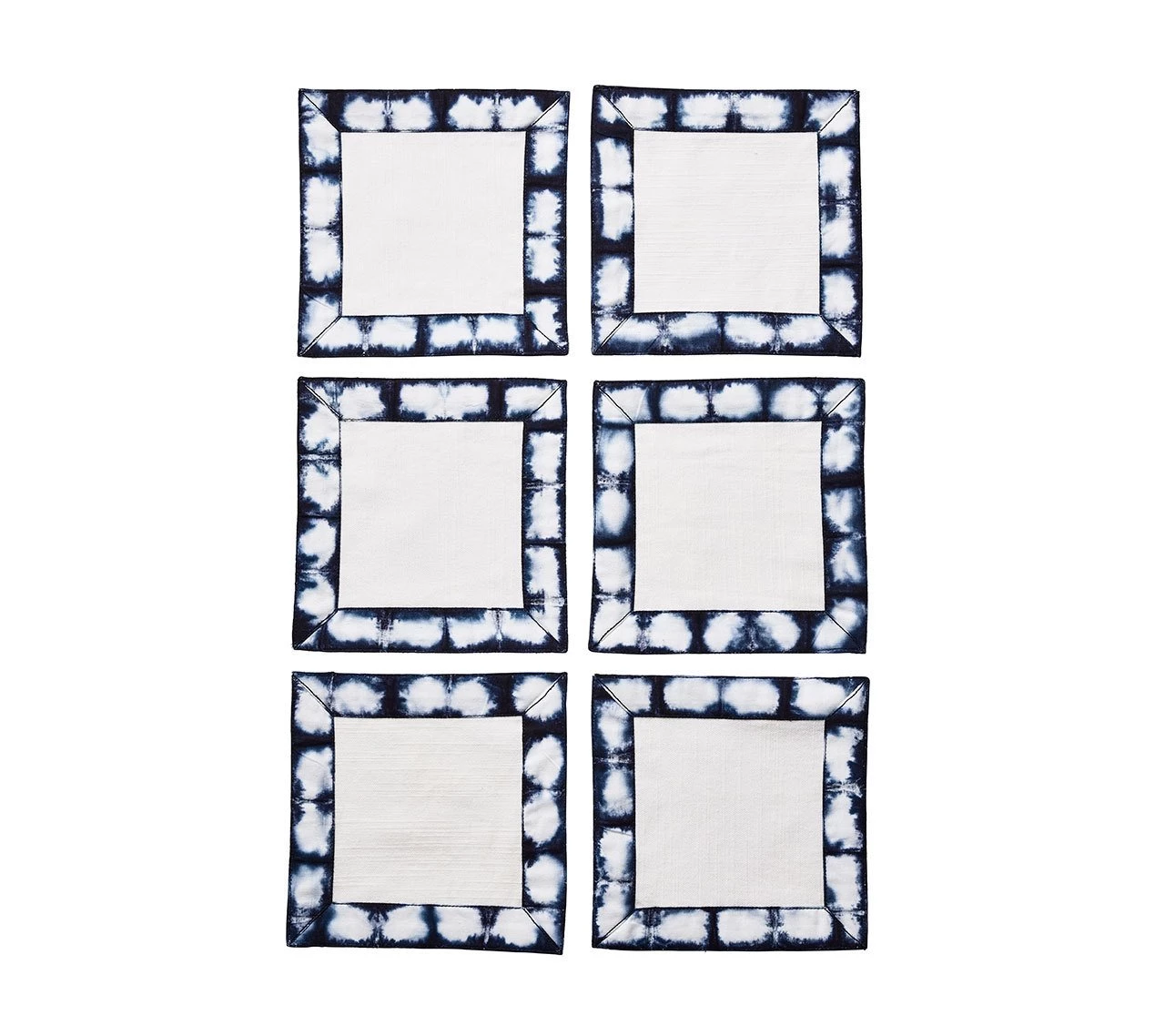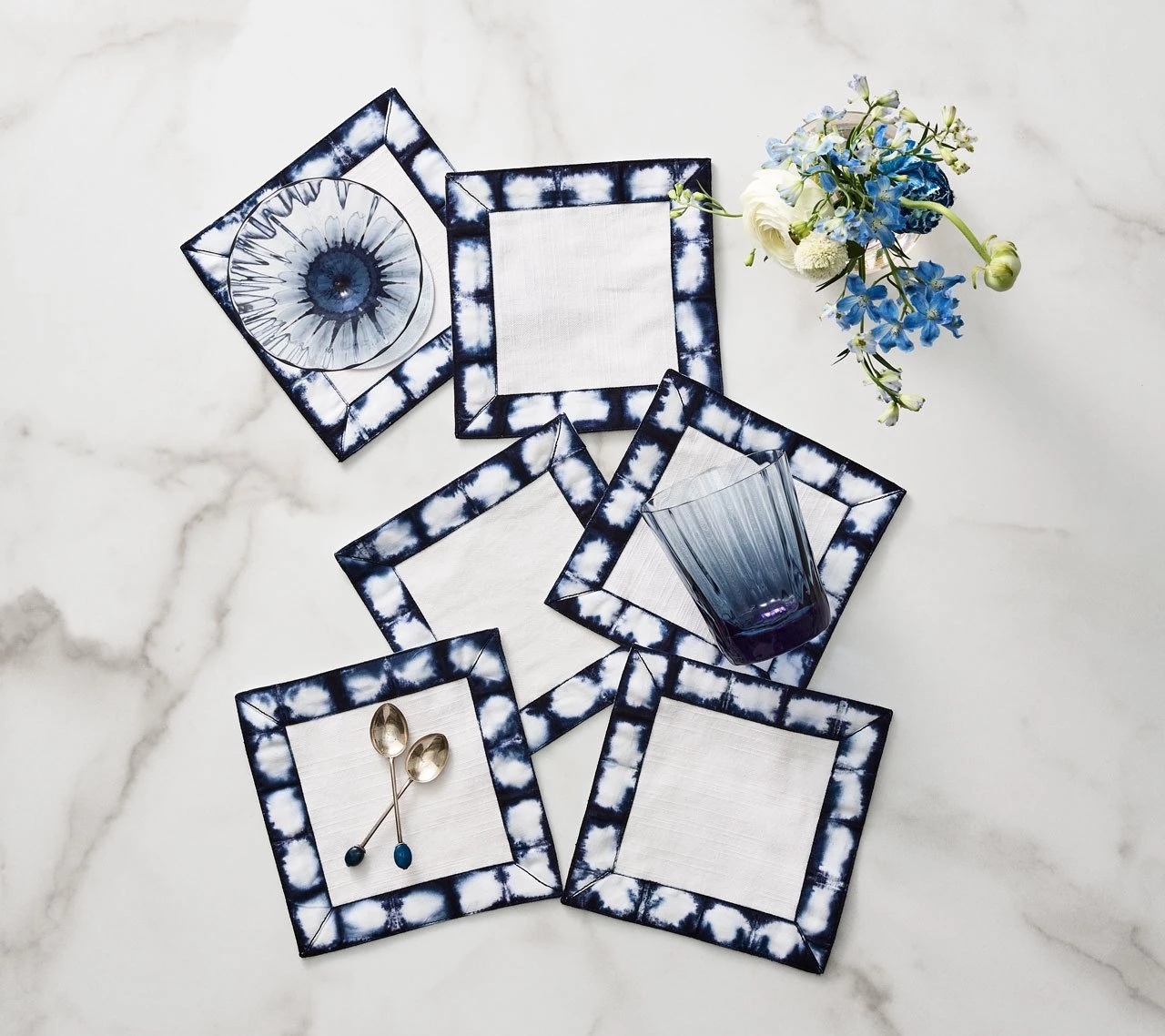 The Shibori Collection is a take on the Japanese “wring, squeeze, press” style of resist dying. Fabric is folded, crumpled, stitched and twisted before being dyed to create a three-dimensional motif. The cotton cocktail napkins feature a hand dyed and stitched border.