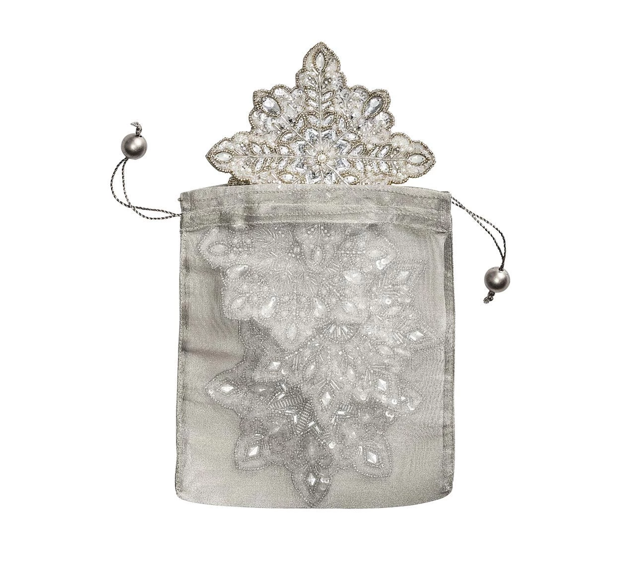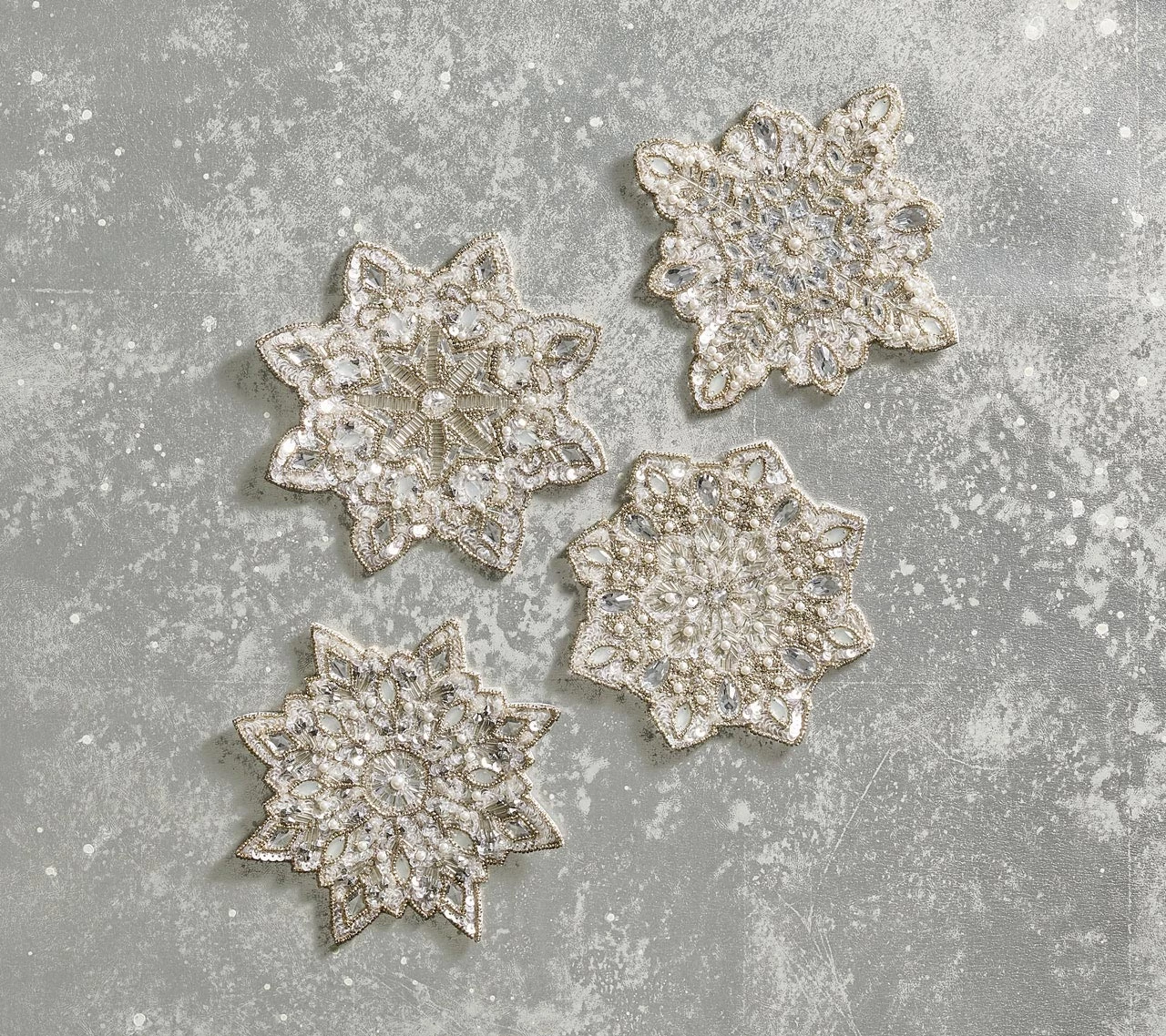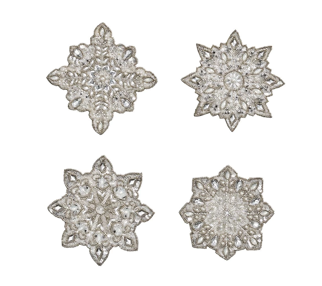 The Silver Snowflake Drink Coasters are beautifully beaded drink coasters inspired by the unique and complex shape of a snowflake. These geometric drink coasters feature glacial-like glass beading reminiscent of a winter wonderland! The dazzling glass beads form an interlacing snowflake pattern on these magnificent drink coasters. Sold as a set of four, these drink coasters are the perfect addition to an updated winter white setting.