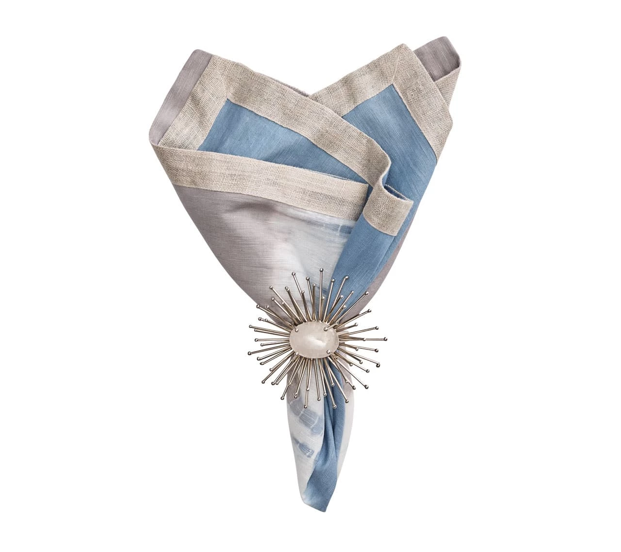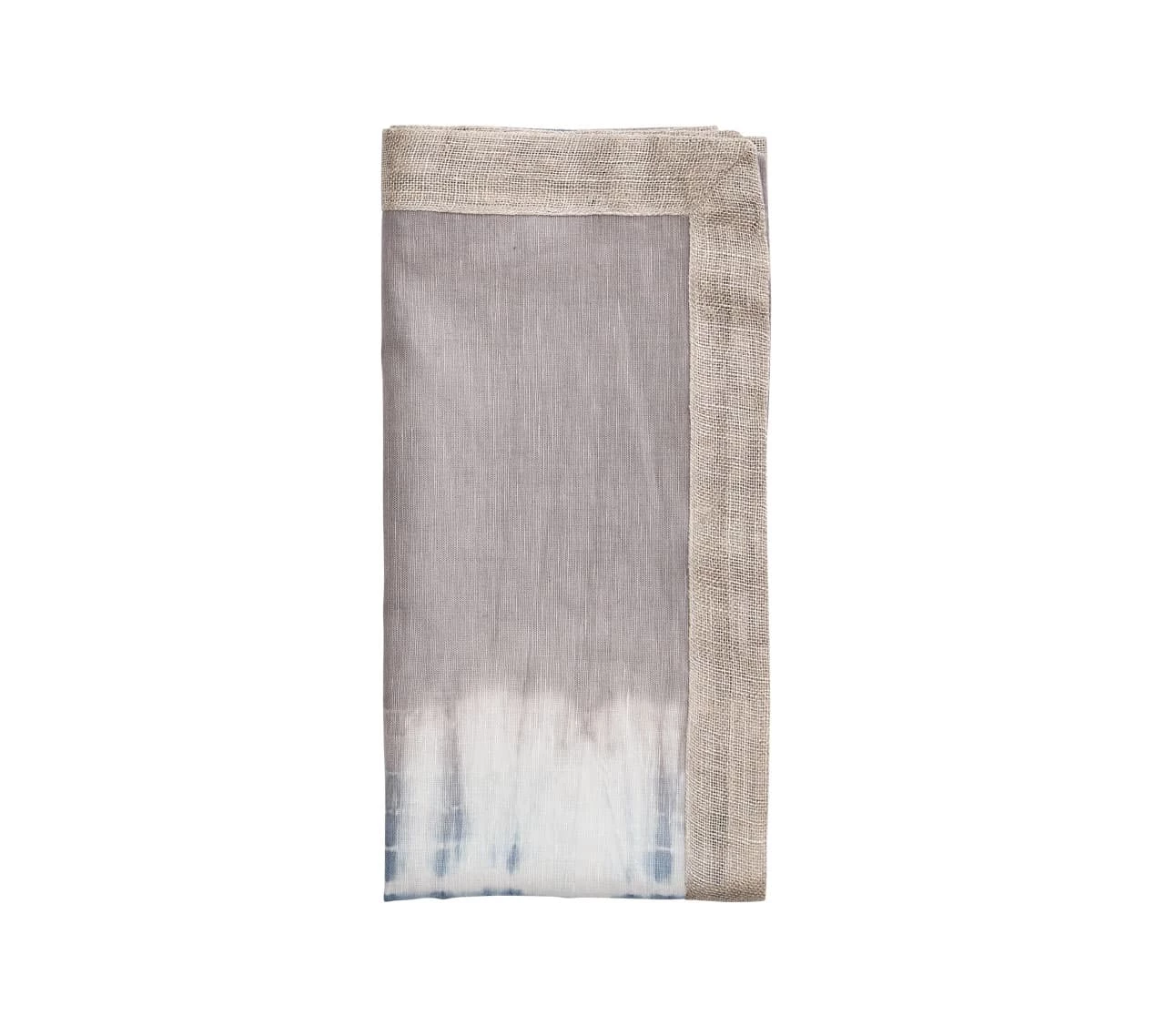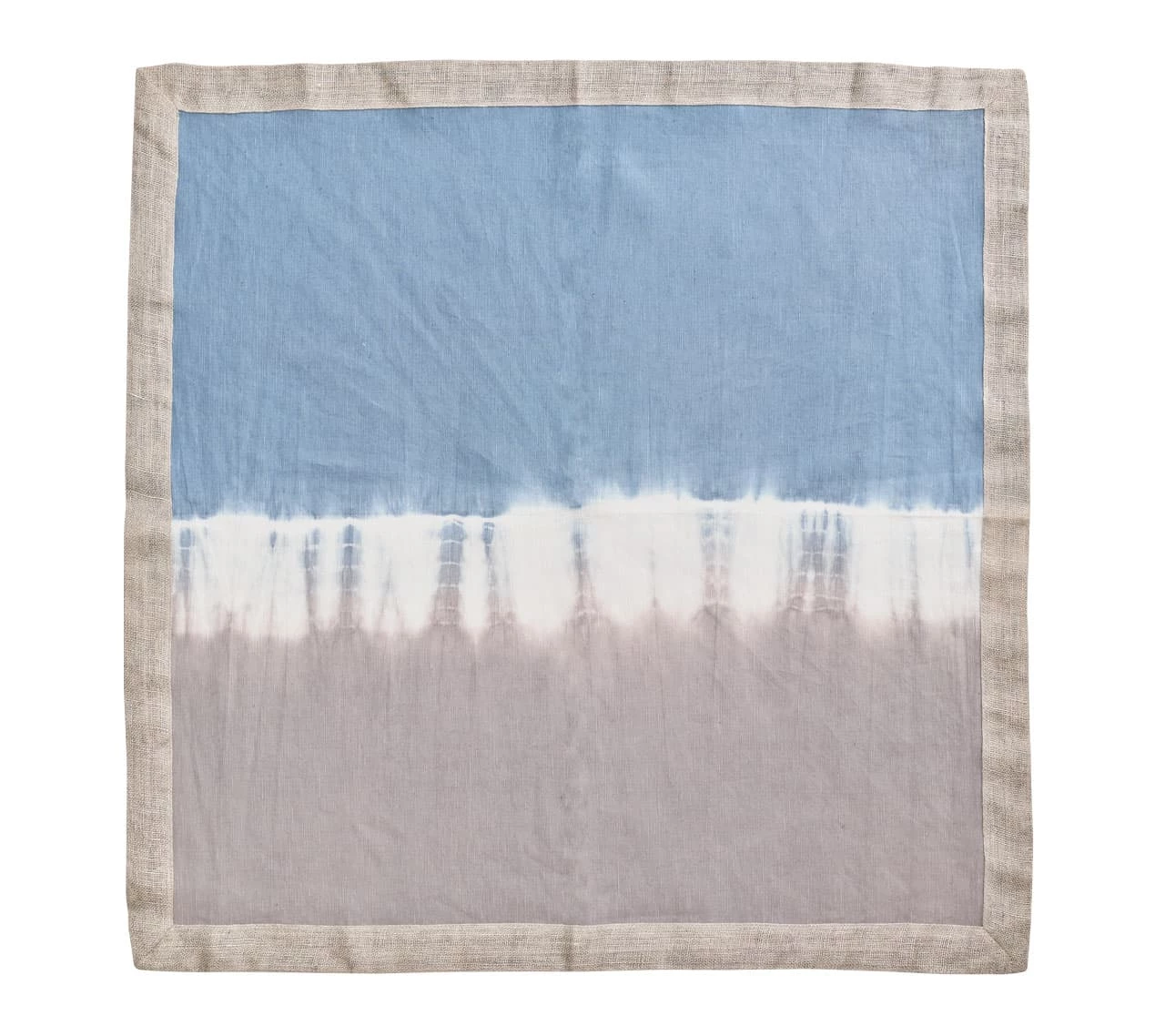 The linen Solstice Napkin in contrasting colors of blue and gray is created by pleating, tying and hand-dying the linen napkin. Each end of the linen napkin is dipped in a different color to create a tie-dyed effect. The unexpected pattern created on this linen napkin fits with a bohemian style tablescape or a vibrant celebration. These versatile linen napkins can be used year-round.