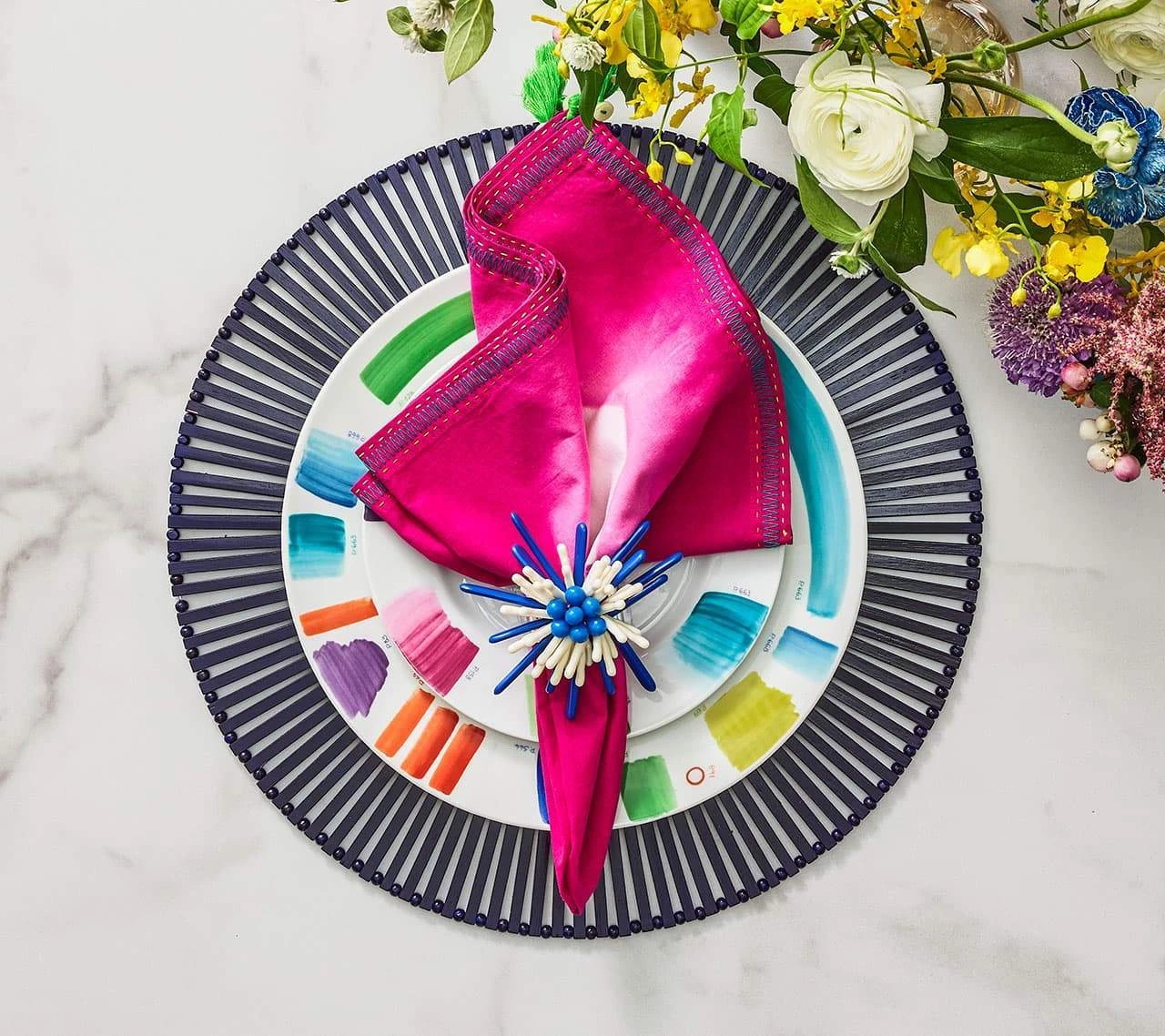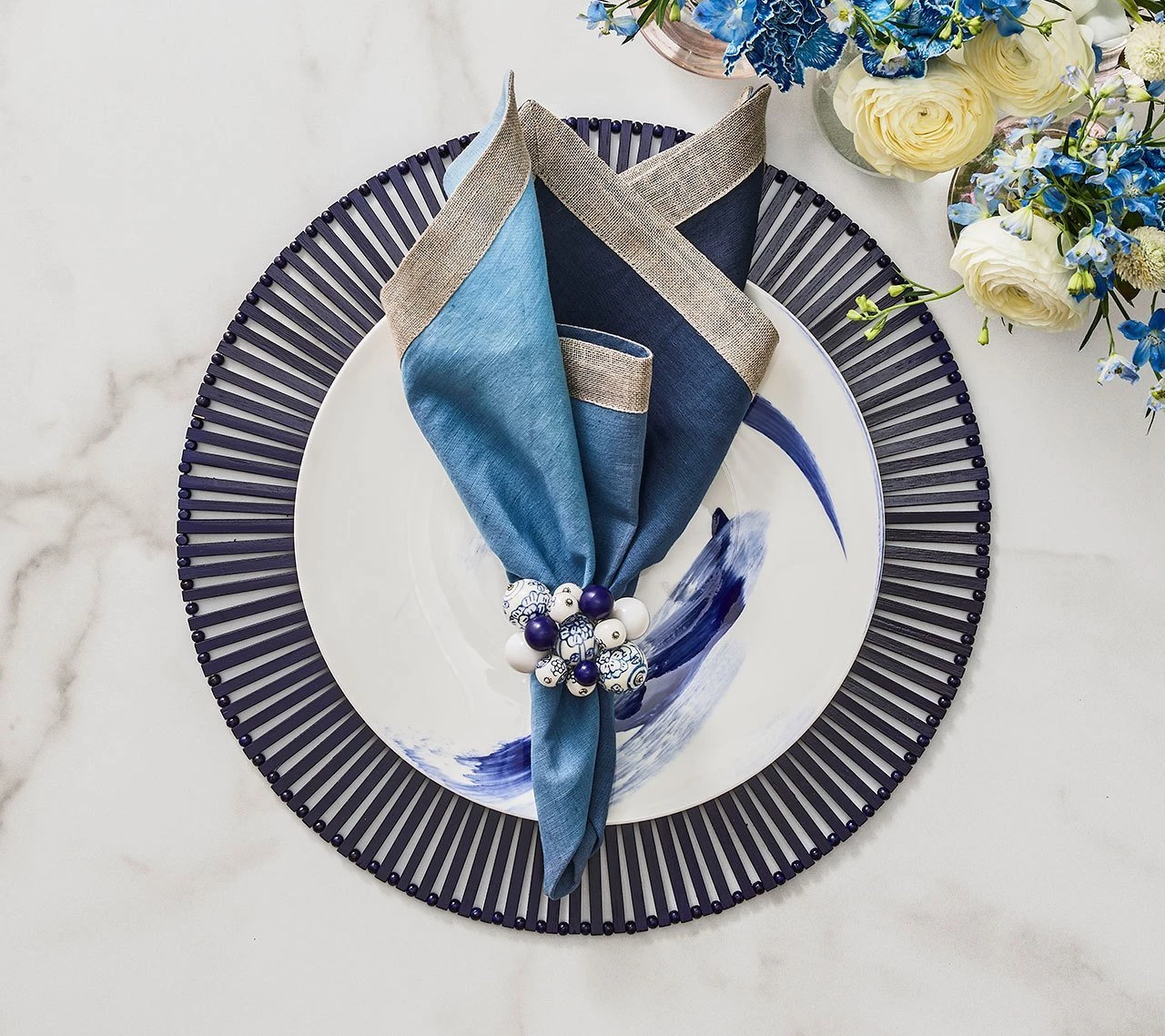The round Spoke Placemat in navy is a nod to the Eastern world with its hand-cut bamboo slats arranged in a geometric pattern. The bamboo slats are arranged by hand in this round bamboo placemat making it the perfect blend of clean, refined lines and natural organic elements. This navy bamboo placemat works well in any table setting from casual to refined dinners. Sold in sets of four placemats.
