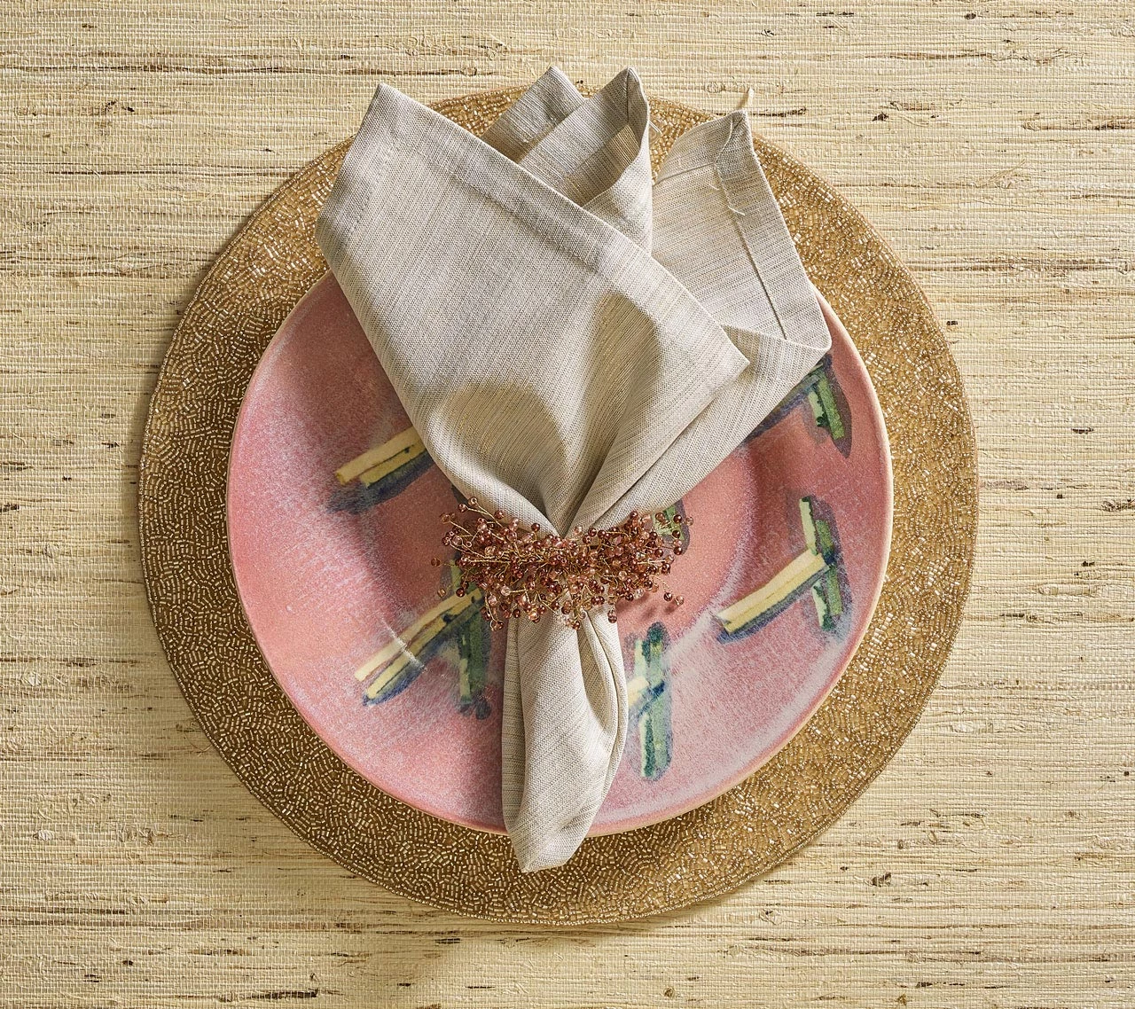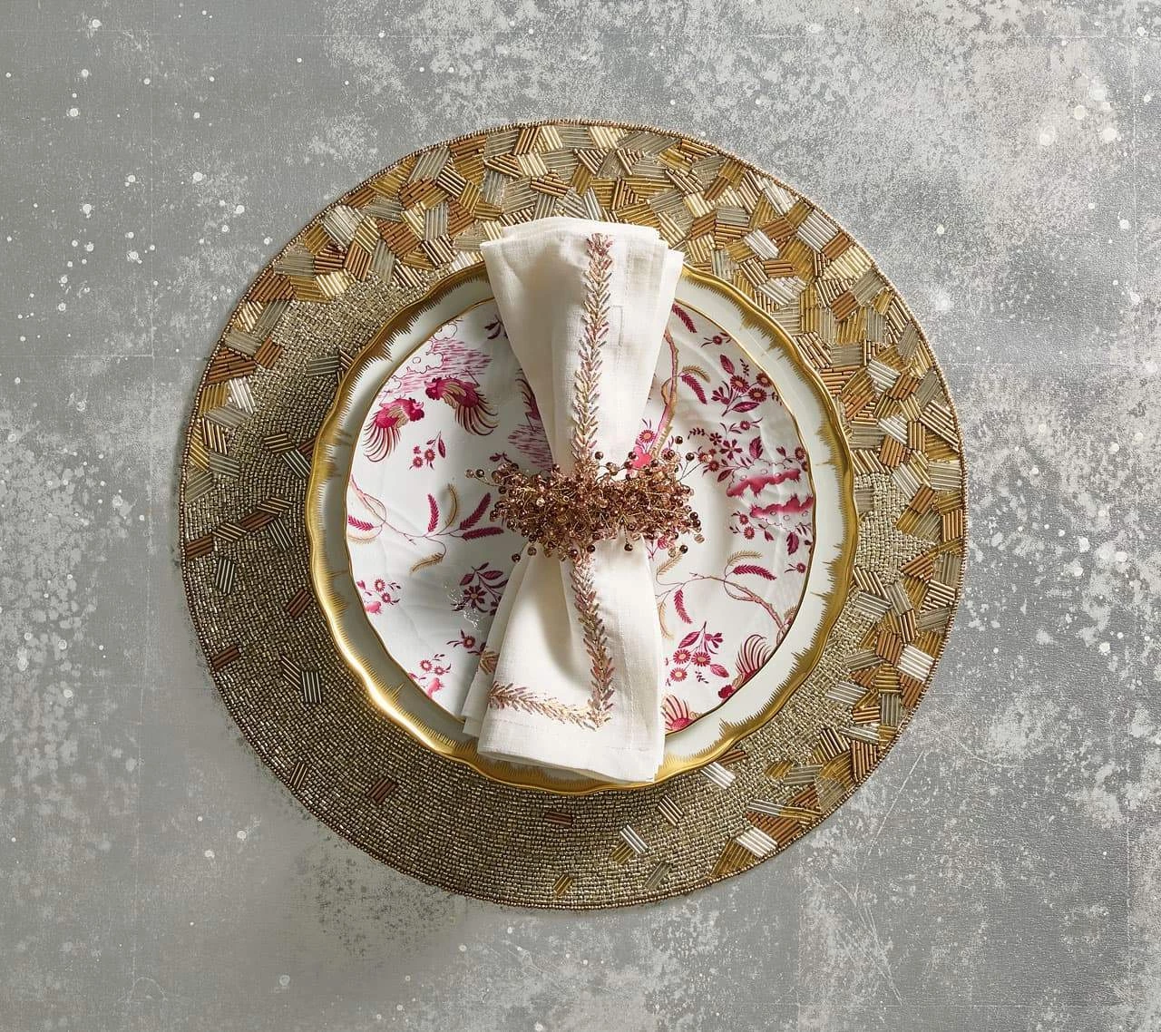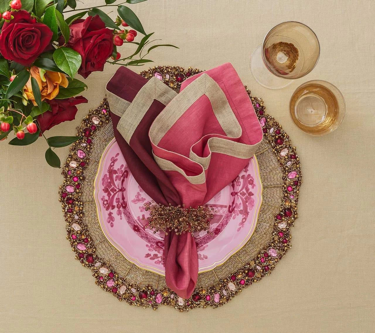 The Spray Napkin Ring features hand-attached, multi-colored glass beads in fall shades of berry. This berry-colored, beaded napkin ring is perfect for your fall or Thanksgiving table setting with its organic and metallic nature. The perfect addition to both a sophisticated or playful affair, these glass beaded napkin rings are sure to spark conversation.