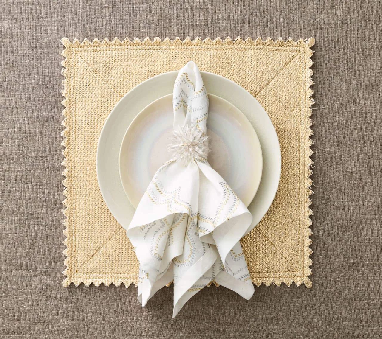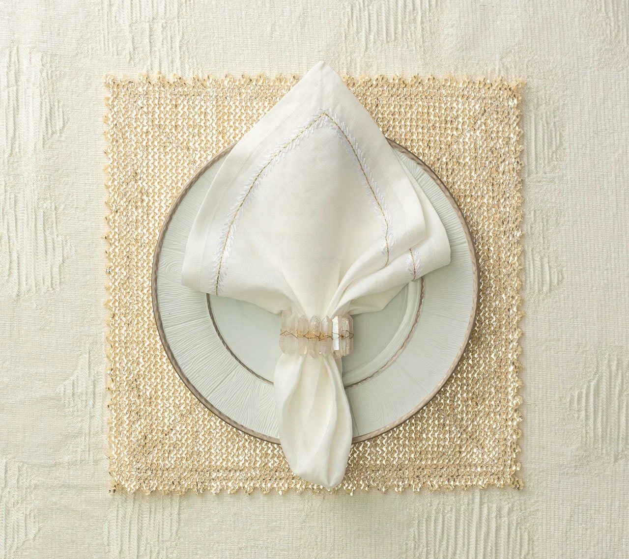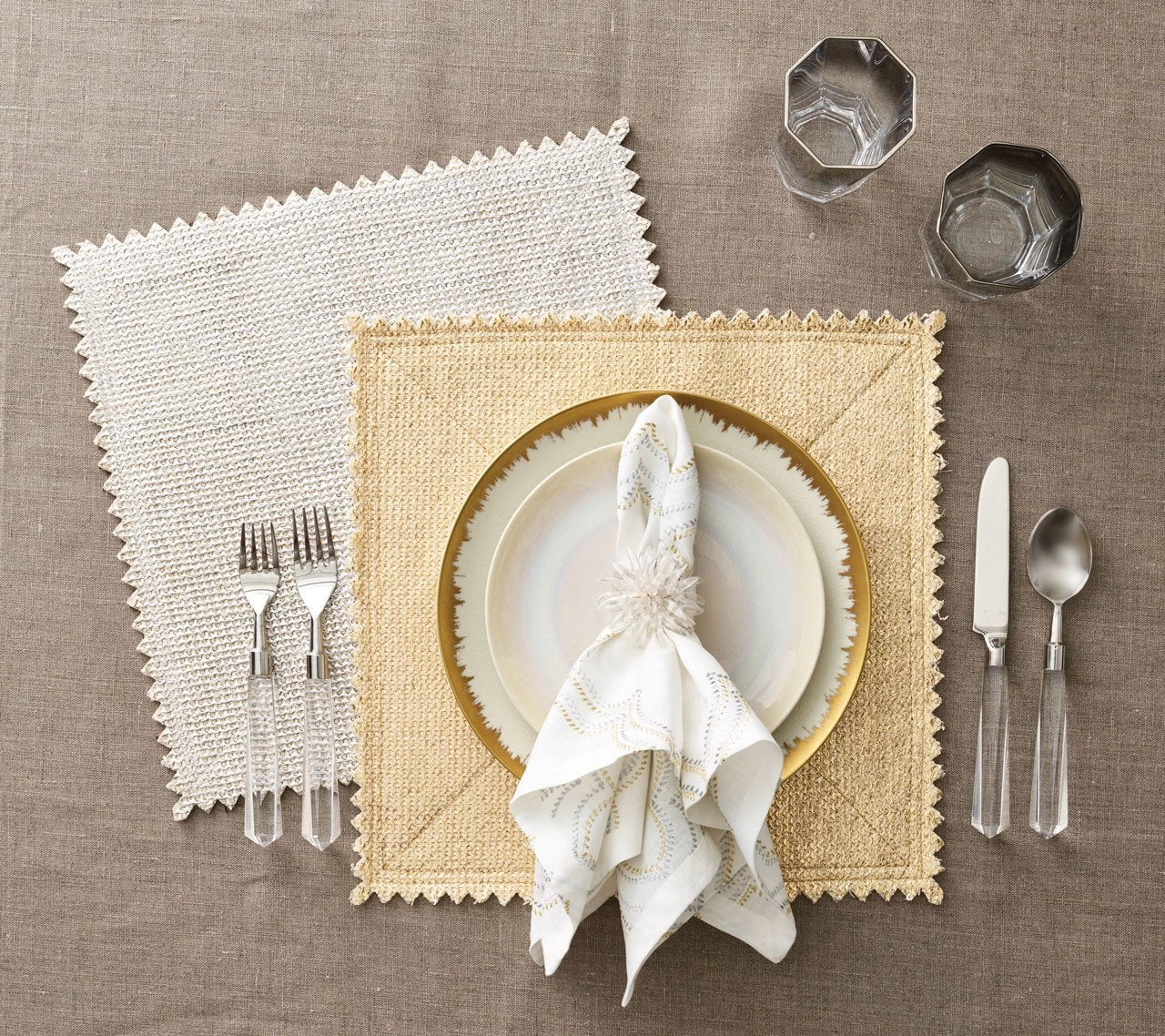 The square Stamped Reverse Placemats in gold and silver boast a luxurious woven texture. Complete with a geometric border, this square placemat offers a gold woven surface on one side and a silver woven surface on the reverse. Perfect for adding a bit of glam to everyday dining or complementing a glamorous affair, these gold and silver square placemats are incredibly versatile and easy to clean with the wipe of a damp cloth.