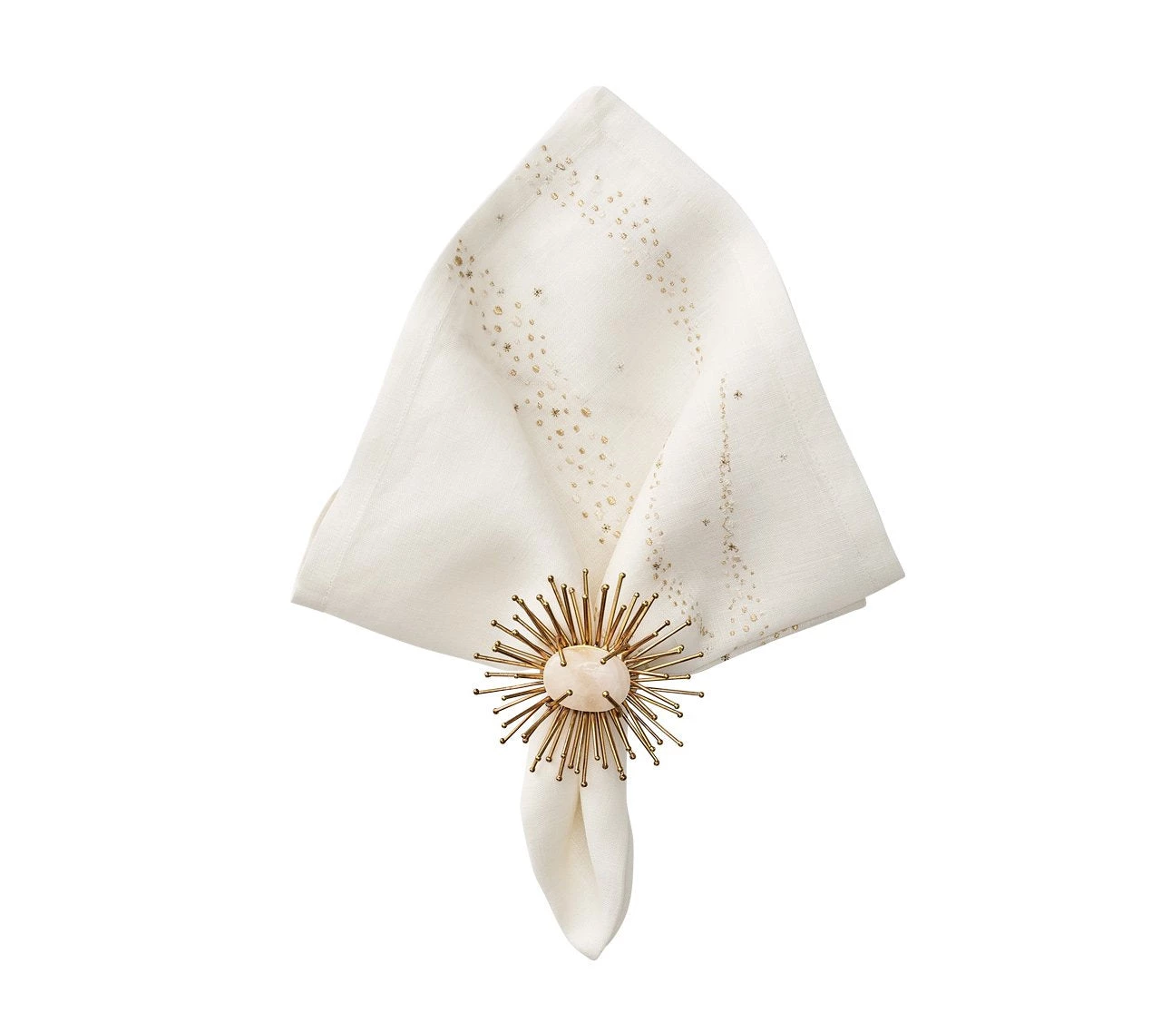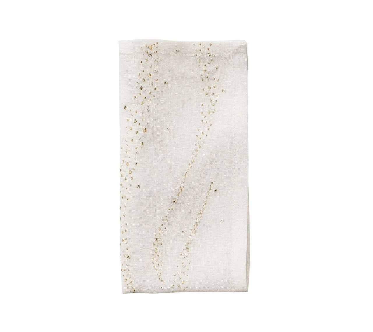 Specks of gold, beige, gray, and silver dot the crisp, white Star Spray Napkin like an enchanted wintery scene. The delicately embroidered dots mimic a spray of glitter on the white linen backdrop. Perfect for a casual dinner or lively celebration, the subtle elegance of this embroidered napkin will elevate any table.