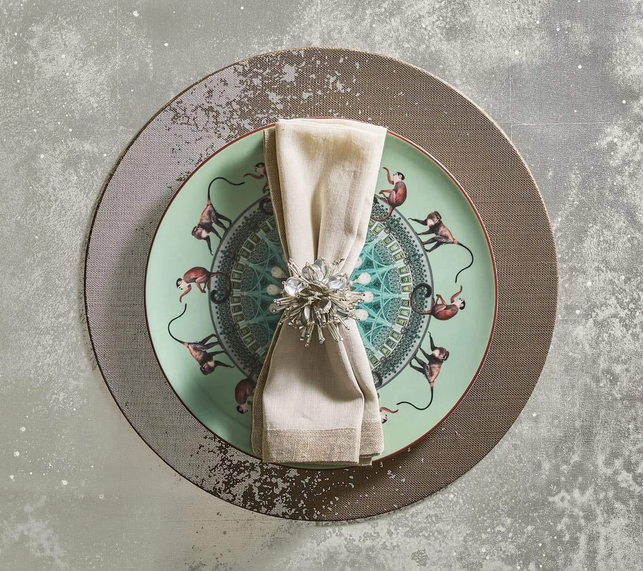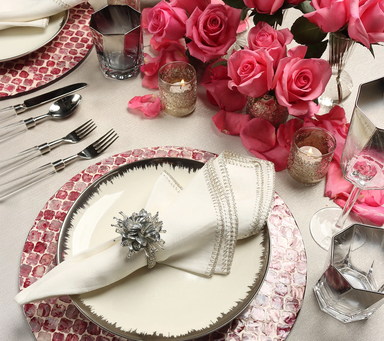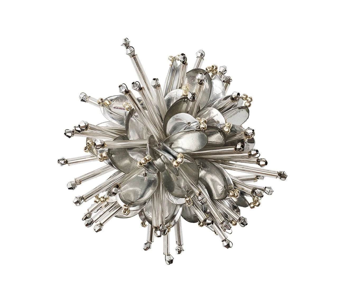 The silver Starburst Napkin Ring is inspired by the brilliant point of light emitted by the burst of a supernova. These radiant silver beaded napkin rings effortlessly lighten and brighten a table. These glistening metallic silver napkin rings will add a spark to any table.